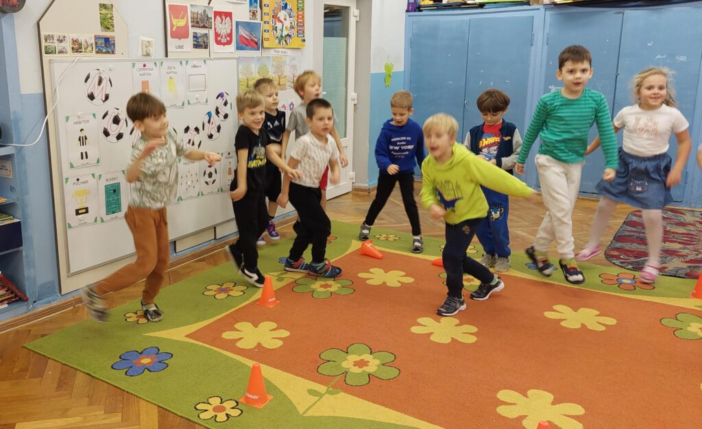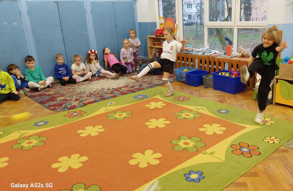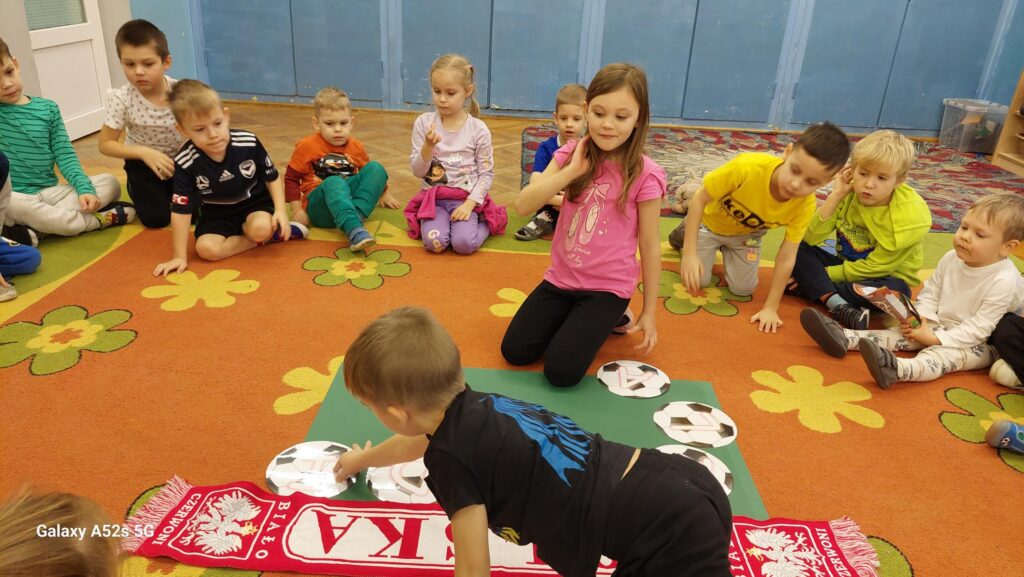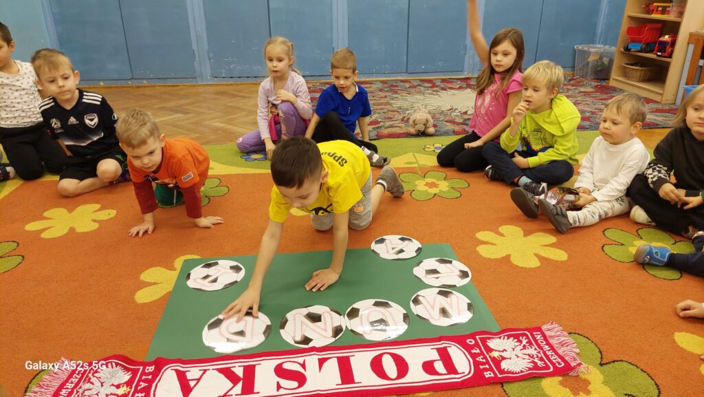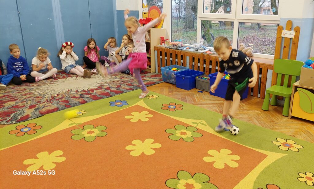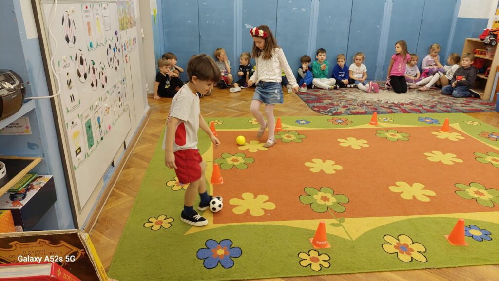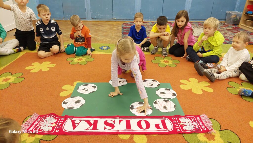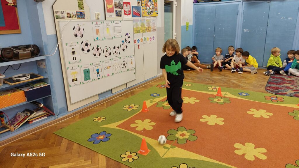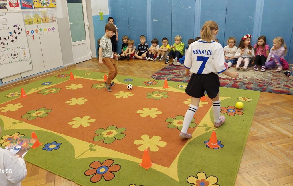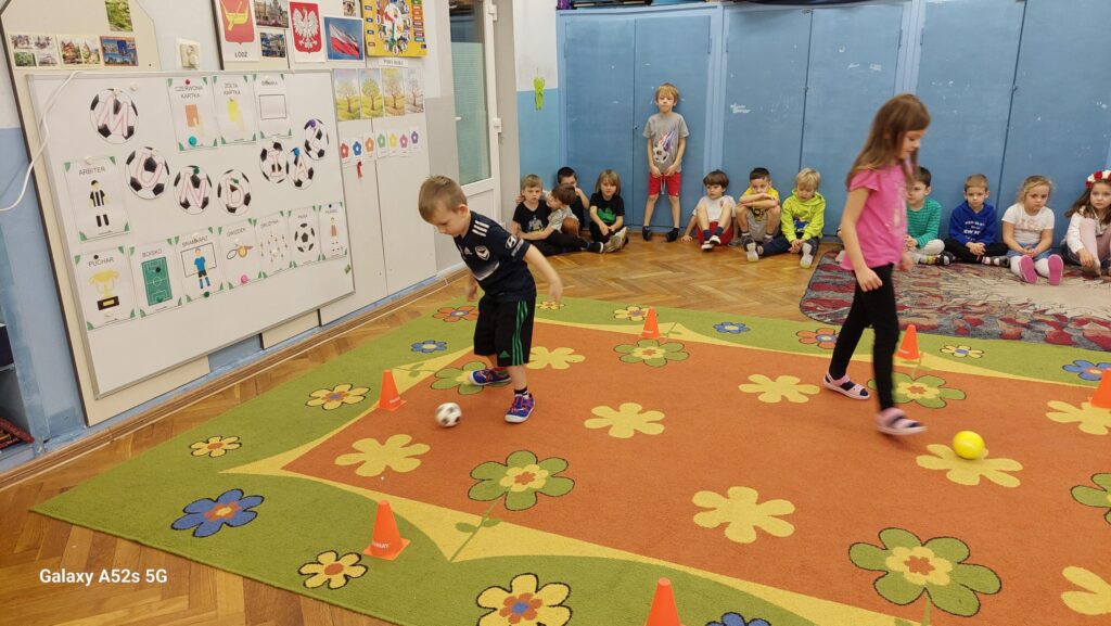Rozległ się dźwięk gwizdka i przystąpiliśmy do piłkarskiej rozgrzewki. Nie było łatwo ale z uśmiechem na twarzy wykonywaliśmy polecenia „trenera”. Następnie ćwiczyliśmy szybkość, zwinność i trafienia do celu. Po zabawach ruchowych rozmawialiśmy o zasadach gry w piłkę nożną. Wyjaśnialiśmy co oznaczają określone pojęcia, np. rzut karny, spalony oraz dyskutowaliśmy na temat roli poszczególnych piłkarzy na boisku. Na zakończenie naszych zabaw zaprojektowaliśmy własne, wymarzone stroje piłkarskie. Okazało się, że wśród nas jest wielu kibiców a być może i przyszłych gwiazd futbolu.