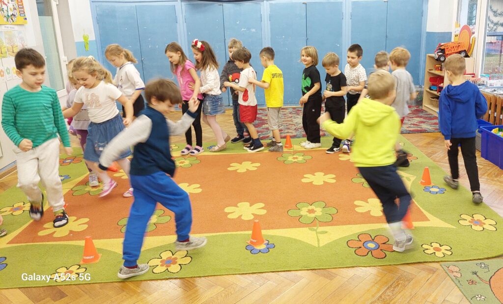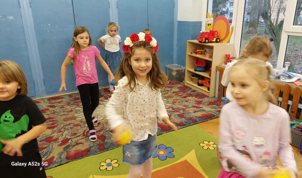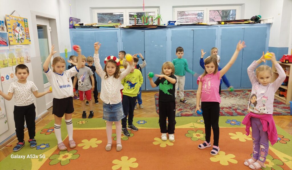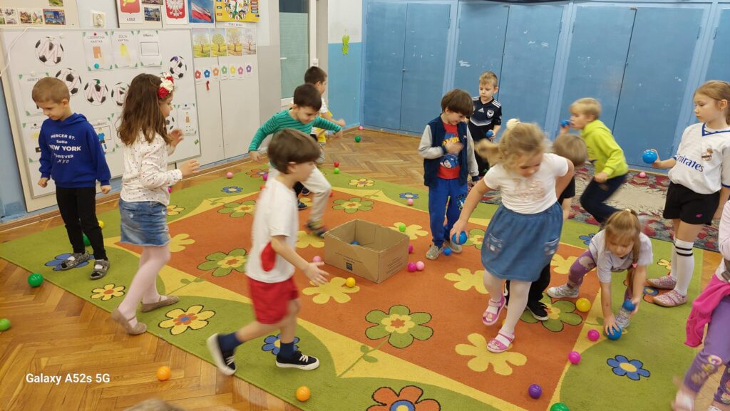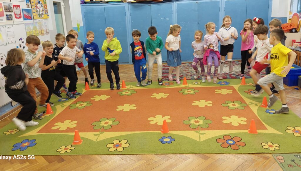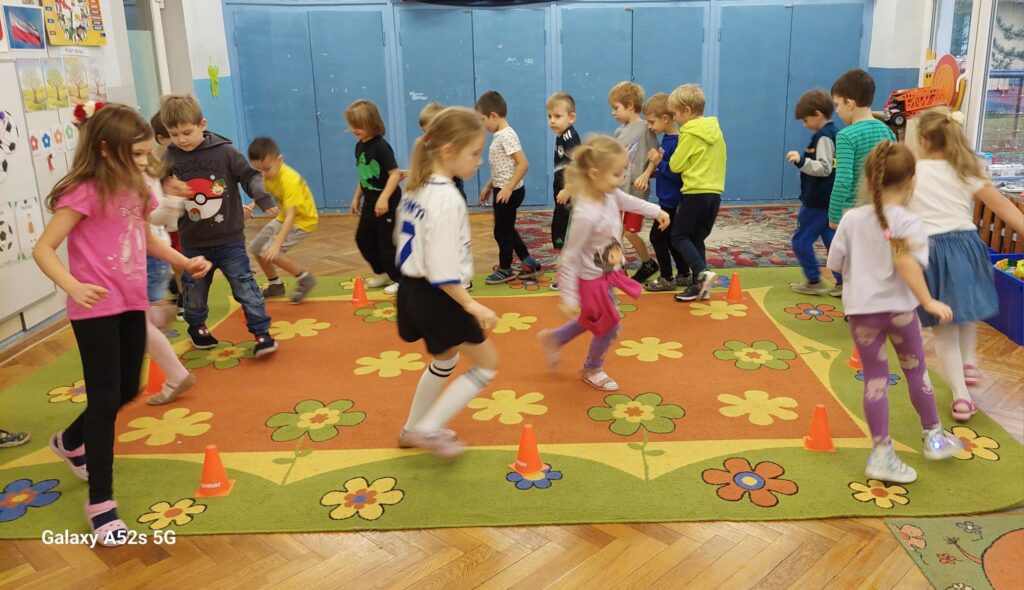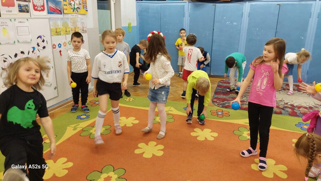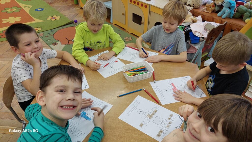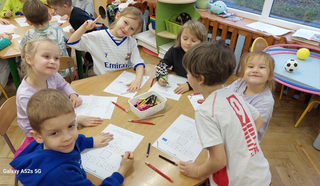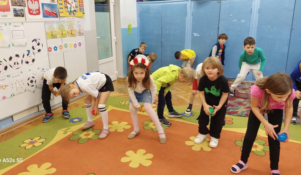 Rozległ się dźwięk gwizdka i przystąpiliśmy do piłkarskiej rozgrzewki. Nie było łatwo ale z uśmiechem na twarzy wykonywaliśmy polecenia „trenera”. Następnie ćwiczyliśmy szybkość, zwinność i trafienia do celu. Po zabawach ruchowych rozmawialiśmy o zasadach gry w piłkę nożną. Wyjaśnialiśmy co oznaczają określone pojęcia, np. rzut karny, spalony oraz dyskutowaliśmy na temat roli poszczególnych piłkarzy na boisku. Na zakończenie naszych zabaw zaprojektowaliśmy własne, wymarzone stroje piłkarskie. Okazało się, że wśród nas jest wielu kibiców a być może i przyszłych gwiazd futbolu.