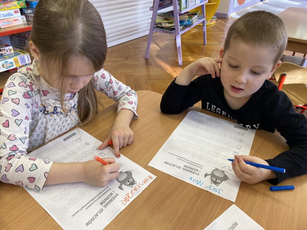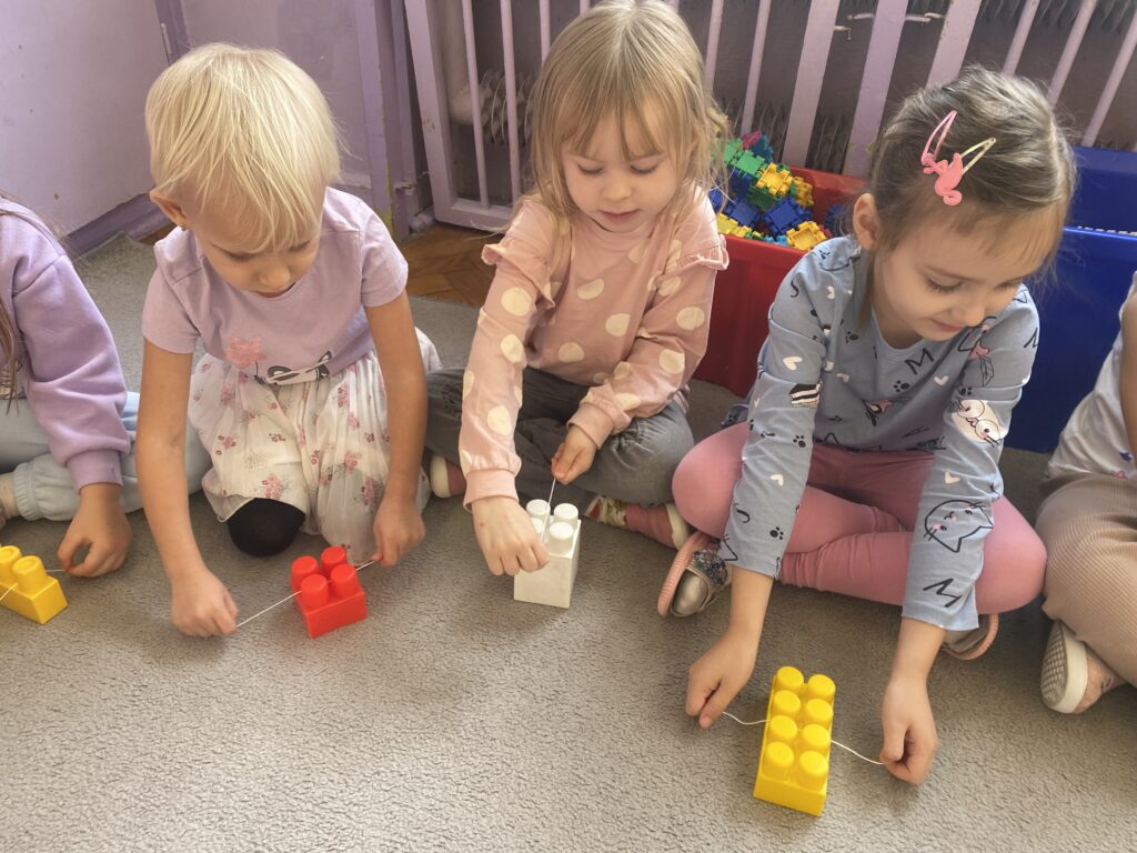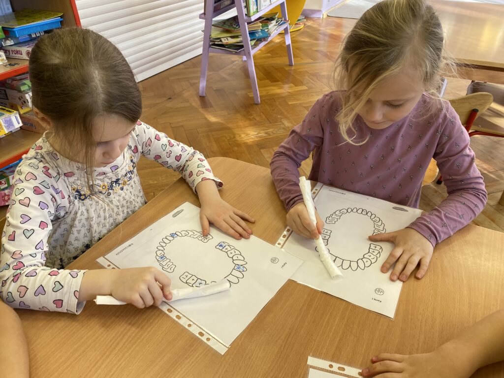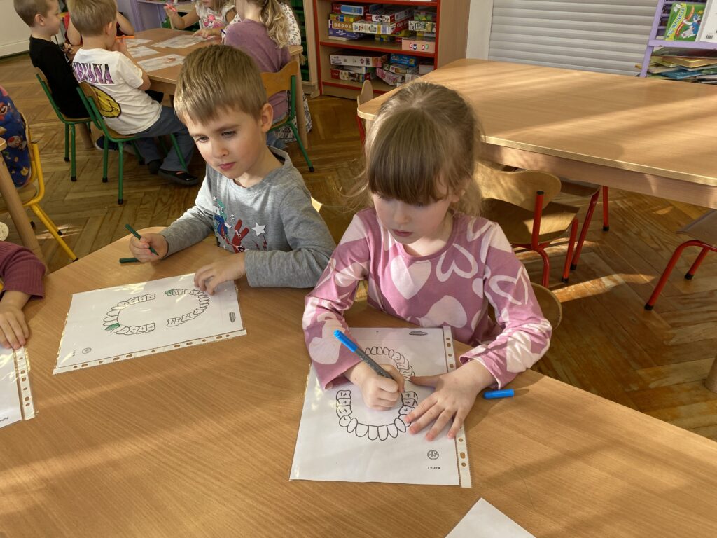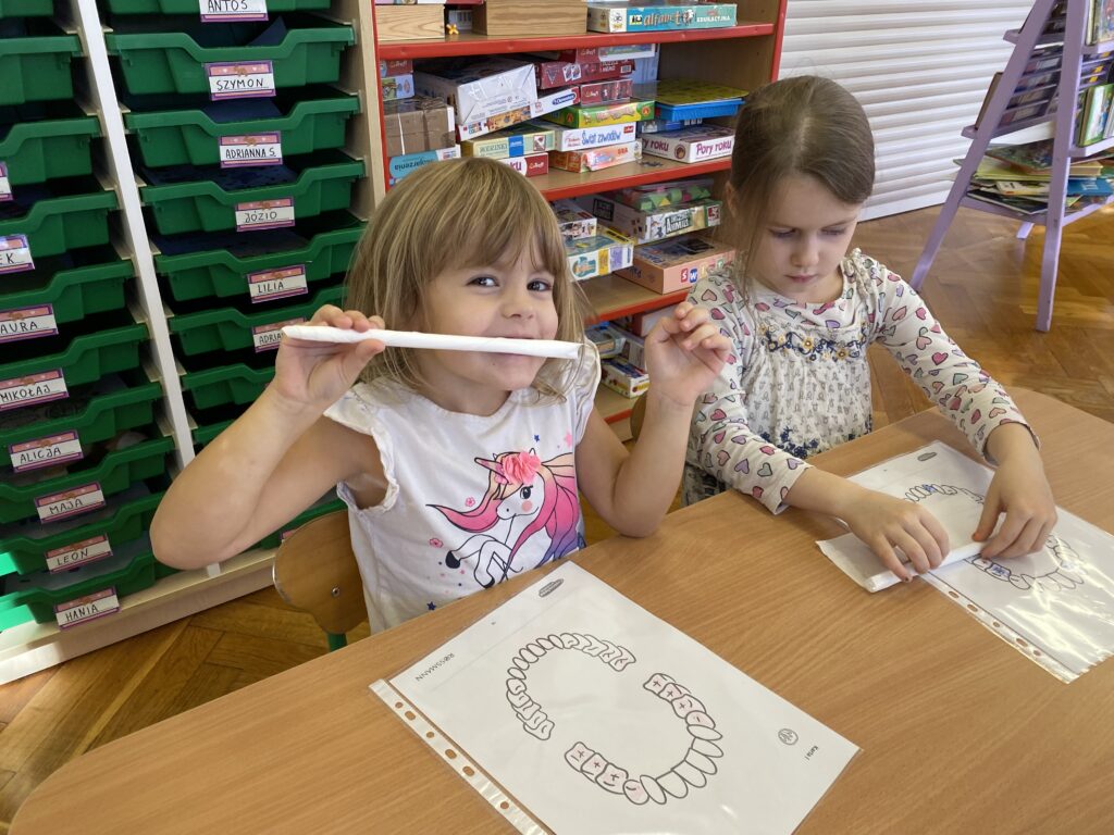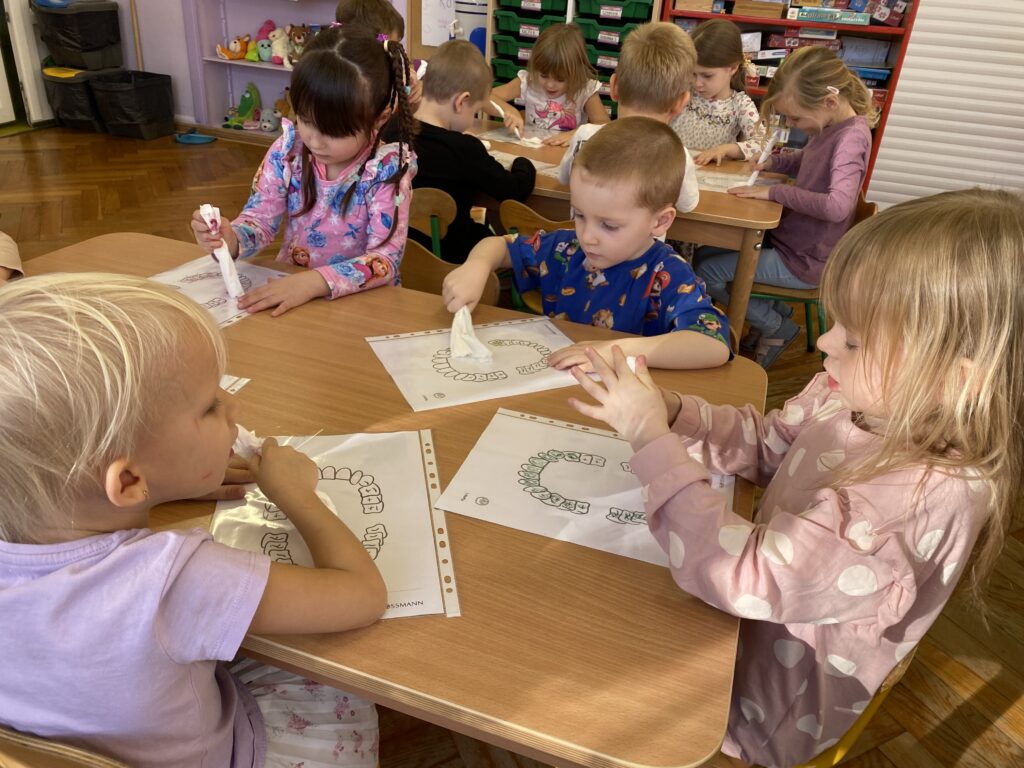 Podczas tej lekcji w Akademii Czyściochowa grupa Zajączków uczyła się nitkować zęby. Za pomocą klocków, plasteliny oraz nitek dzieci uczyły się nitkować. Sprawdzaliśmy również, jak szybko pojawiają się ząbiaki na zębach i jak ciężko je z nich usunąć. Poznaliśmy kolejny wierszyk przypominający o regularnym myciu zębów.