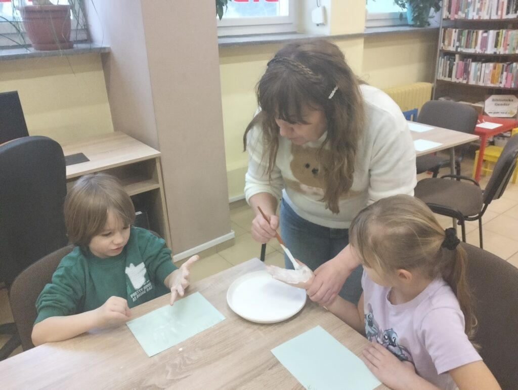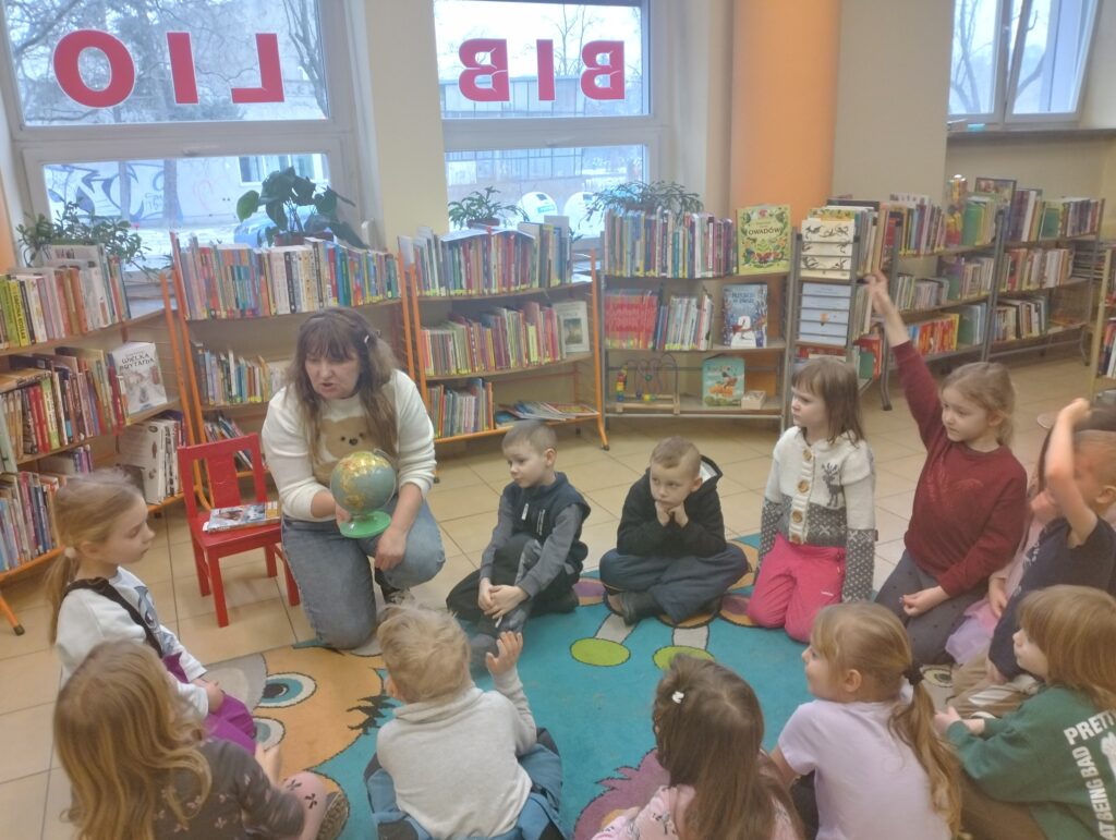 Podczas wizyty w bibliotece mieliśmy okazję wyruszyć w niezwykłą podróż na daleką Północ i poznać fascynujące ciekawostki o niedźwiedziu polarnym. Spotkanie rozpoczęło się od wspólnego oglądania książki o Neli Podróżniczce, z której dowiedzieliśmy się, gdzie żyją te wyjątkowe zwierzęta. Poznaliśmy również ciekawostki o niedźwiedziu polarnym, że jest jednym z największych lądowych drapieżników na świecie, że mimo białego futra jego skóra jest czarna, a gruba warstwa tłuszczu chroni go przed zimnem. O tym przekonaliśmy się na własnej skórze wykonując doświadczenie. Dowiedzieliśmy się także, że niedźwiedzie polarne świetnie pływają i potrafią pokonywać bardzo długie dystanse w lodowatej wodzie.