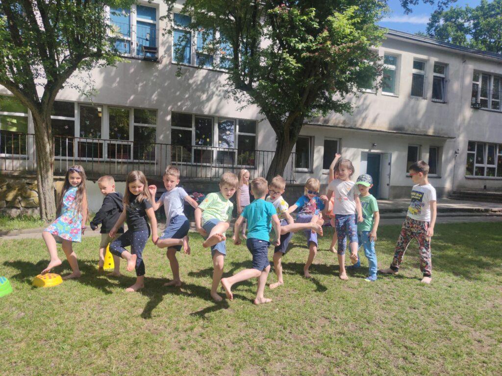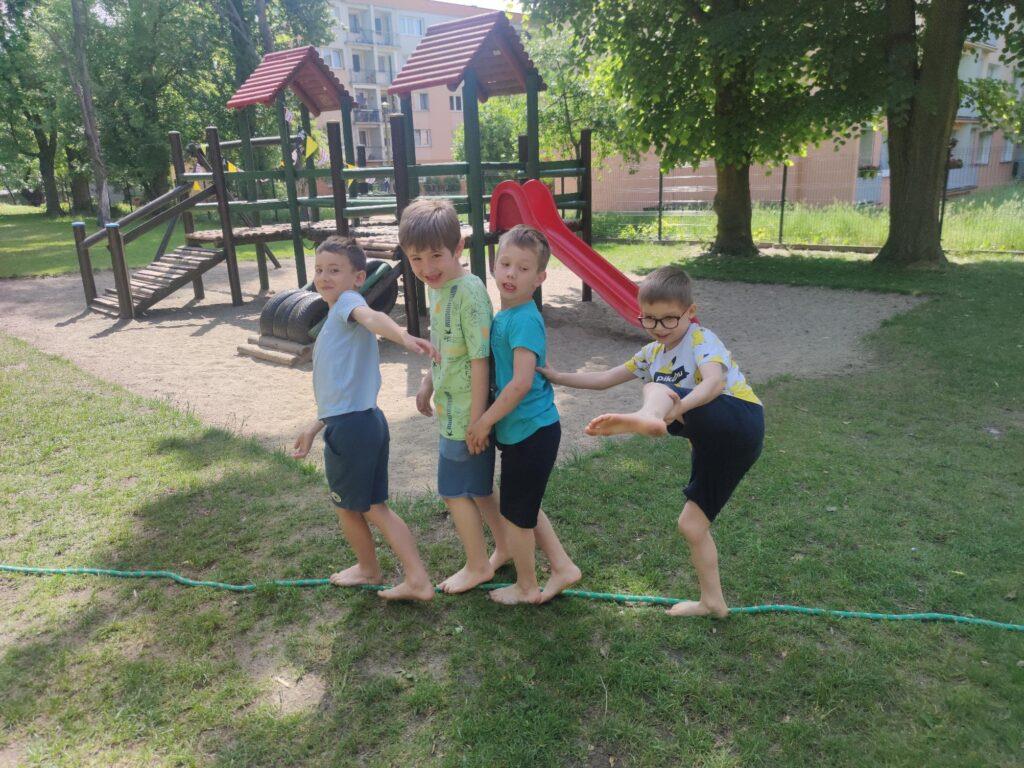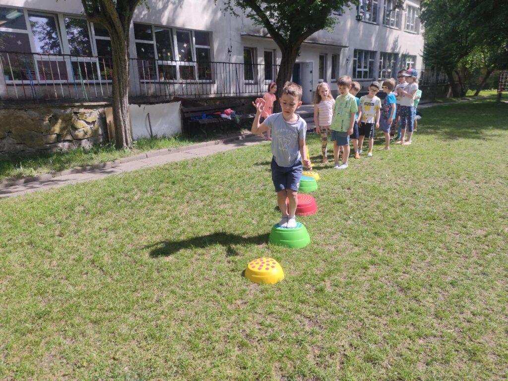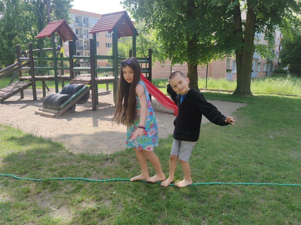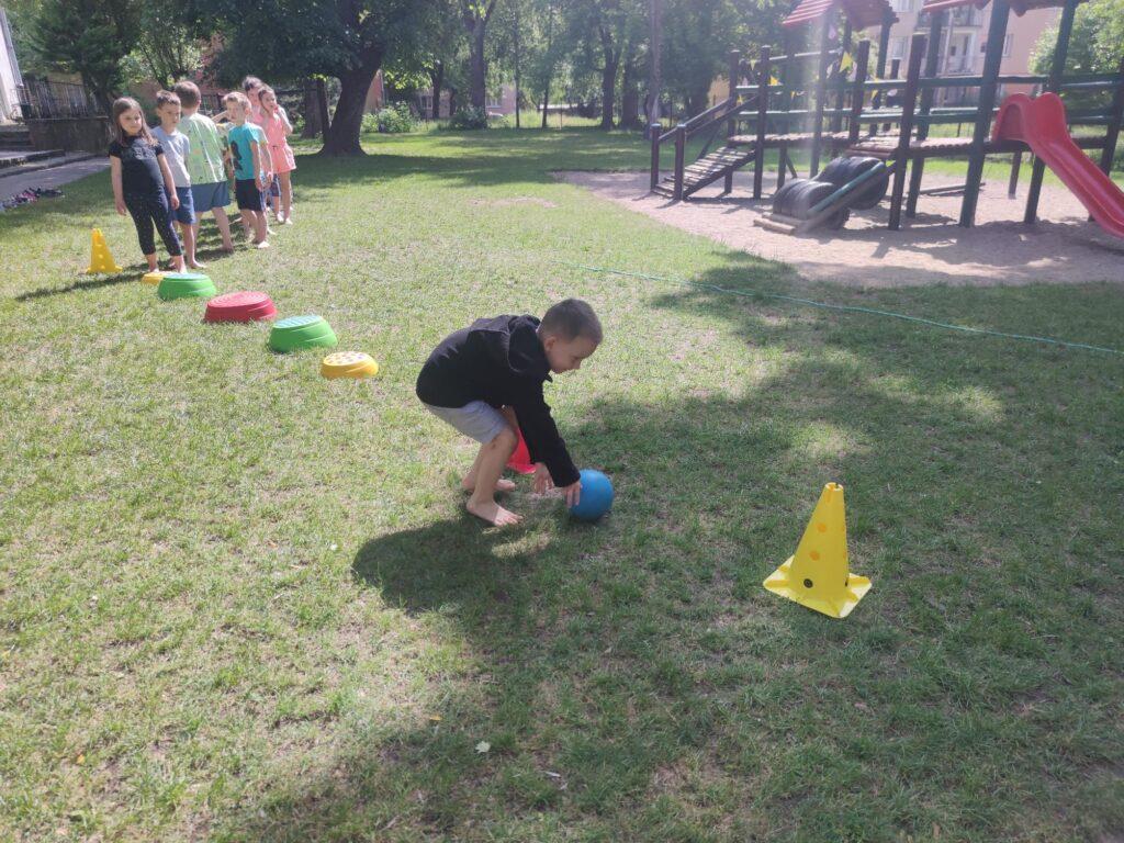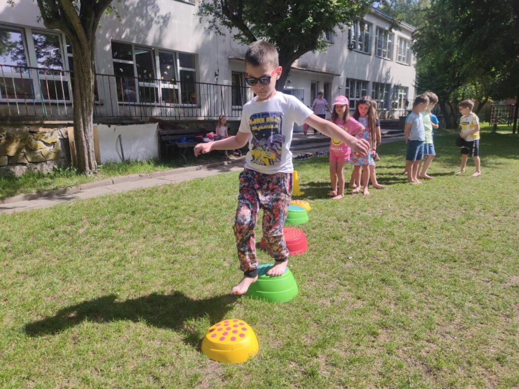 Kiedy wyjdzie słońce chce się jakoś więcej… My postanowiliśmy zrealizować zadanie pt. ,,Boso przez świat” w ogródku, przechodząc bosymi stopami tor przeszkód 🙂