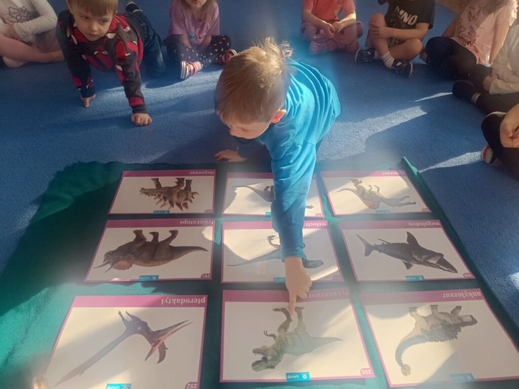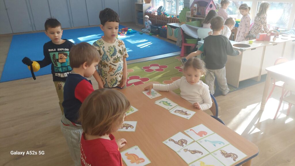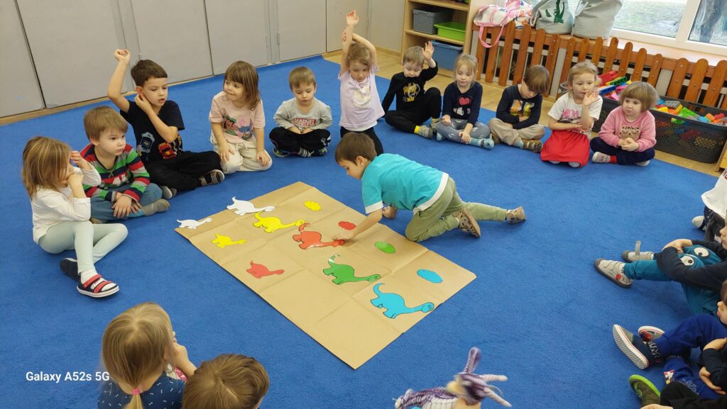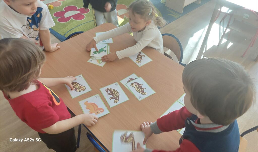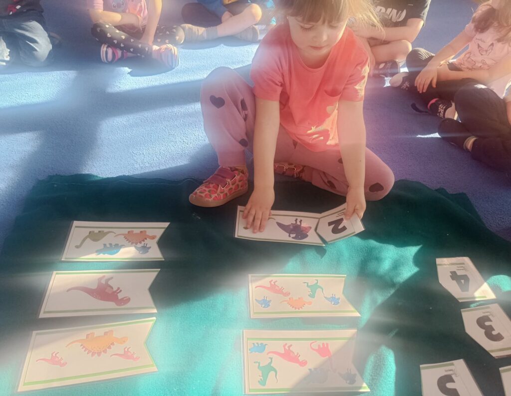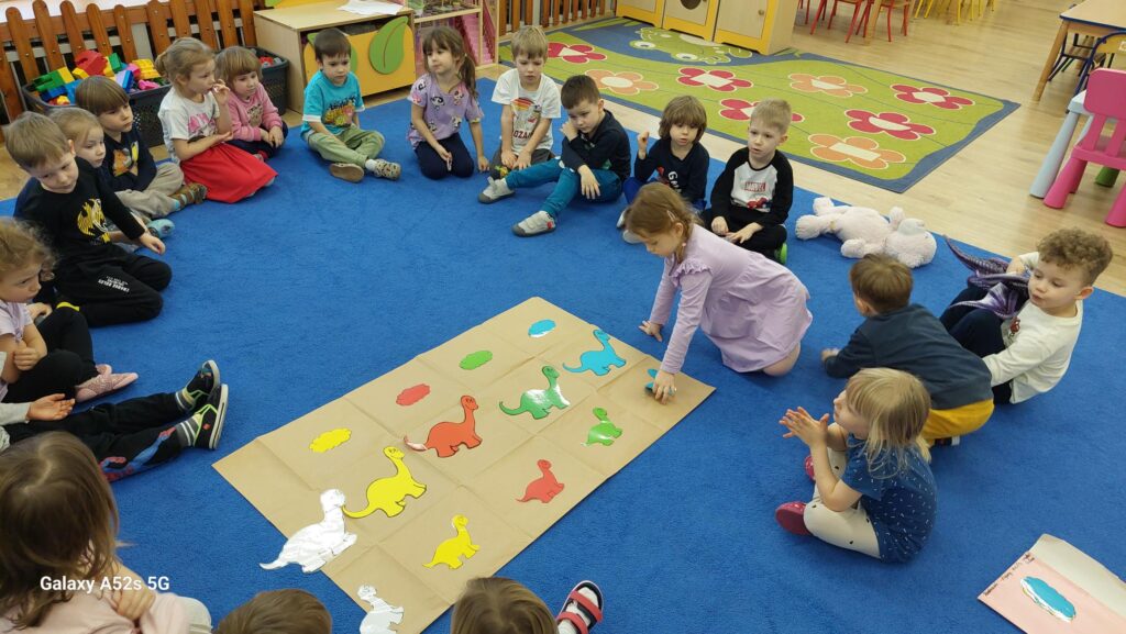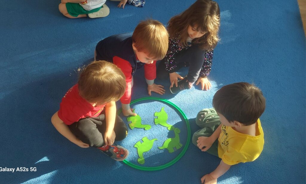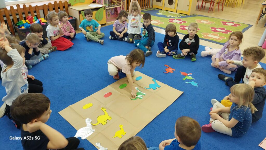 W trakcie zajęć dzieci rozwijały umiejętności liczenia, klasyfikowania oraz współpracy w grupie. Na zakończenie dnia wysłuchały opowiadania o dinozaurach i podzieliły się swoimi wrażeniami.