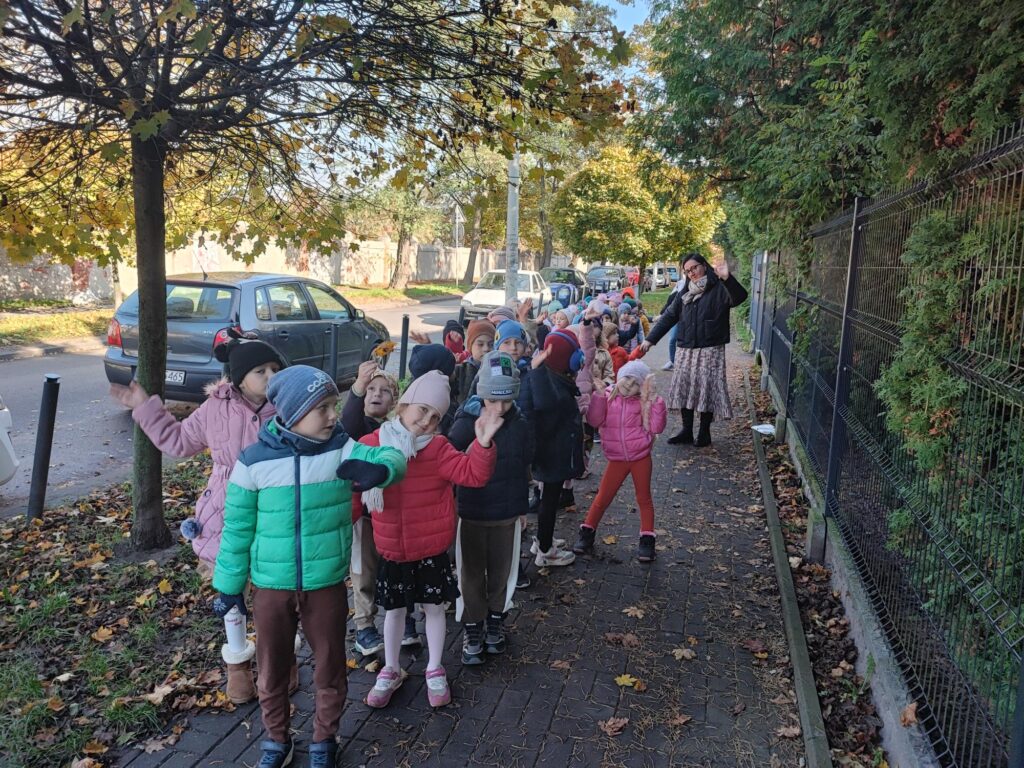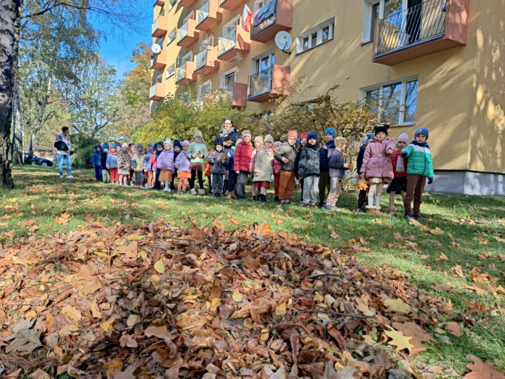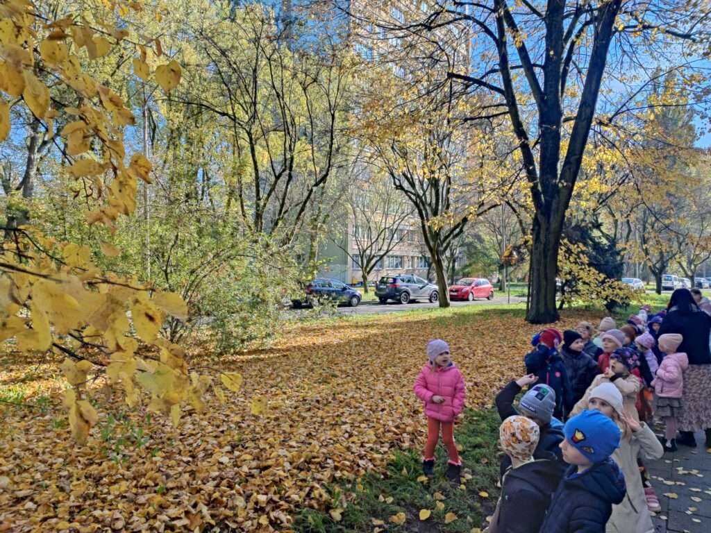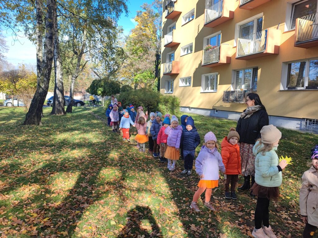 23. października odbył się w naszym przedszkolu Bal Jesieni. Pogoda tego dnia była wspaniała, zatem wybraliśmy się na wspólny jesienny spacer po najbliższej okolicy. Podczas naszej wędrówki poszukiwaliśmy zwierząt szykujących się do zimy oraz zmian w przyrodzie charakterystycznych dla bieżącej pory roku. Udało nam się znaleźć wielkie kopce liści, w których schronienie mogą znaleźć sobie jeże, oglądaliśmy również dywan z kolorowych liści, a także chroniliśmy się pod drzewnym parasolem. Odwiedziliśmy również pobliski pomnik przyrody, jakim jest olbrzymi kasztanowiec znajdujący się niedaleko naszego przedszkola. Udało nam się zebrać tam bardzo dużo kasztanów i liści. Spotkaliśmy również zwierzęta: małą biedronkę oraz konika polnego.