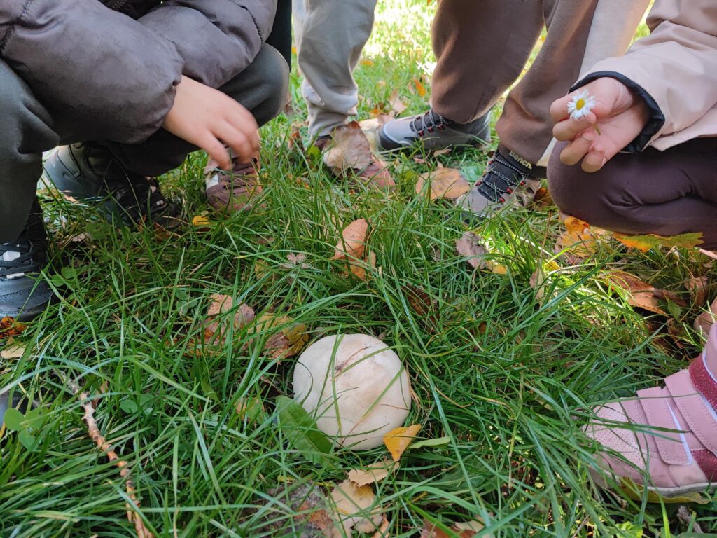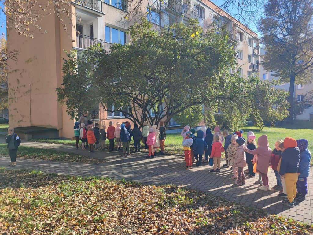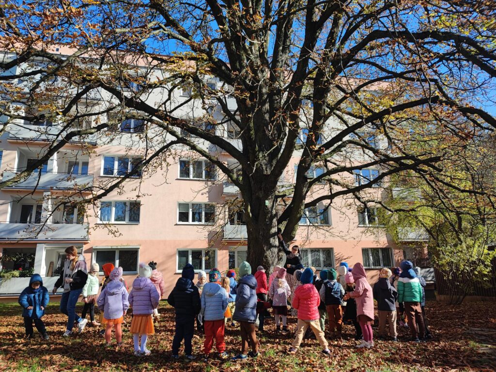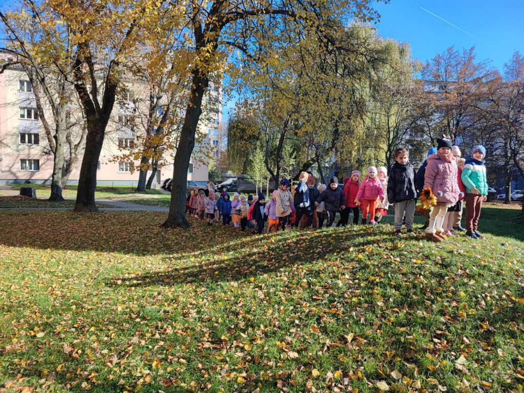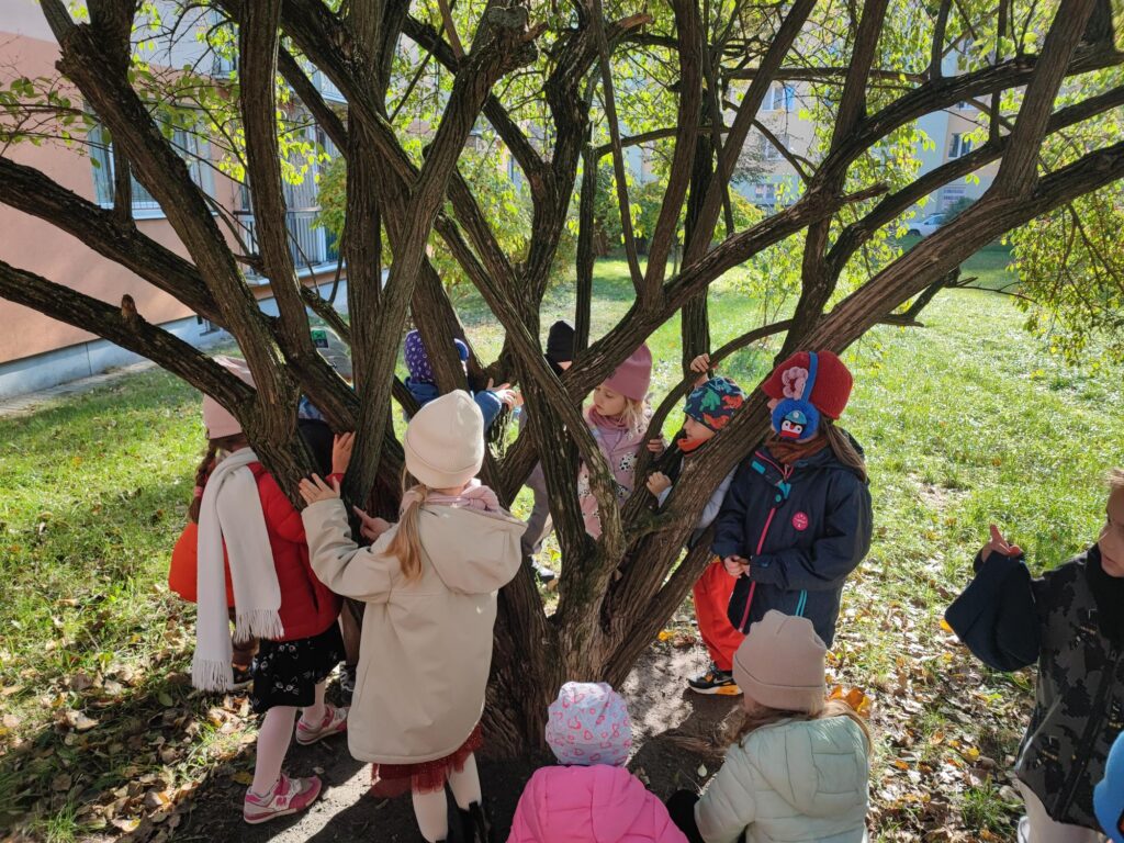 23. października odbył się w naszym przedszkolu Bal Jesieni. Pogoda tego dnia była wspaniała, zatem wybraliśmy się na wspólny jesienny spacer po najbliższej okolicy. Podczas naszej wędrówki poszukiwaliśmy zwierząt szykujących się do zimy oraz zmian w przyrodzie charakterystycznych dla bieżącej pory roku. Udało nam się znaleźć wielkie kopce liści, w których schronienie mogą znaleźć sobie jeże, oglądaliśmy również dywan z kolorowych liści, a także chroniliśmy się pod drzewnym parasolem. Odwiedziliśmy również pobliski pomnik przyrody, jakim jest olbrzymi kasztanowiec znajdujący się niedaleko naszego przedszkola. Udało nam się zebrać tam bardzo dużo kasztanów i liści. Spotkaliśmy również zwierzęta: małą biedronkę oraz konika polnego.