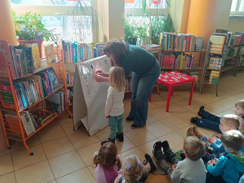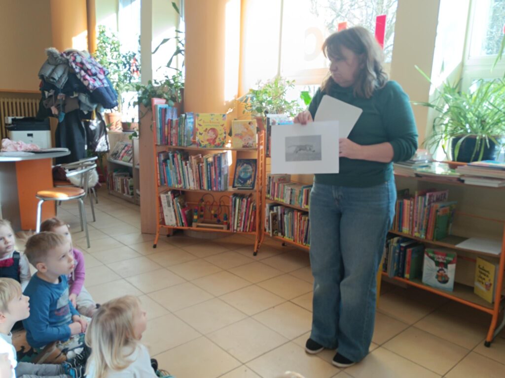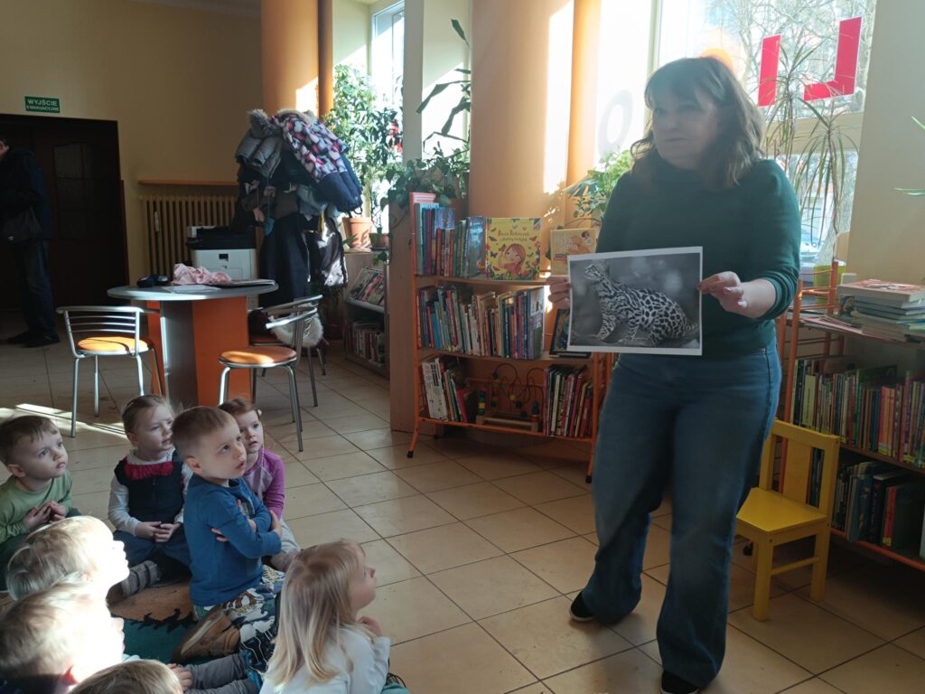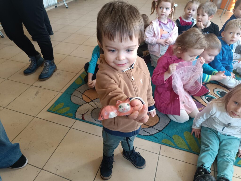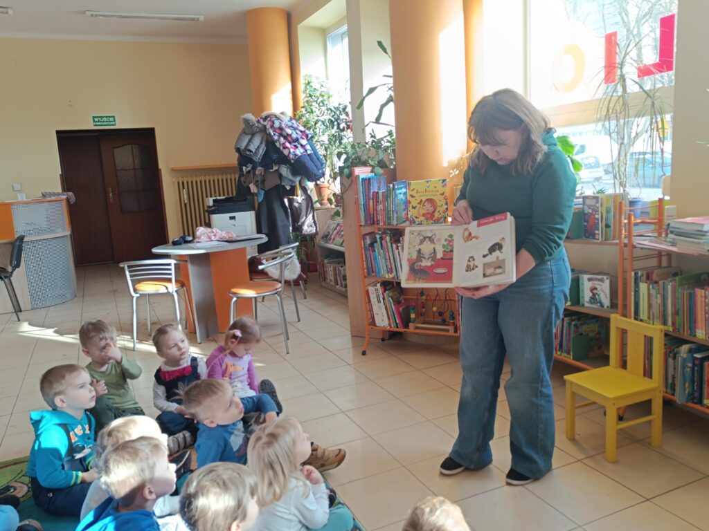 W piątek 21 lutego wybraliśmy się do zaprzyjaźnionej już biblioteki na zajęcia z okazji światowego dnia kota. Wspólnie wysłuchaliśmy utworu o przecudnych choć trochę niesfornych trzech kotkach. Dzieci zapoznały się z kocimi obyczajami oraz sposobem pielęgnacji i opieki jakiej wymagają. Następnie poszukiwaliśmy kotków, które były pochowane pomiędzy książkami. Przeliczaliśmy i określaliśmy wielkości różnych kotków. Oglądaliśmy książeczki o naszych tajemniczych zwierzątkach. Na pożegnanie otrzymaliśmy kolorowankę, którą zabraliśmy do przedszkola.