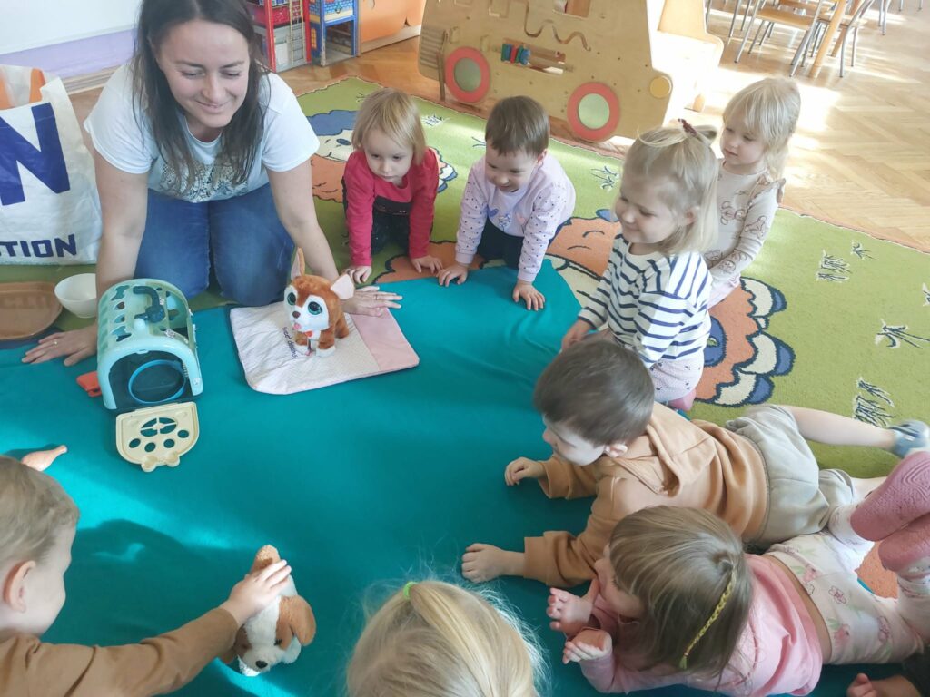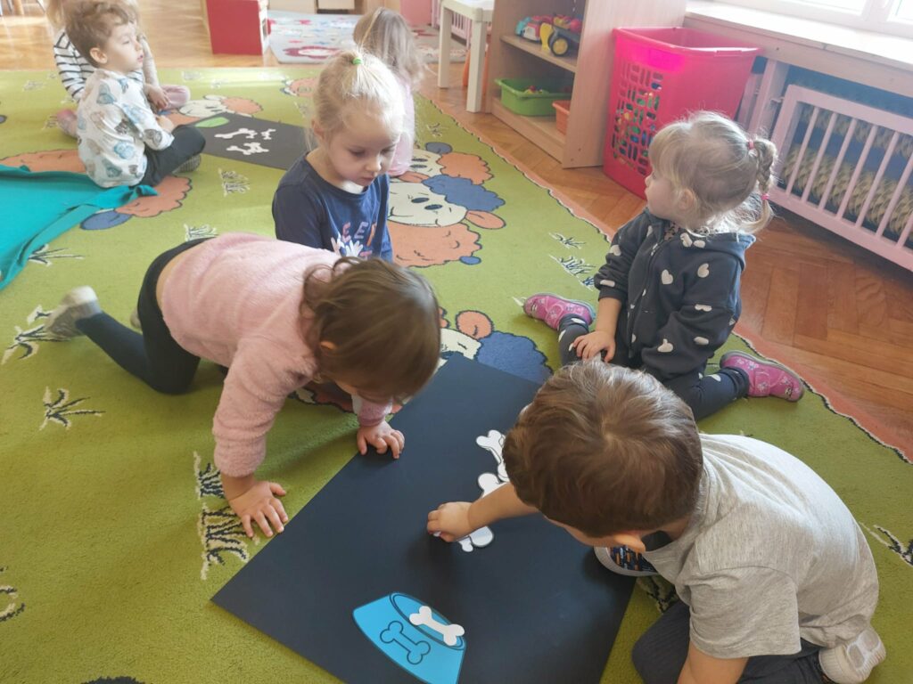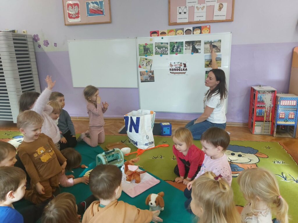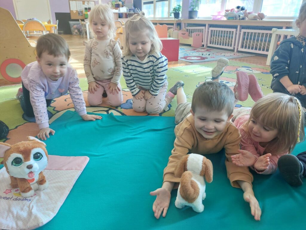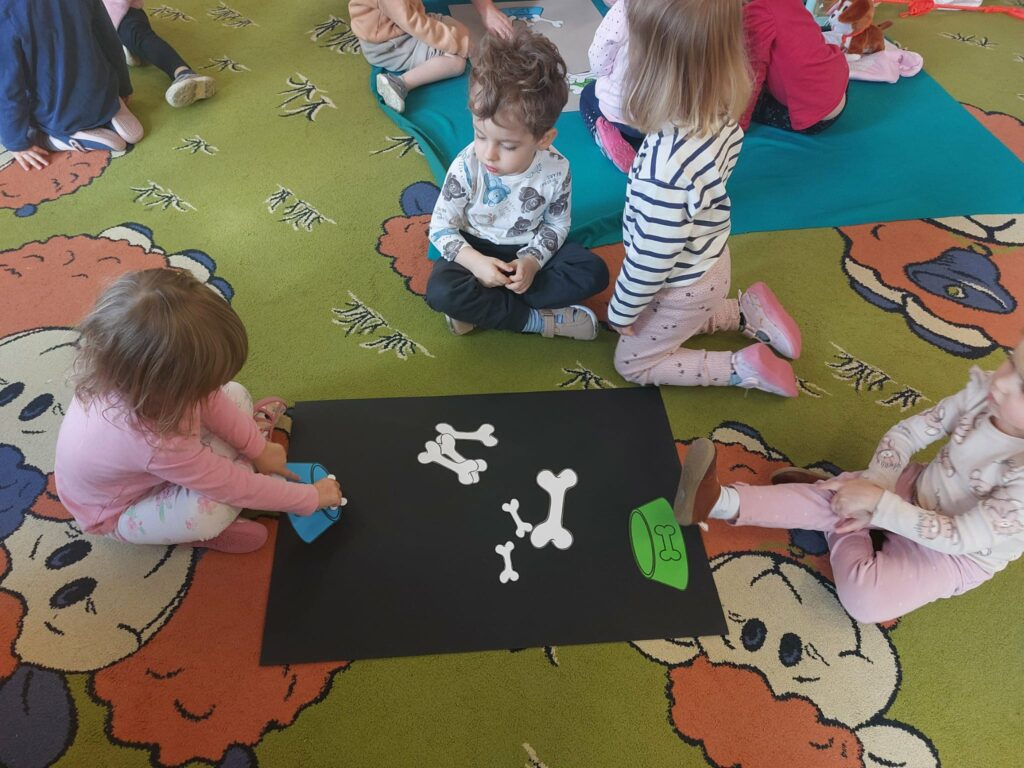 Pod koniec października obchodziliśmy w grupie Dzień Kundelka. Dzieci uczestniczyły w zajęciach edukacyjnych, podczas których dowiedziały się, że posiadanie pieska to nie tylko przyjemności i zabawa, ale przede wszystkim obowiązki. Dzieci opowiadały o swoich pieskach, bawiły się zabawkowymi pieskami, liczyły kości, porównywały wielkość piesków. Przedszkolaki zgłębiły wiadomości na temat wyglądu psa, jego pielęgnacji oraz żywienia.
