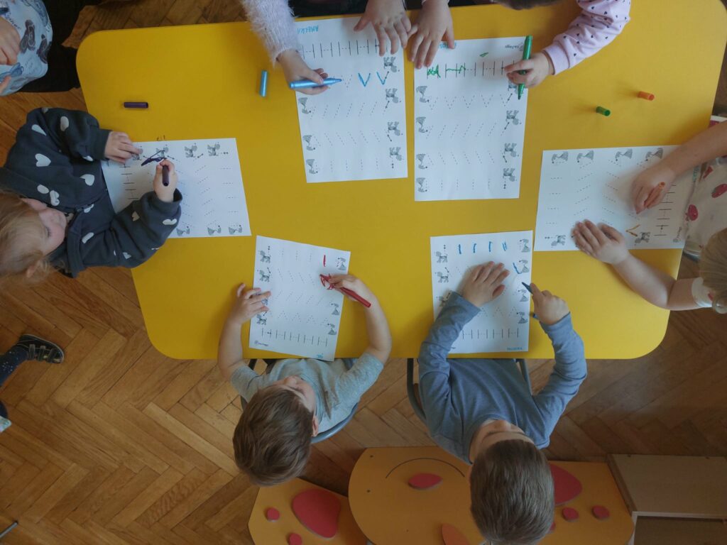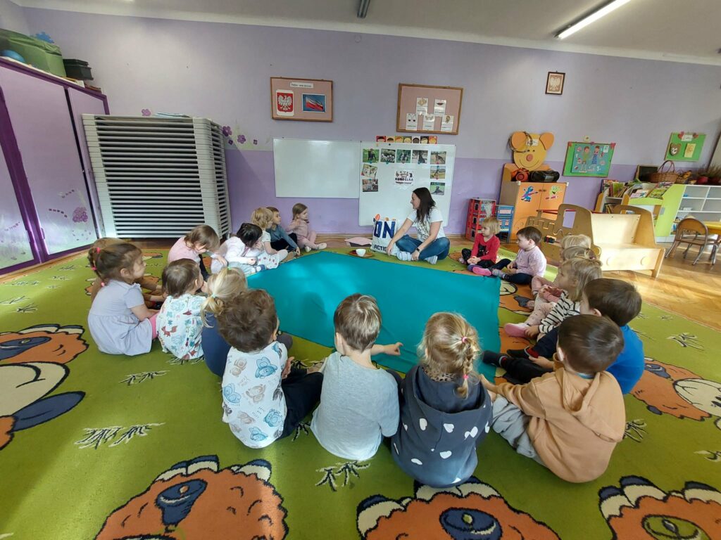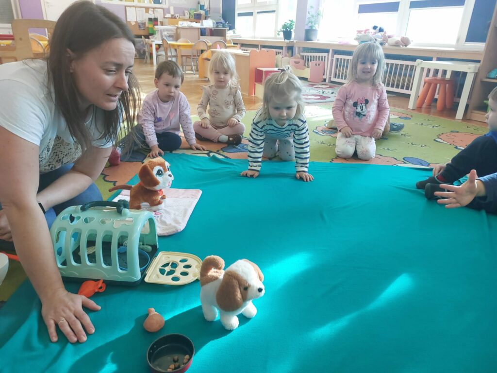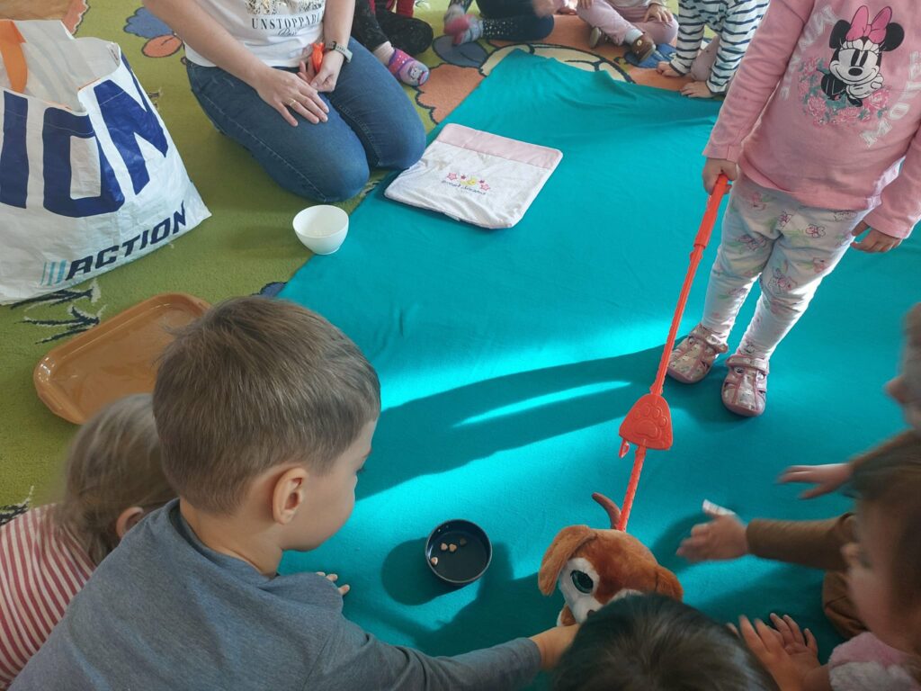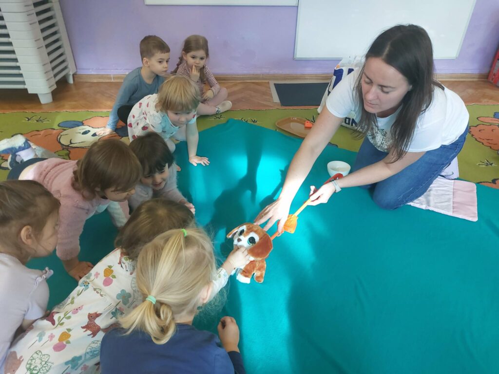 Pod koniec października obchodziliśmy w grupie Dzień Kundelka. Dzieci uczestniczyły w zajęciach edukacyjnych, podczas których dowiedziały się, że posiadanie pieska to nie tylko przyjemności i zabawa, ale przede wszystkim obowiązki. Dzieci opowiadały o swoich pieskach, bawiły się zabawkowymi pieskami, liczyły kości, porównywały wielkość piesków. Przedszkolaki zgłębiły wiadomości na temat wyglądu psa, jego pielęgnacji oraz żywienia.