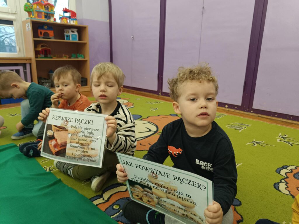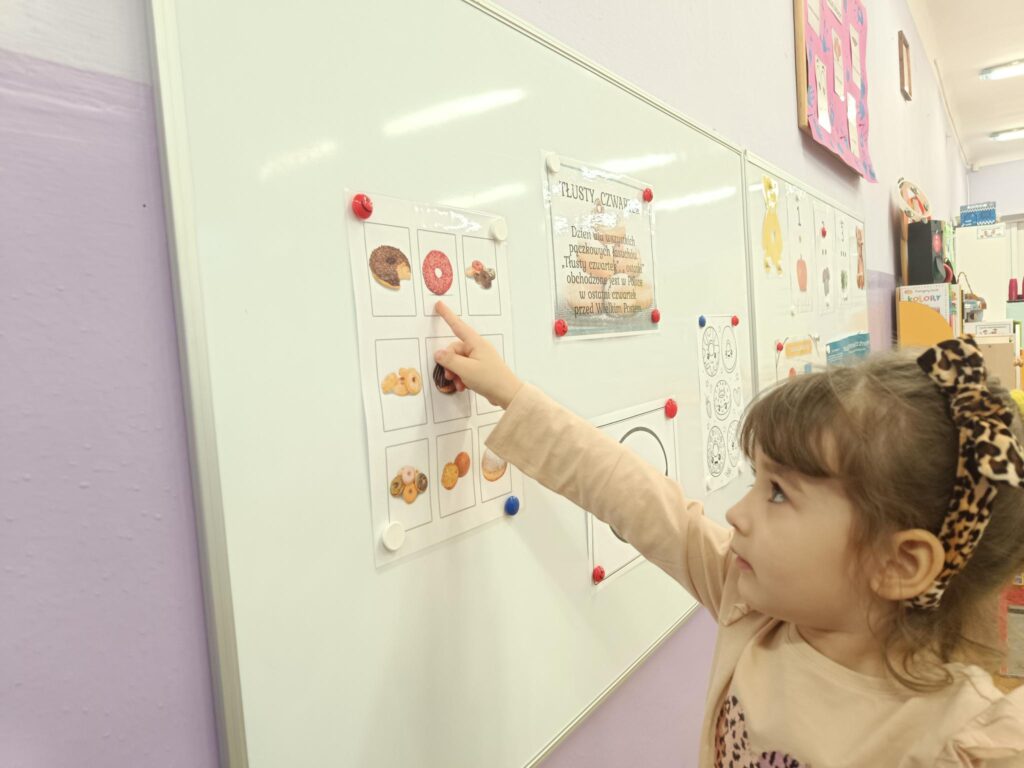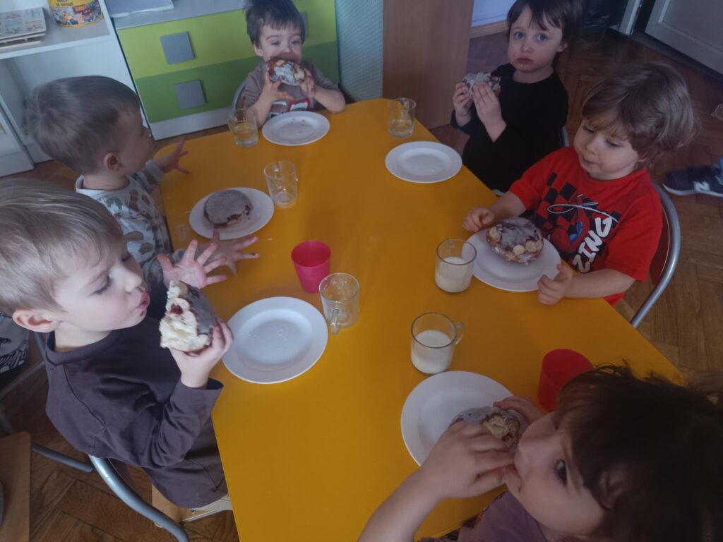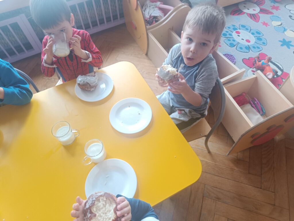 „Powiedział Bartek, że dziś tłusty czwartek, a Bartkowa uwierzyła, dobrych pączków nasmażyła” -mówi staropolskie przysłowie. Tłusty Czwartek -tak, jak każe tradycja, każdy w ten dzień powinien zjeść pączka. Tak też było w naszym przedszkolu. W tłusty czwartek misie z wielkim apetytem oraz uśmiechem na buzi zajadały pączki. Przedszkolaki również zapoznały się ze zwyczajami polskiej tradycji, z historią pączka, z rodzajami pączków. W tym dniu bawiliśmy się w różnorodne „pączkowe” zabawy: ruchowe, matematyczne jak także ozdabialiśmy pączki według własnego pomysłu.