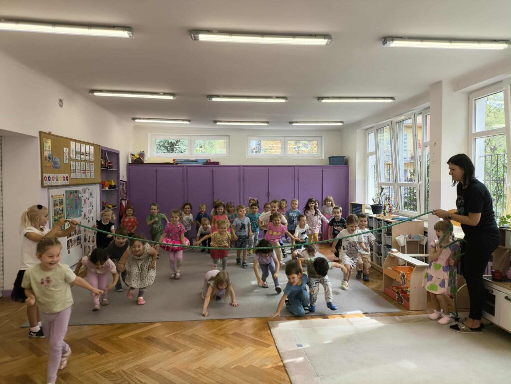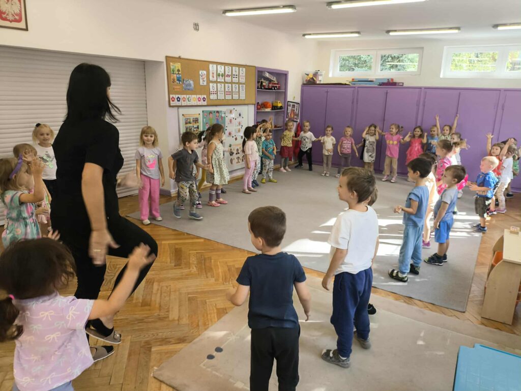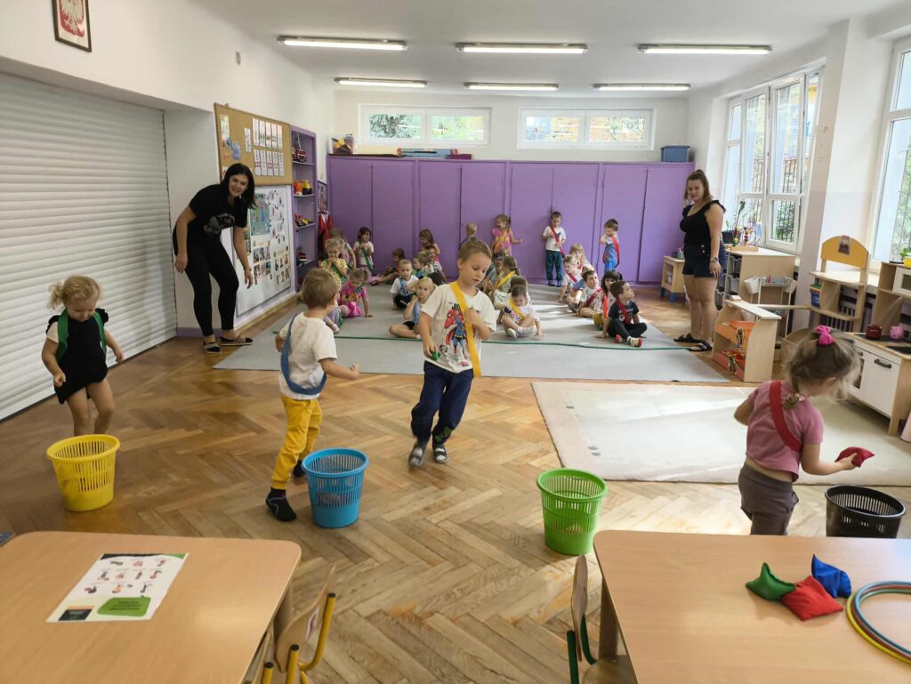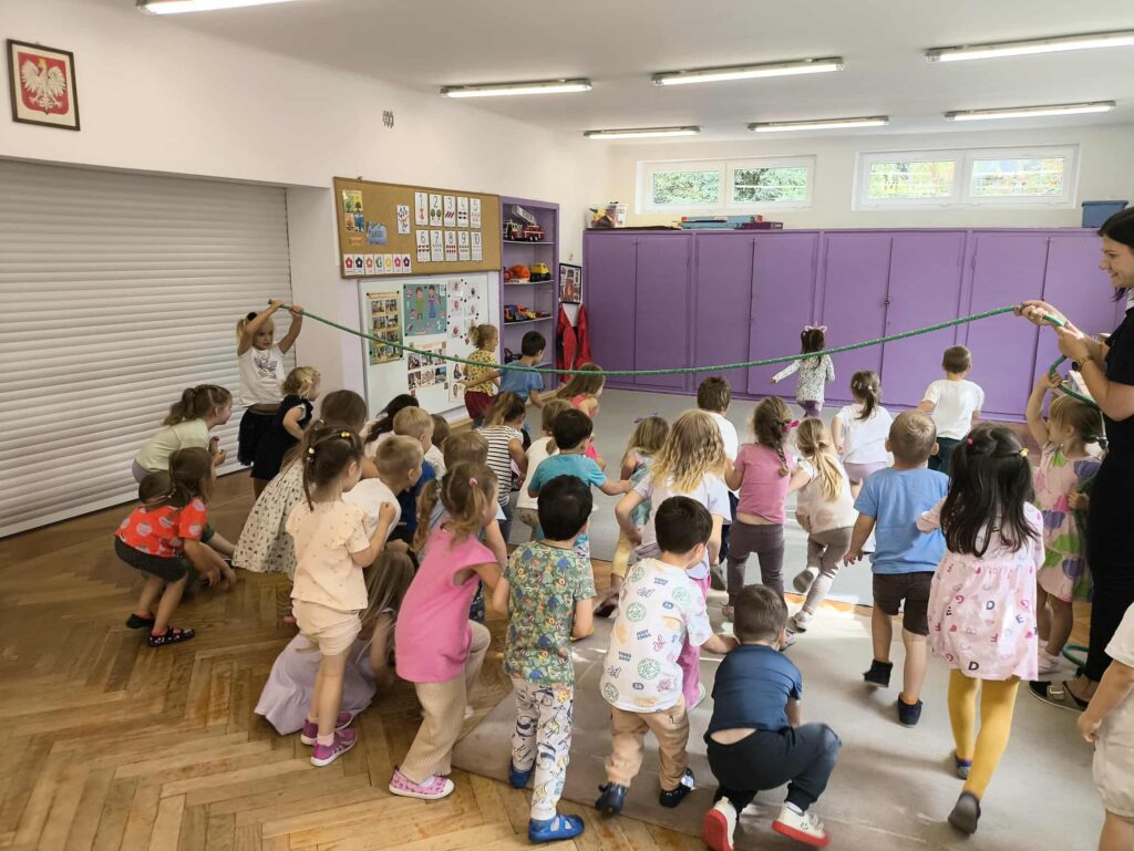Sport to zdrowie, każdy przedszkolak Ci o tym powie! 14 września obchodzimy Narodowy Dzień Sportu. Z tej okazji dzieci z grupy Biedronek i Zajączków spotkały się aby wspólnie celebrować ten dzień. Rozpoczęliśmy od krótkiej rozgrzewki przy której świetnie się bawiliśmy. Następnie zostaliśmy podzieleni na cztery zespoły i rozpoczęliśmy sportowe rywalizacje. Panie przygotowały dla nas konkurencje, które wymagały od nas skupienia oraz szybkości. Na koniec czekał na nas tor przeszkód oraz ulubiona przez przedszkolaków zabawa Limbo. To był bardzo aktywny i wesoły dzień 🙂 Joanna Owczarek Dagmara Rogóż