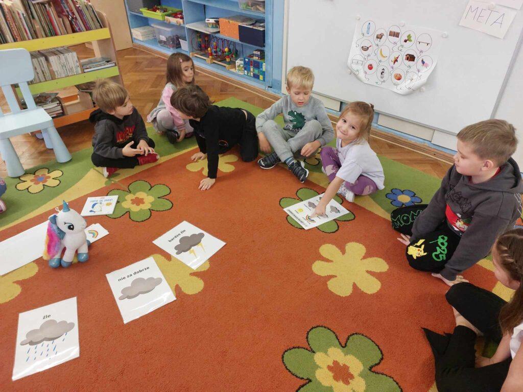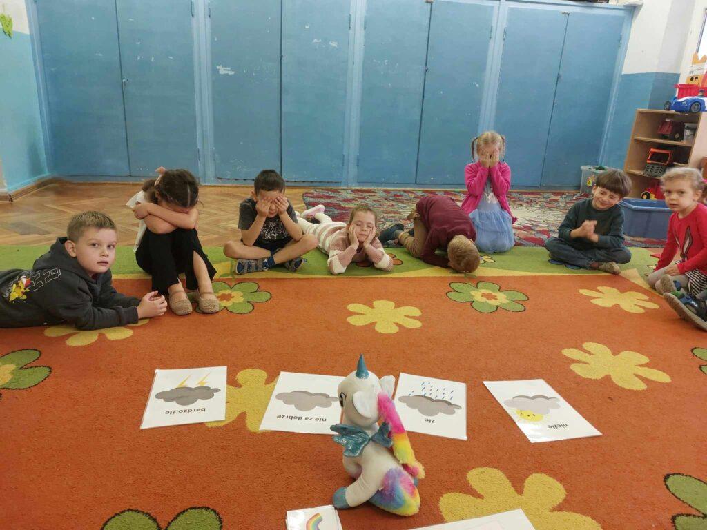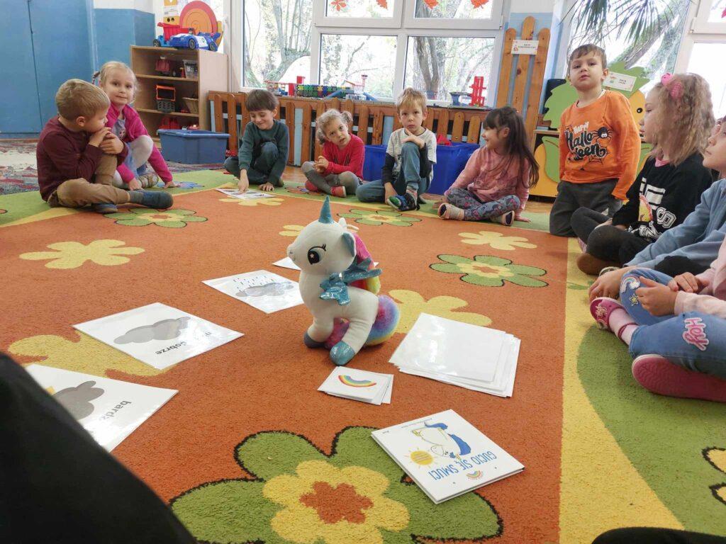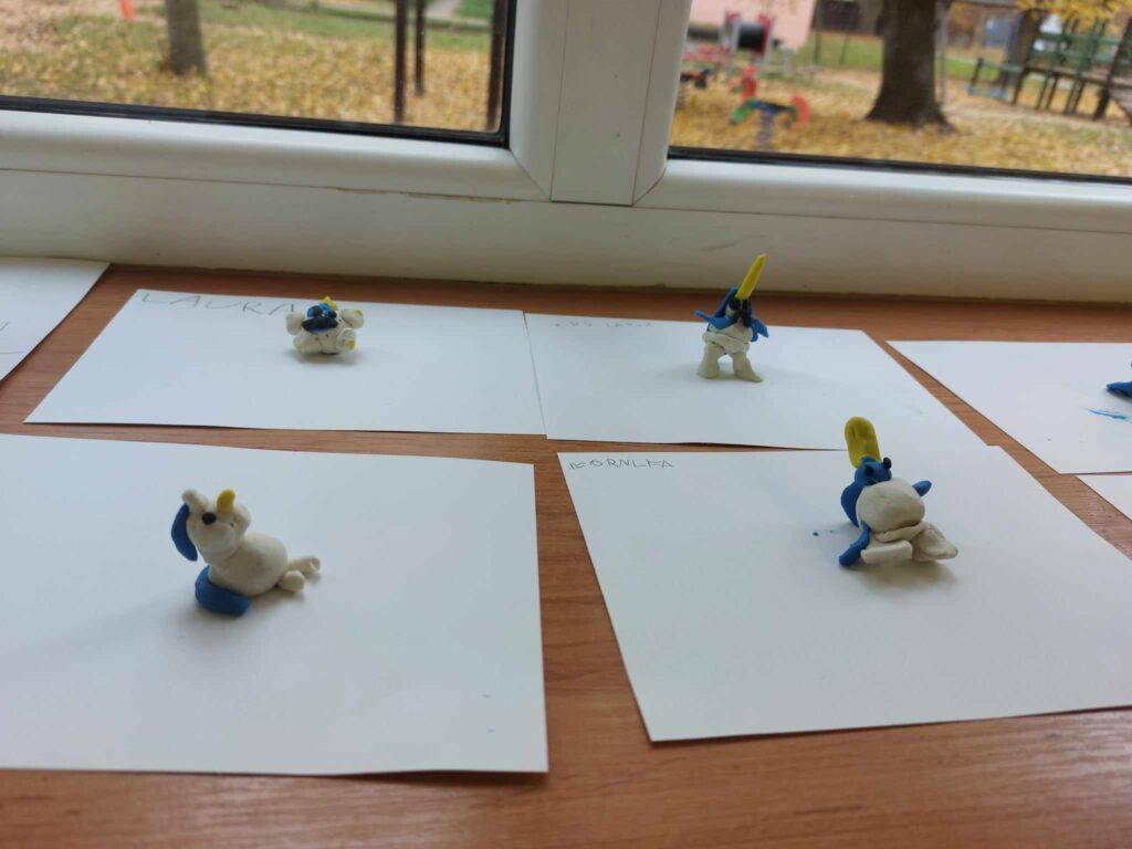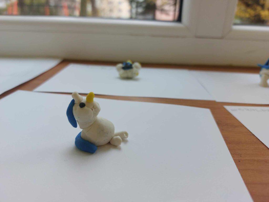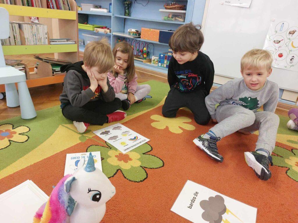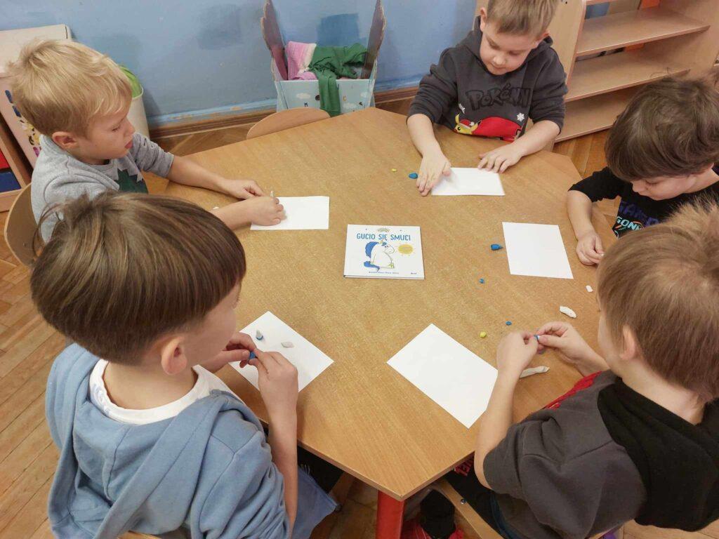 30 października odbyło się kolejne spotkanie z jednorożcem Guciem. Tematem naszych rozmów był smutek. Najpierw każdy przedszkolak określił swój nastrój. Następnie wspólnie szukaliśmy odpowiedzi na pytanie…Czym jest smutek? Co go powoduje? Czy jest potrzebny, oraz jak można sobie z nim radzić. Po wysłuchaniu opowieści, dzieci wykonały ćwiczenie oddechowo-ruchowe, które pomagają odgonić ciemną chmurę i uczucie smutku. Aby zadziałały trzeba je wykonać, co najmniej trzy razy, co też zrobiliśmy. Na koniec Sowy wykonały Gucia z plasteliny.