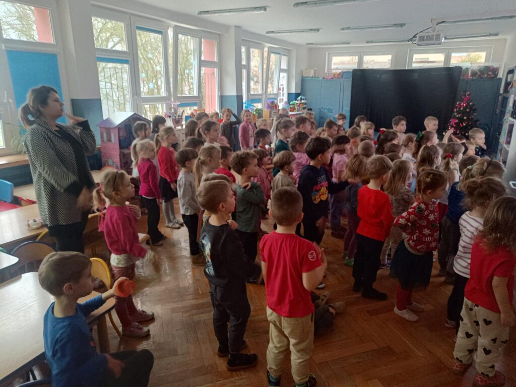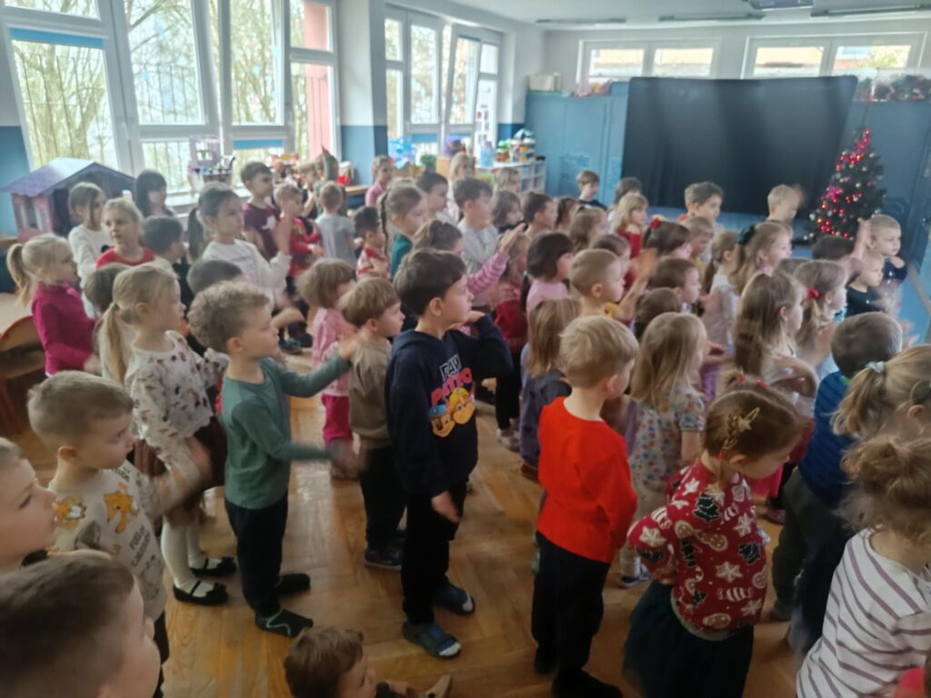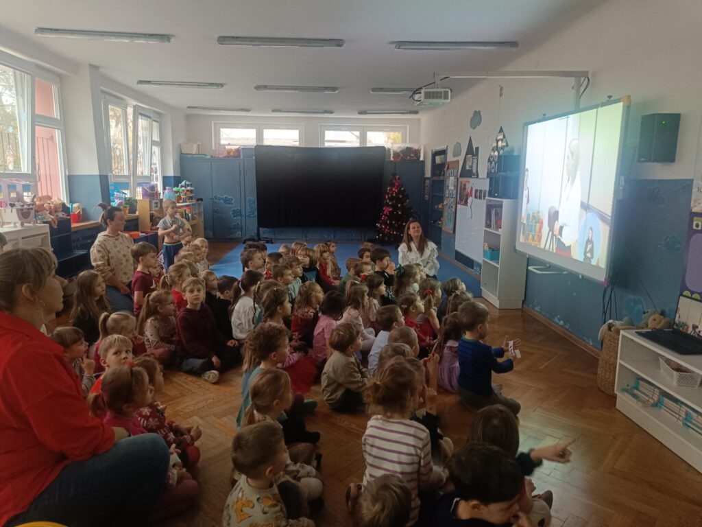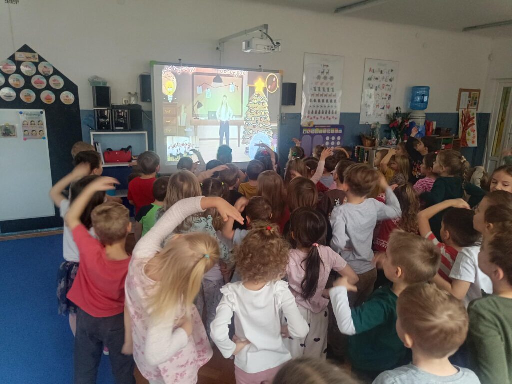 W czwartek, 18 grudnia dzieci z grupy: Żabek, Biedronek, Zajączków i Sów wzięły udział w integracyjnym WF-ie. W sali Biedronek na tablicy multimedialnej połączyliśmy się on-line z Fabryką Świętego Mikołaja. Przez pół godziny dzieci z całej Polski wspólnie ćwiczyły, bawiły się i odkrywały tajemnice Świątecznej Fabryki. Na koniec czekały nas tańce i świąteczne bajki.