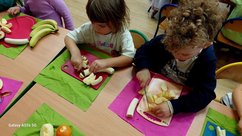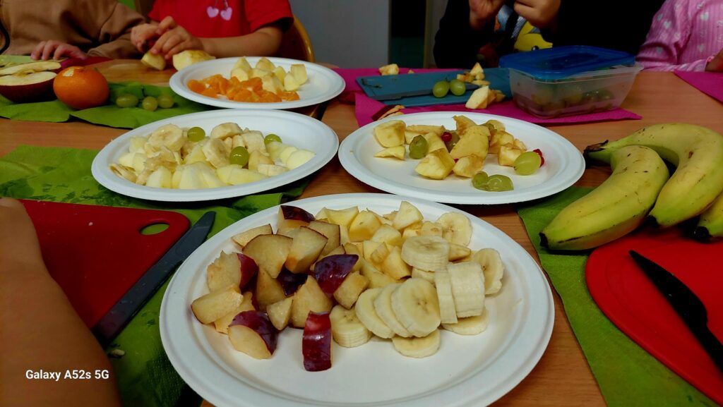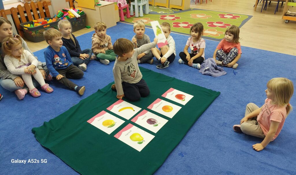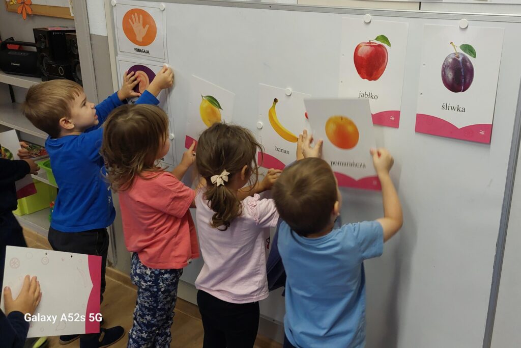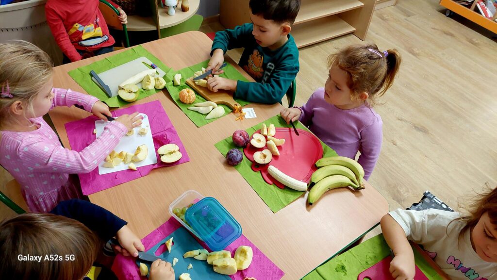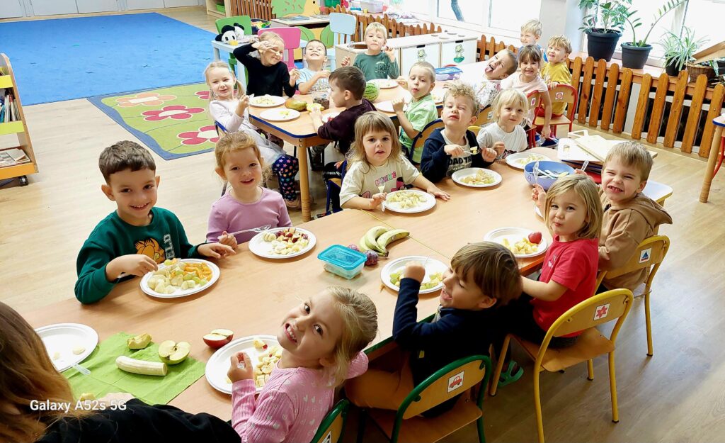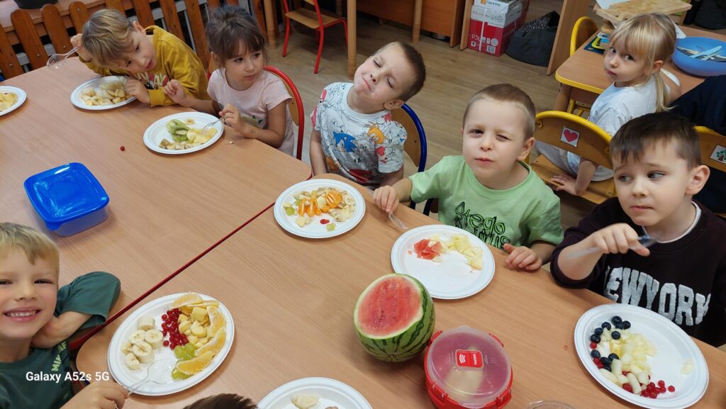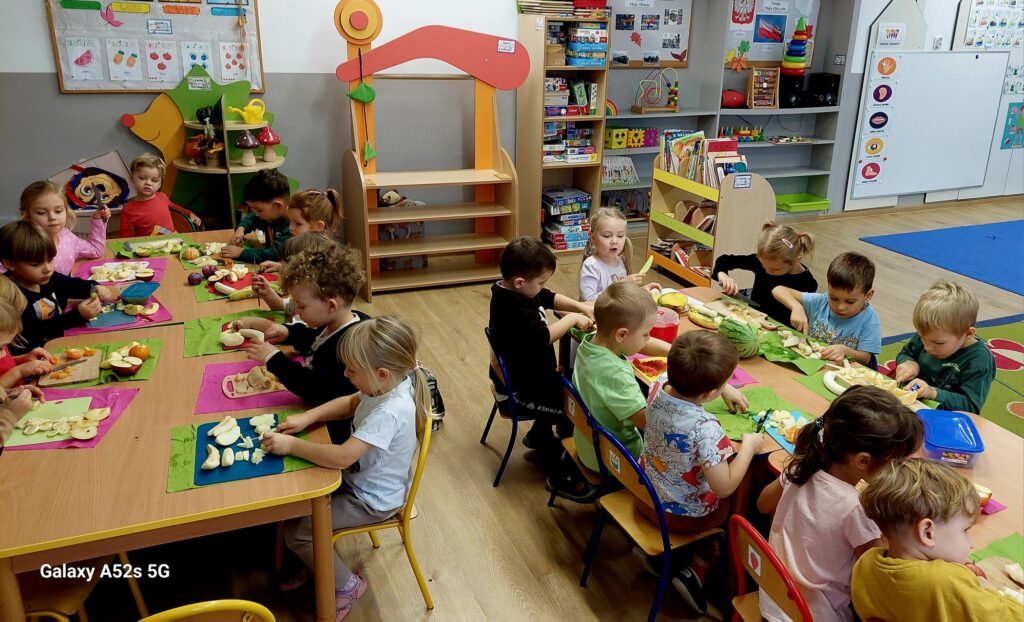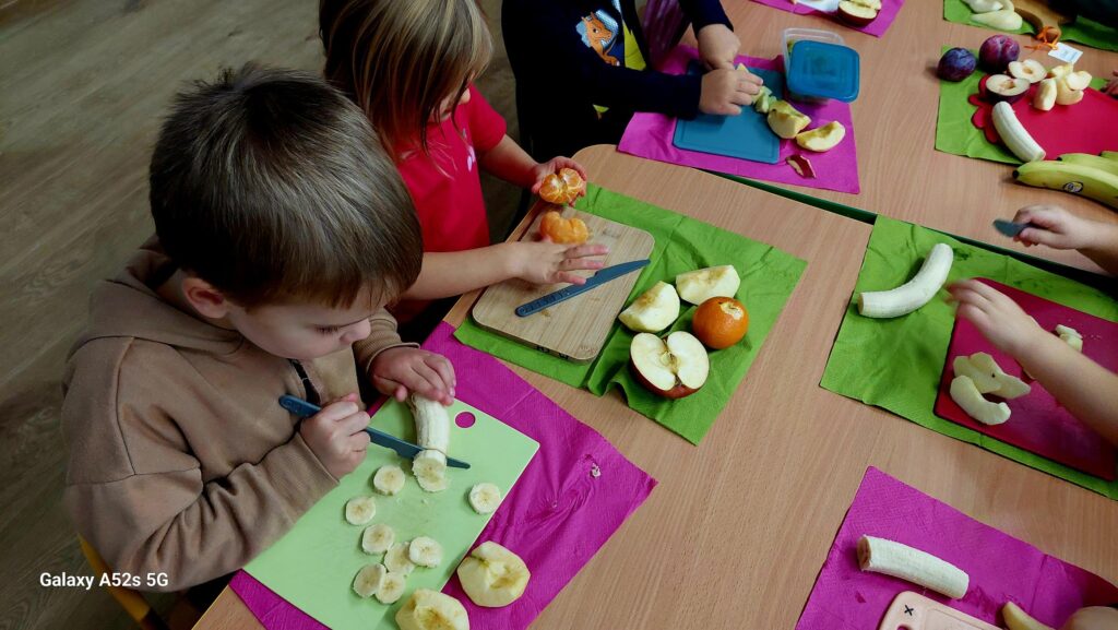 Jesień to pora roku pełna kolorów, smaków i skarbów natury! Postanowiliśmy wykorzystać nasze ulubione owocowe dary jesieni i wspólnie przygotować sałatkę owocową. Rozmawialiśmy o zdrowym odżywianiu, witaminach oraz o tym, dlaczego warto jeść owoce każdego dnia. Rozwiązywaliśmy owocowe zagadki, utrwalaliśmy nazwy owoców oraz przy dźwiękach muzyki przeliczaliśmy na paluszkach rumiane jabłuszka i soczyste śliweczki. Na koniec odbyła się wspólna degustacja – było smacznie, kolorowo i bardzo wesoło.