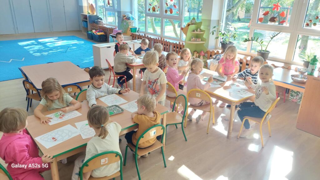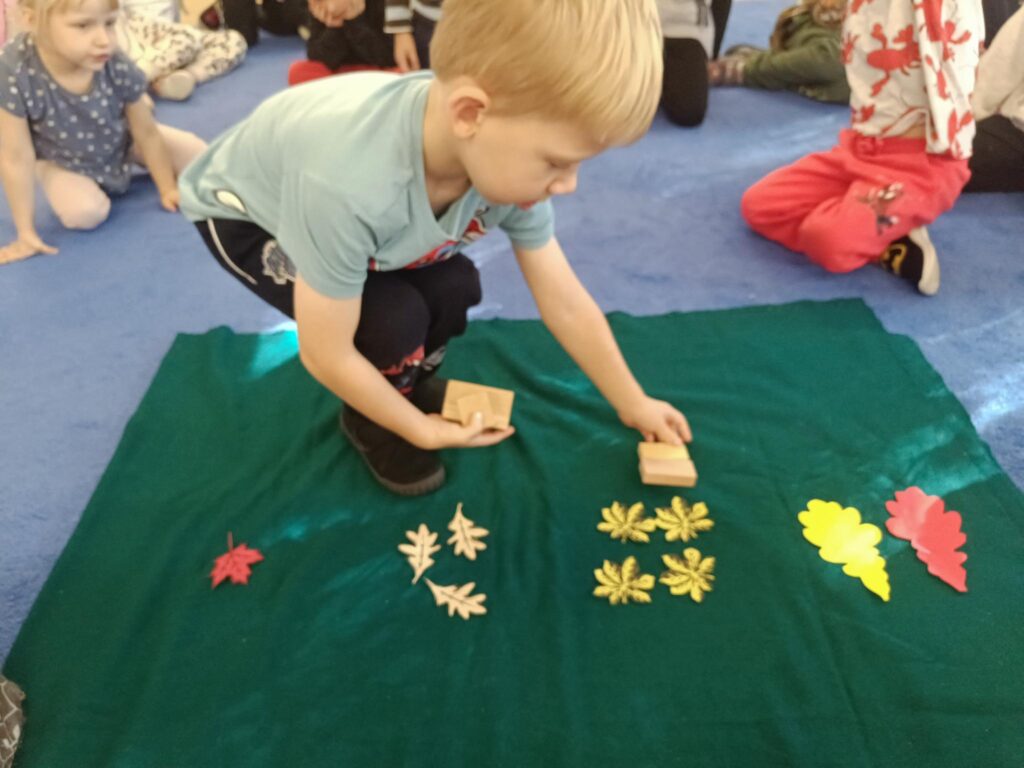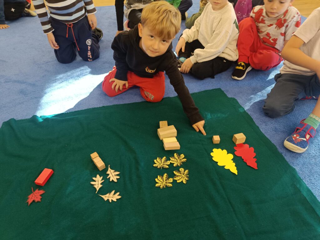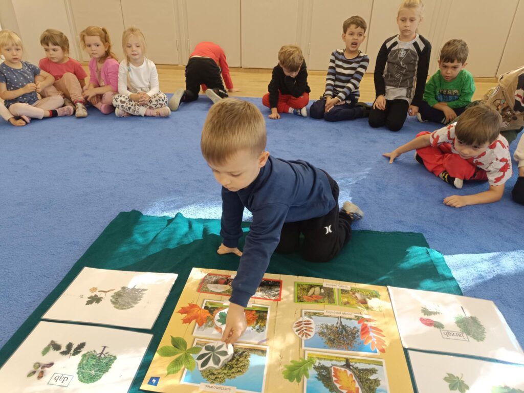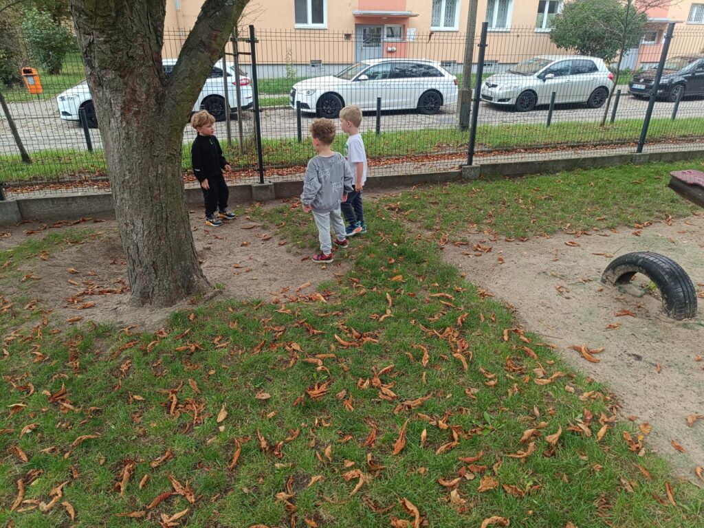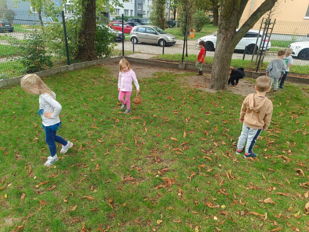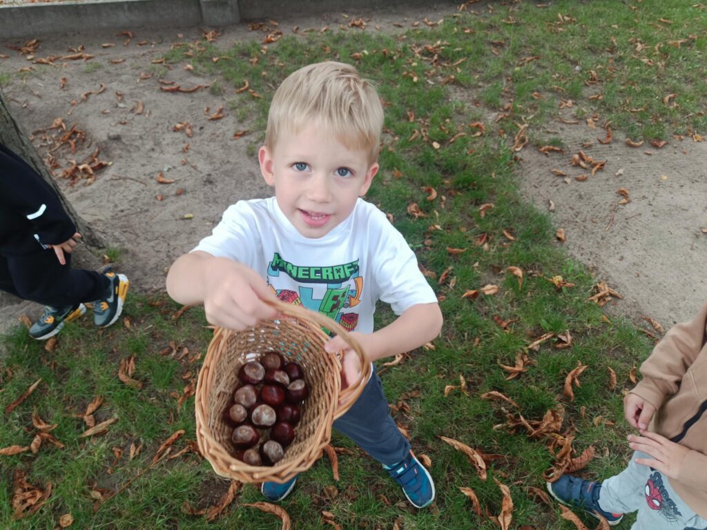 W przedszkolu nadszedł czas na jesienne zabawy, zbieranie liści, szyszek. W sali powstał kącik przyrody wzbogacony o dary jesieni, który tworzy doskonały warsztat do wielozmysłowego poznawania i wzbogacania wiedzy o jesieni. Poszerzyliśmy wiedzę na temat rodzajów drzew i środowisk w których rosną. Zwróciliśmy uwagę na zjawisko zmiany koloru liści i ich utratę przez drzewa w okresie jesieni. Liczyliśmy i klasyfikowaliśmy dary jesieni według podanej cechy. Tworzyliśmy również piękne jesienne prace. Dzieci chętnie korzystały z uroków złotej, polskiej jesieni i spędzały czas na świeżym powietrzu, obserwując zmieniającą się przyrodę, szukając kasztanów, zbierając liście.