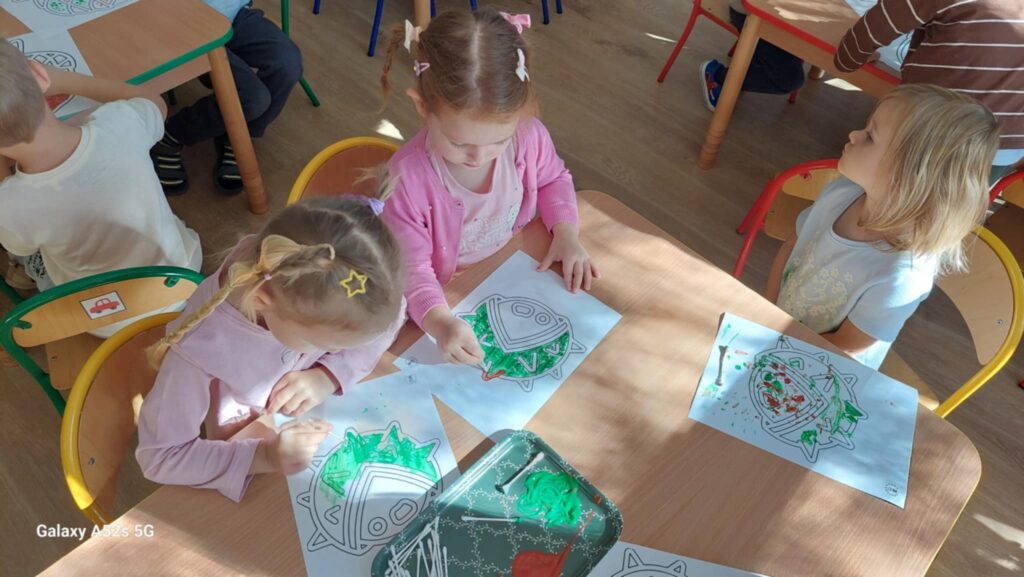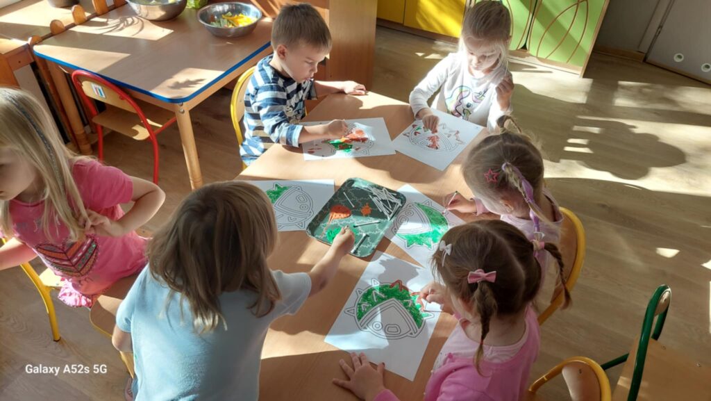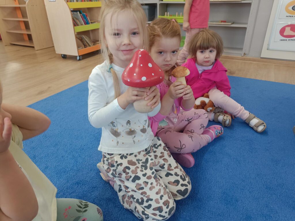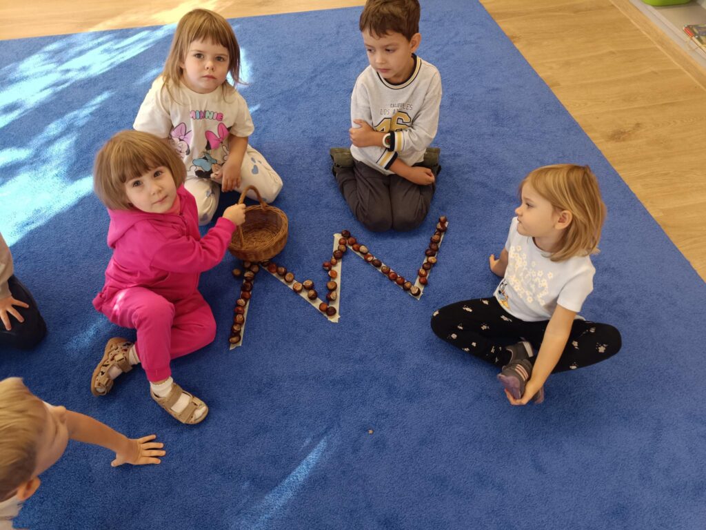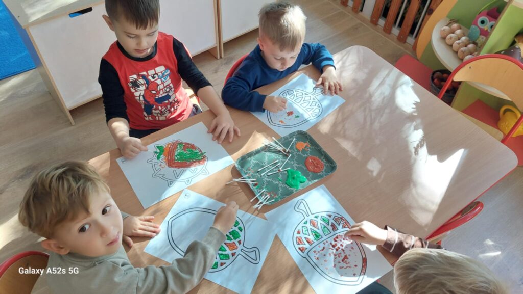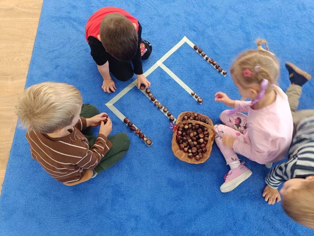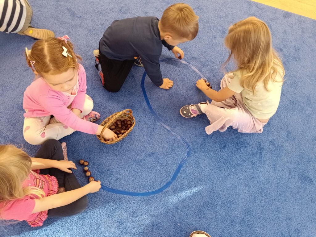 W przedszkolu nadszedł czas na jesienne zabawy, zbieranie liści, szyszek. W sali powstał kącik przyrody wzbogacony o dary jesieni, który tworzy doskonały warsztat do wielozmysłowego poznawania i wzbogacania wiedzy o jesieni. Poszerzyliśmy wiedzę na temat rodzajów drzew i środowisk w których rosną. Zwróciliśmy uwagę na zjawisko zmiany koloru liści i ich utratę przez drzewa w okresie jesieni. Liczyliśmy i klasyfikowaliśmy dary jesieni według podanej cechy. Tworzyliśmy również piękne jesienne prace. Dzieci chętnie korzystały z uroków złotej, polskiej jesieni i spędzały czas na świeżym powietrzu, obserwując zmieniającą się przyrodę, szukając kasztanów, zbierając liście.