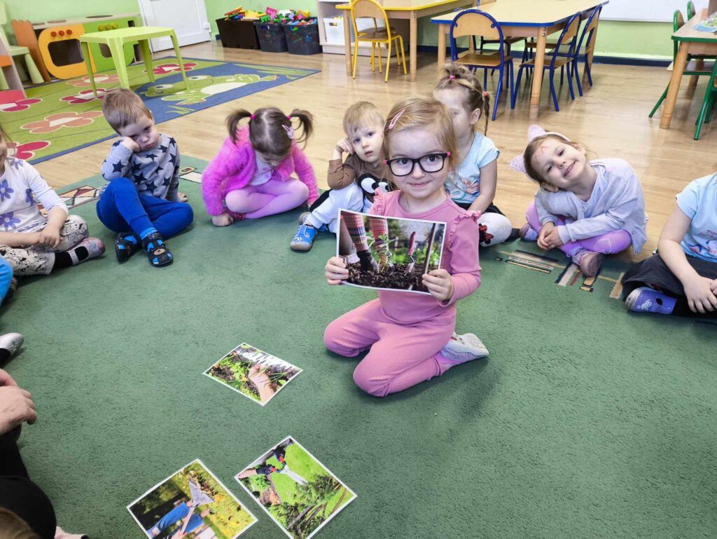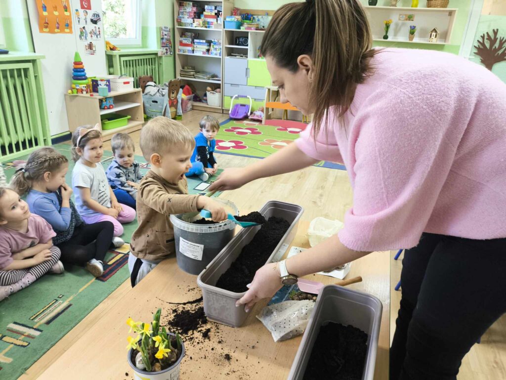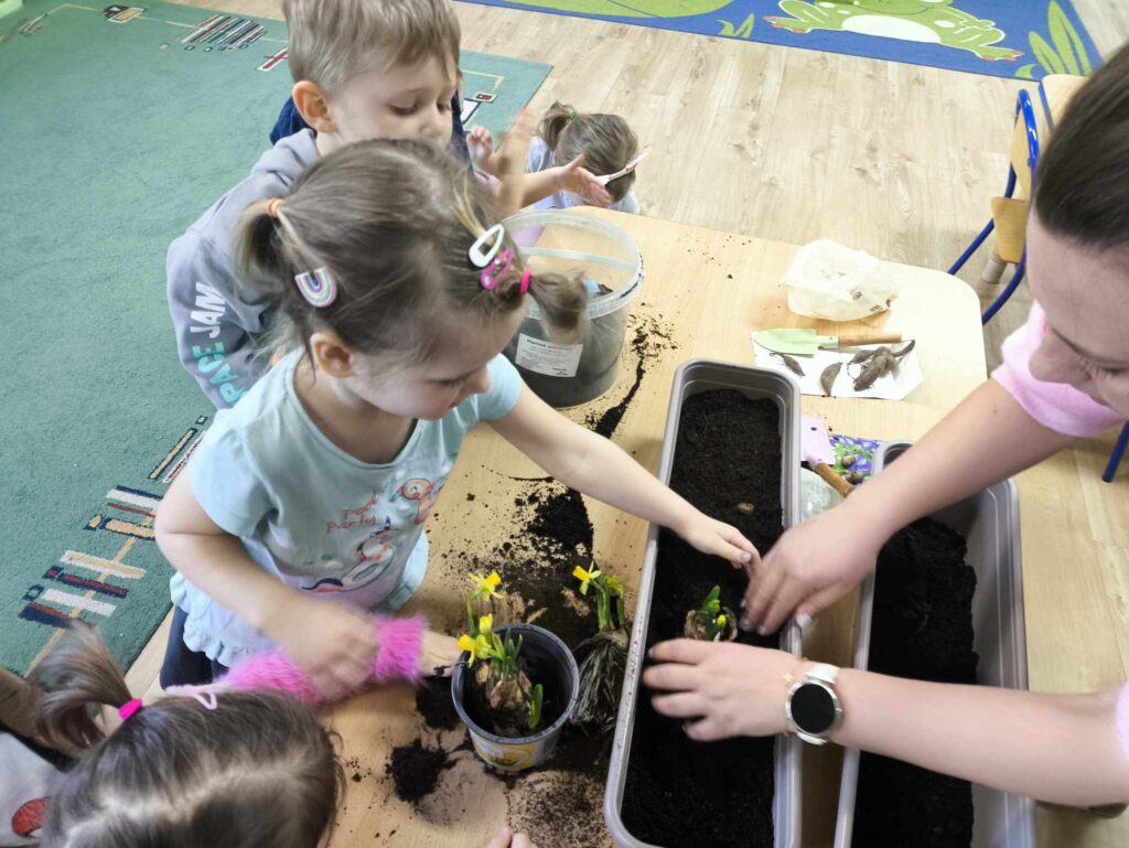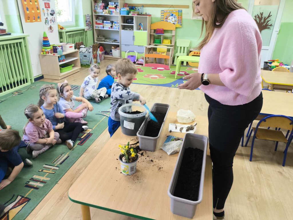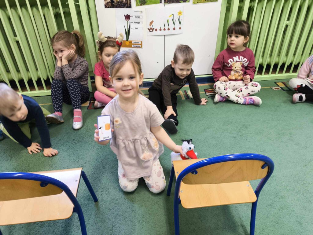 W marcu Żabki zapoznały się z pracą ogrodnika. Dowiedziały się jakie prace ogrodowe wykonuje ogrodnik. Przed rozpoczęciem zakładania własnej hodowli kwiatów dzieci ułożyły etapy siania kwiatów. Żabki doskonale wiedzą, że do życia rośliny potrzebują wody, a te które rosną na dworze podlewa deszcz , dlatego przyjrzeliśmy się także obiegowi wody w przyrodzie oraz wykonaliśmy proste doświadczenie z tym związane. Ćwiczyliśmy także określanie położenia bociana względem krzesła – idzie nam to naprawdę dobrze 🙂