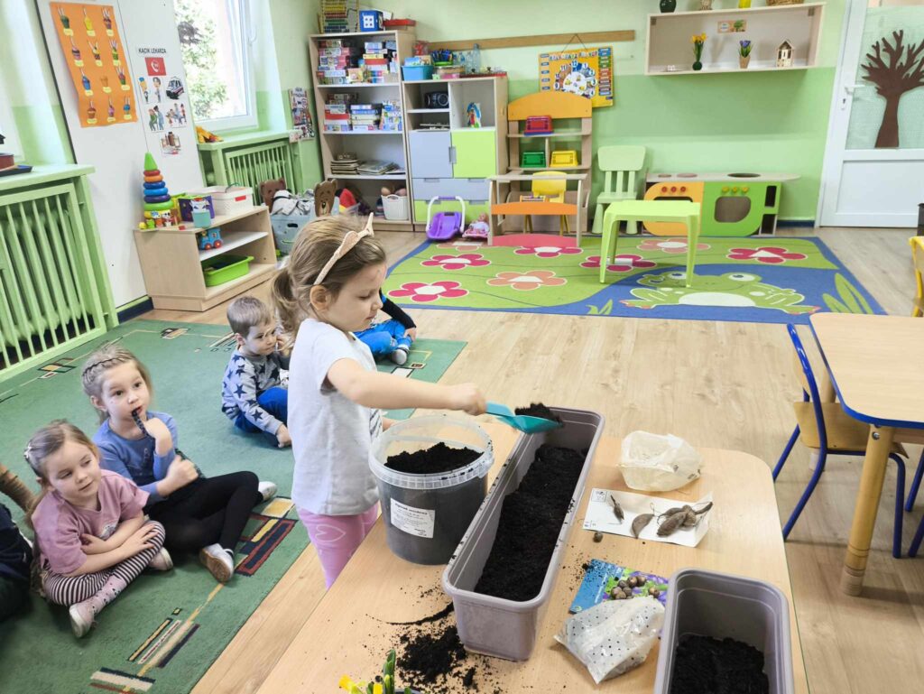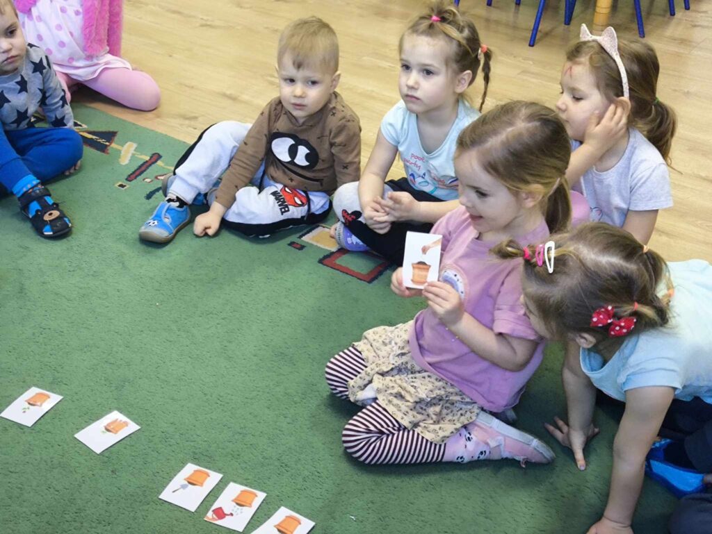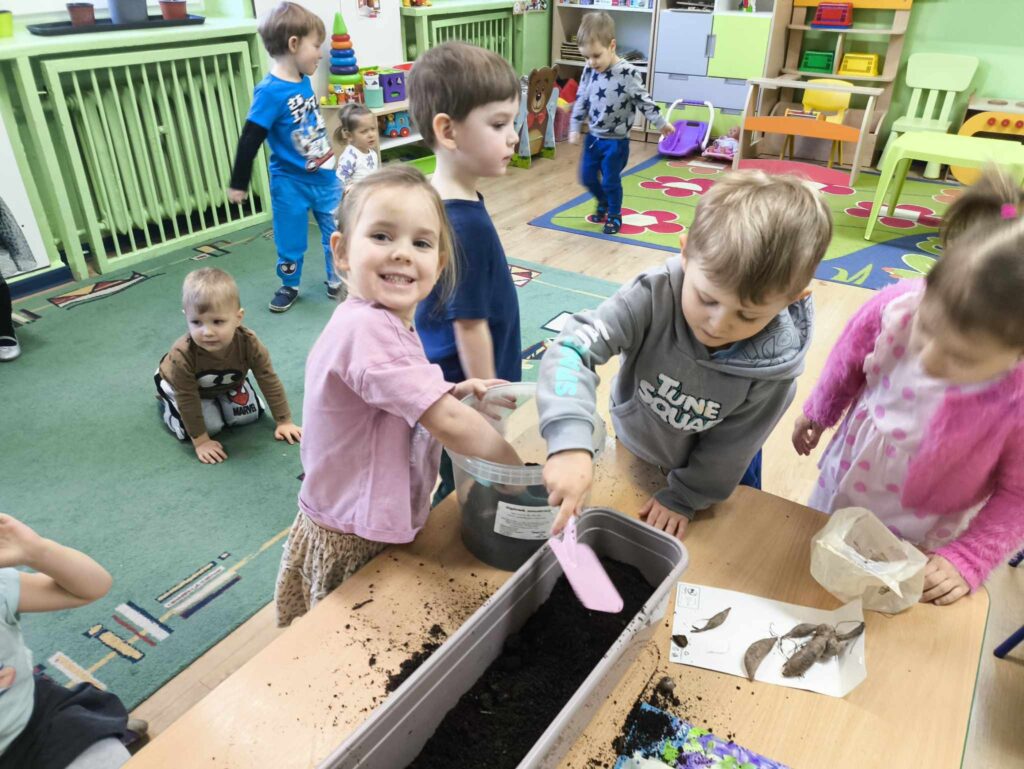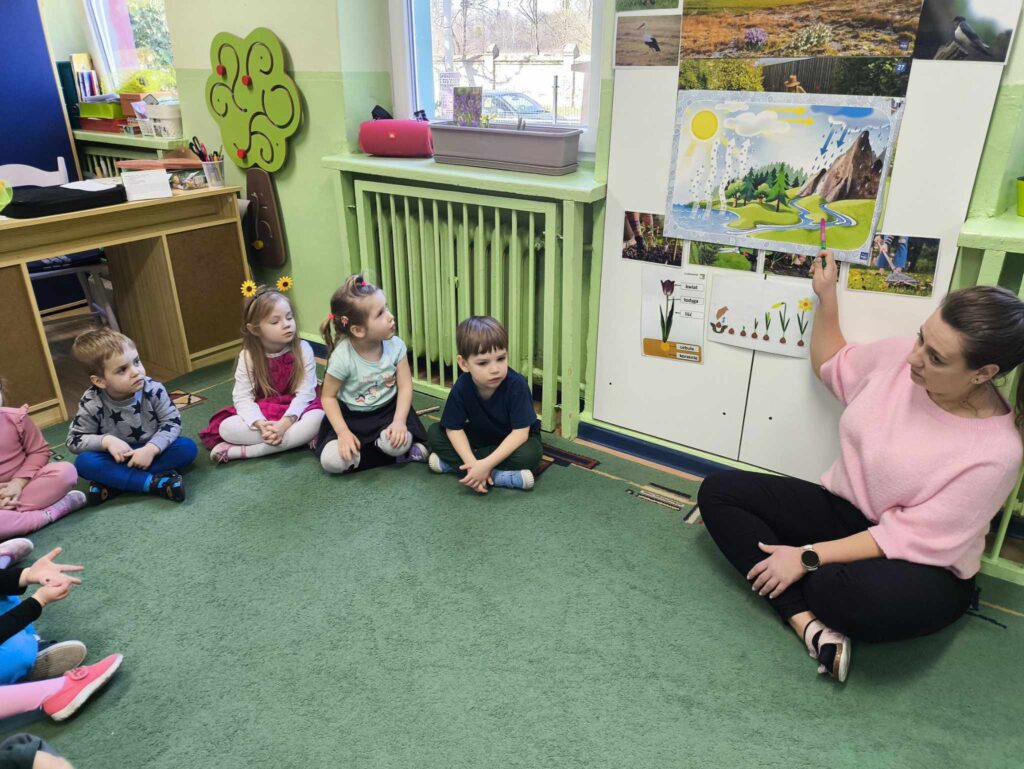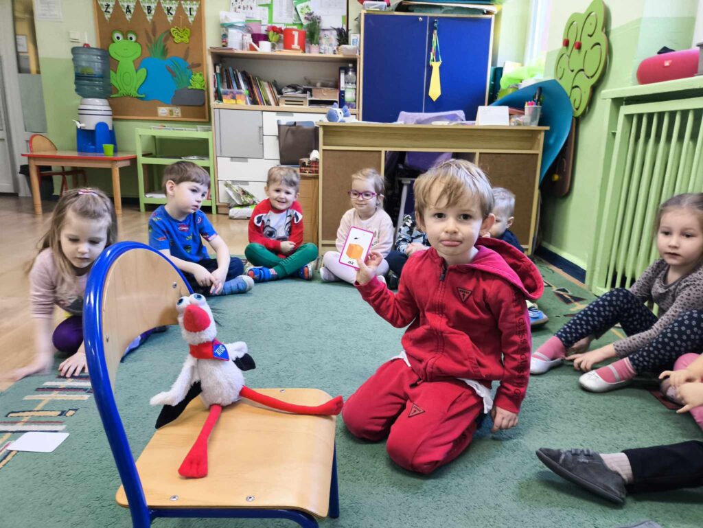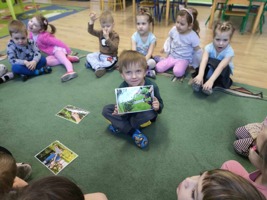 W marcu Żabki zapoznały się z pracą ogrodnika. Dowiedziały się jakie prace ogrodowe wykonuje ogrodnik. Przed rozpoczęciem zakładania własnej hodowli kwiatów dzieci ułożyły etapy siania kwiatów. Żabki doskonale wiedzą, że do życia rośliny potrzebują wody, a te które rosną na dworze podlewa deszcz , dlatego przyjrzeliśmy się także obiegowi wody w przyrodzie oraz wykonaliśmy proste doświadczenie z tym związane. Ćwiczyliśmy także określanie położenia bociana względem krzesła – idzie nam to naprawdę dobrze 🙂