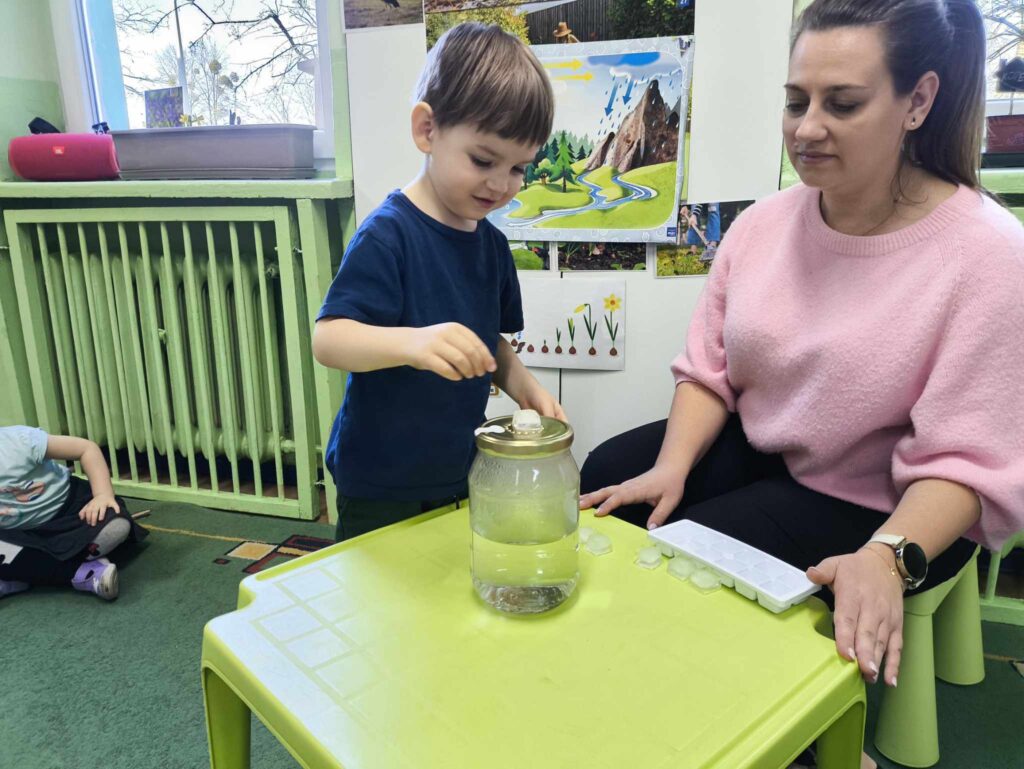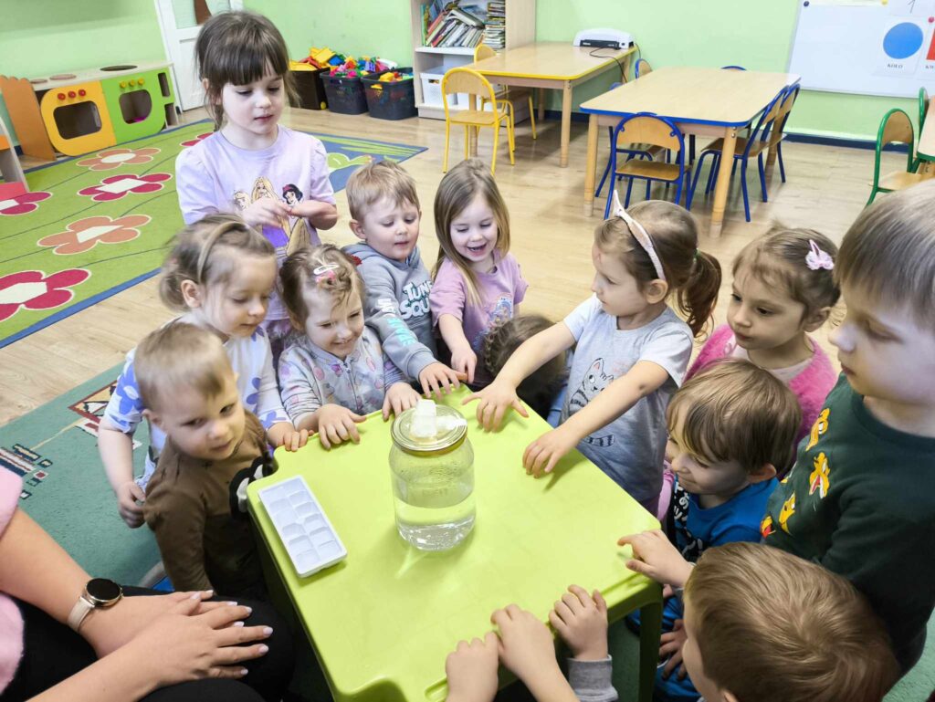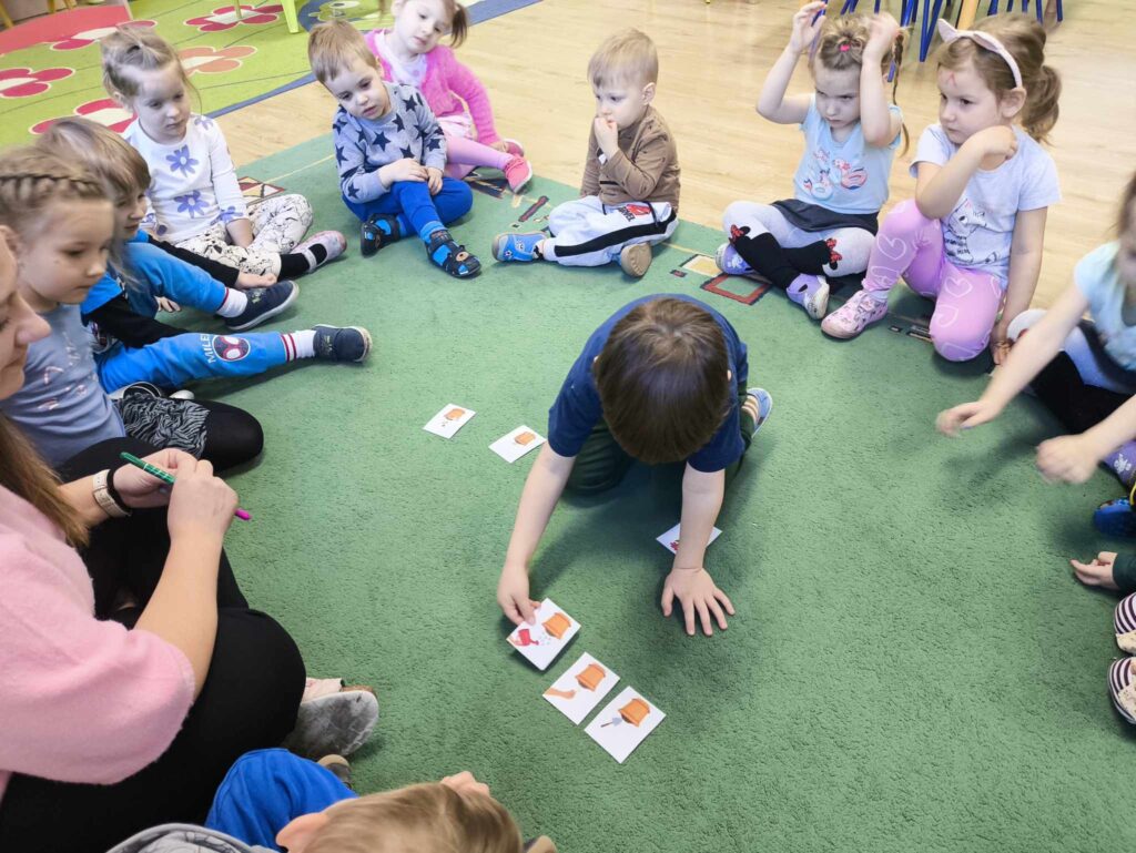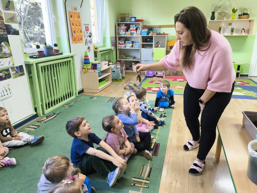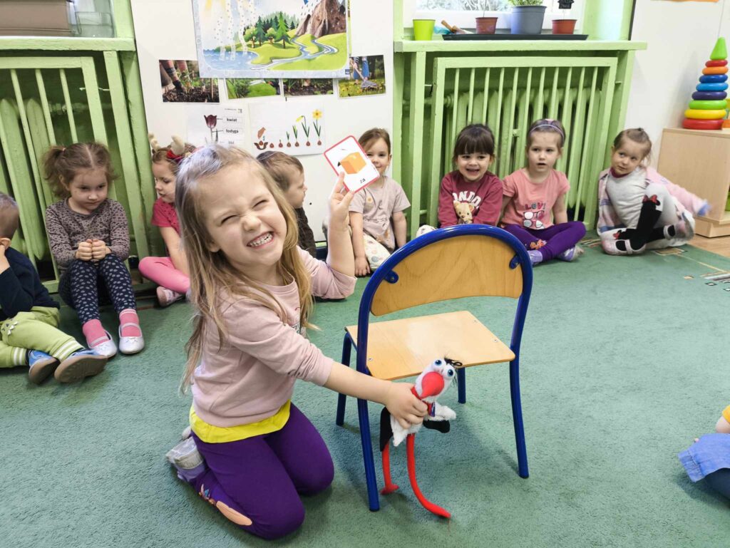 W marcu Żabki zapoznały się z pracą ogrodnika. Dowiedziały się jakie prace ogrodowe wykonuje ogrodnik. Przed rozpoczęciem zakładania własnej hodowli kwiatów dzieci ułożyły etapy siania kwiatów. Żabki doskonale wiedzą, że do życia rośliny potrzebują wody, a te które rosną na dworze podlewa deszcz , dlatego przyjrzeliśmy się także obiegowi wody w przyrodzie oraz wykonaliśmy proste doświadczenie z tym związane. Ćwiczyliśmy także określanie położenia bociana względem krzesła – idzie nam to naprawdę dobrze 🙂