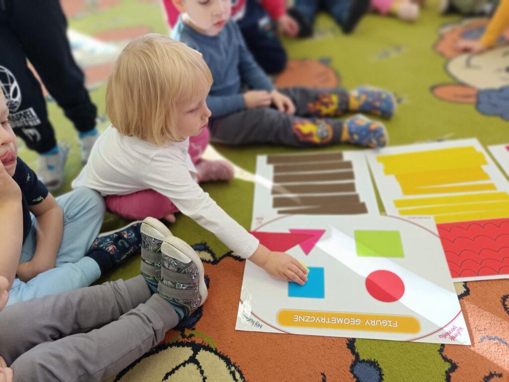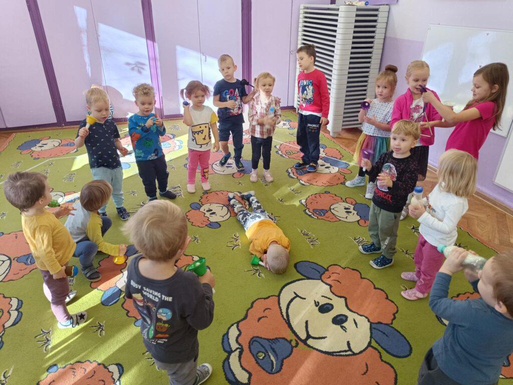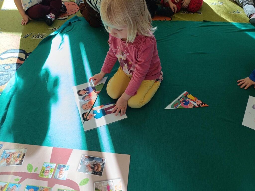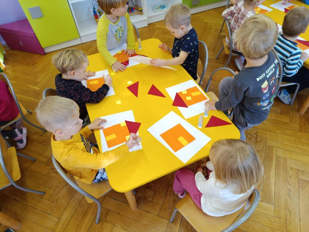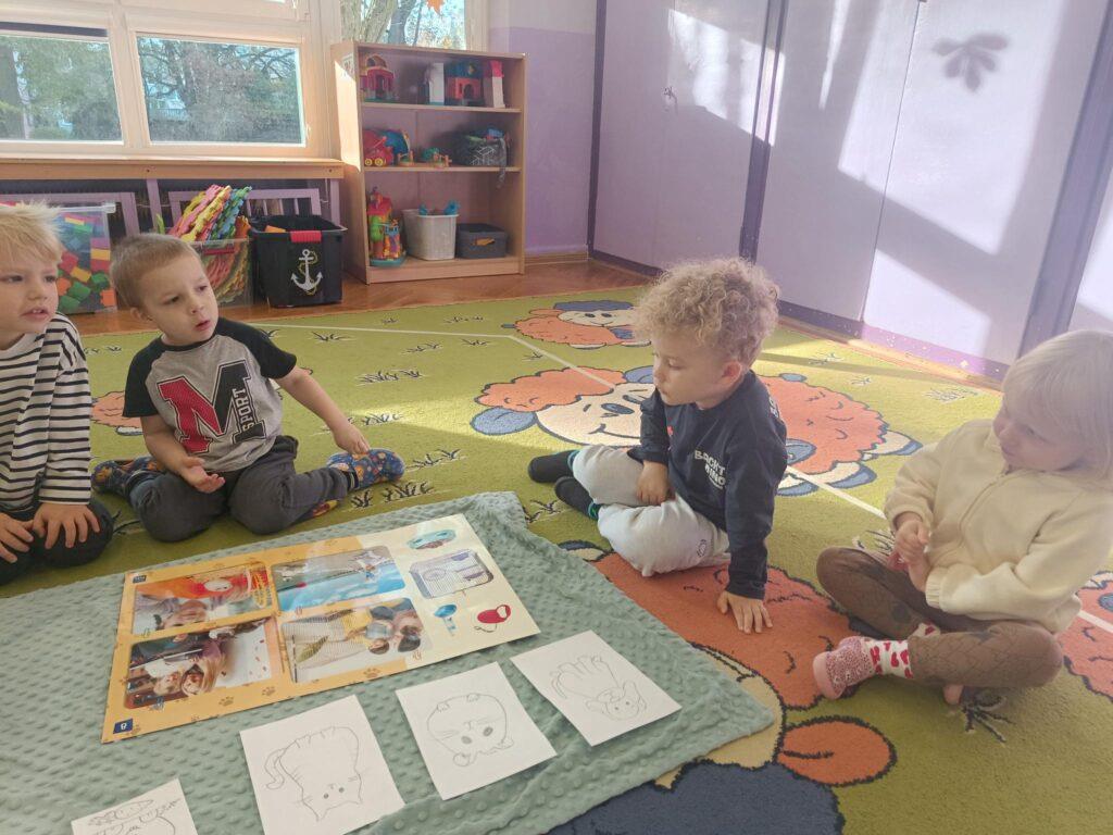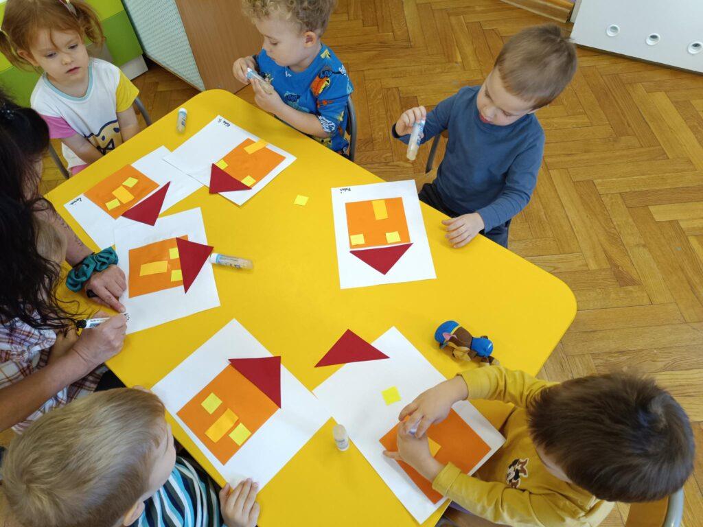 W październiku dzieci zapoznały się z nazwami członków rodziny – mama, tata, brat, siostra, dziadek, babcia, wujek, ciocia. Dzieci opowiadały o swoich najbliższych, jak wygląda mama i tata, jak również o tym co robią wspólnie w wolnym czasie. Za pomocą figur geometrycznych wykonały pracę plastyczną domu. Rozmawialiśmy również o zwierzętach domowych.