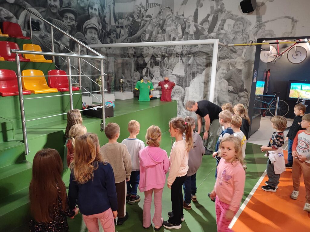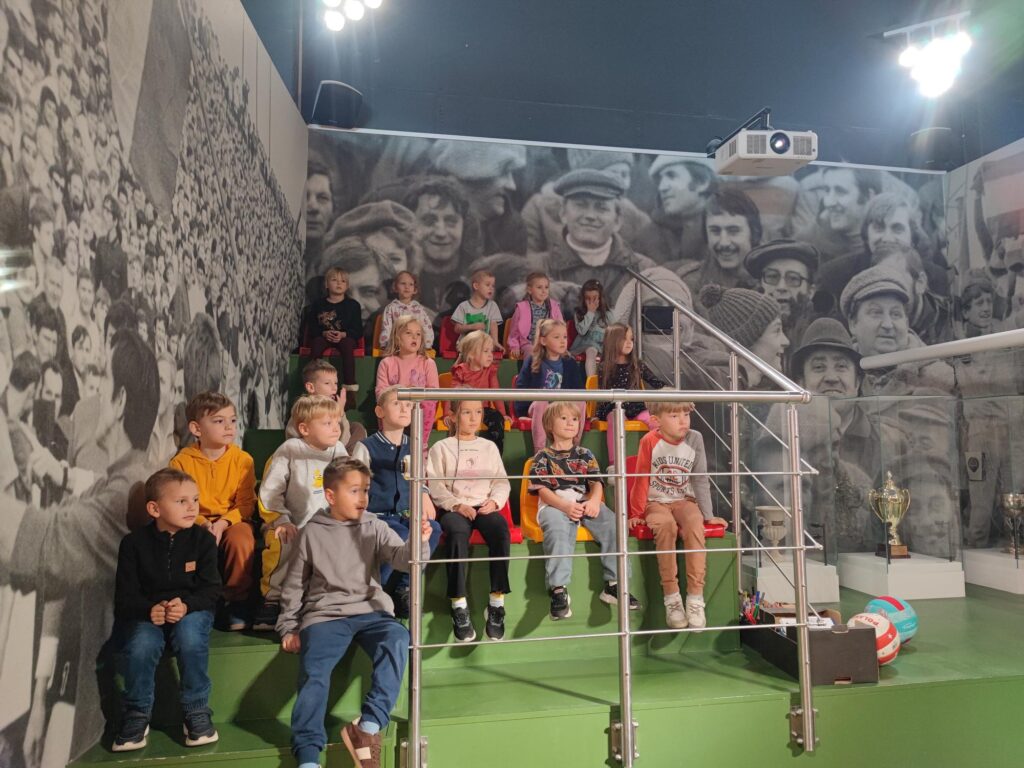 Dnia 2.10.2025r dwie grupy przedszkolne (Sowy i Zajączki) udały się na wycieczkę do Muzeum Sportu i Turystyki mieszczącego się z Zatoce Sportu. W muzeum mieliśmy okazje obejrzeć puchary ŁKS-u i Widzewa, usiąść na trybunach, strzelić gola czy zmierzyć sobie czas biegu na bieżni. Dowiedzieliśmy się też co oznaczają pierścienie olimpijskie i jak wyglądał dawny oszczep. Niespodzianką było też to, że mogliśmy obejrzeć basen z miejsca, do którego nie każdy ma dostęp.