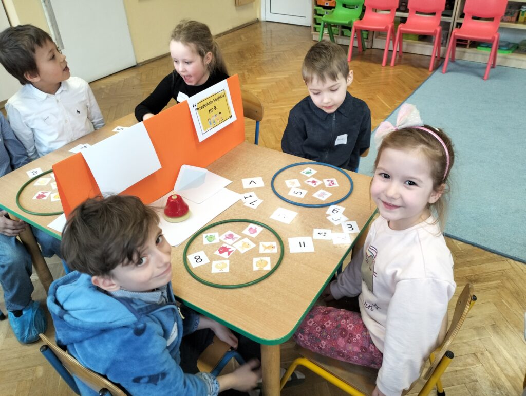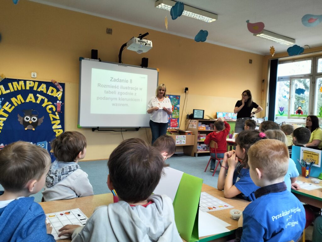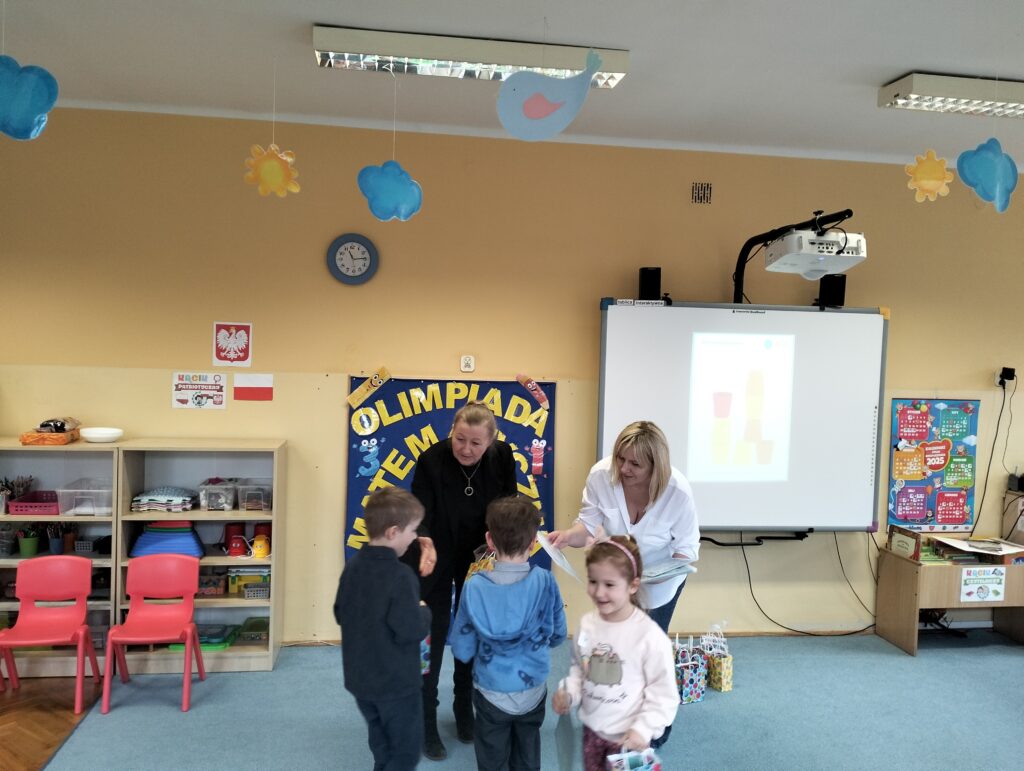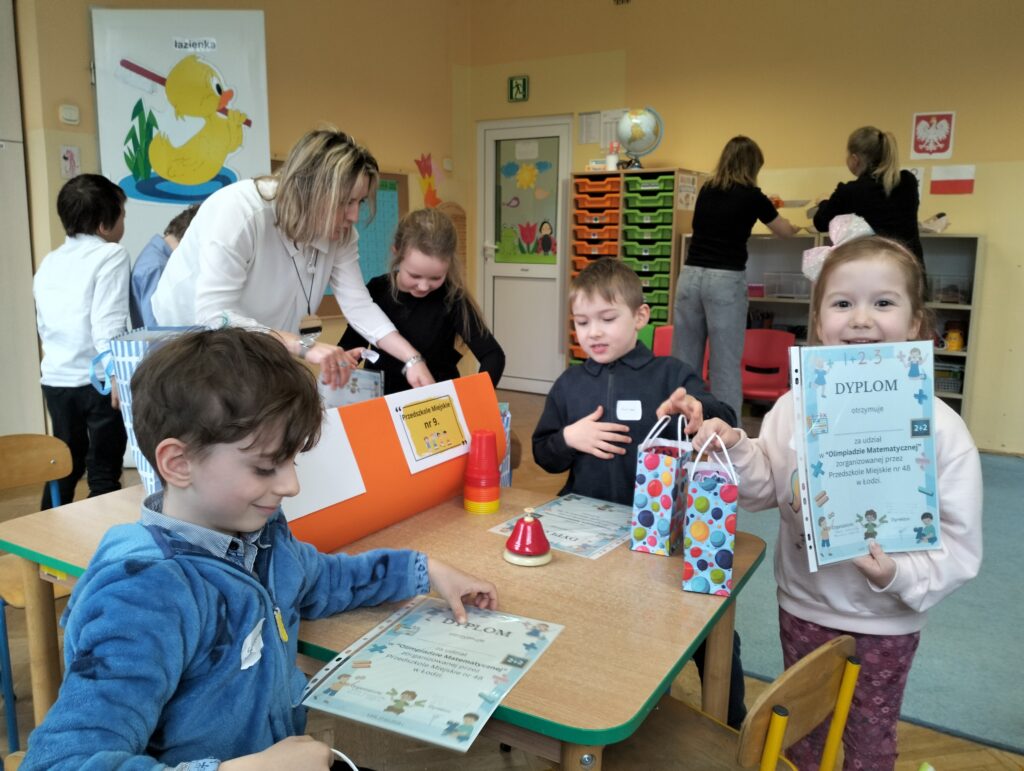 W czwartek 27 marca w Przedszkolu Miejskim Nr 48 odbyła się Olimpiada matematyczna. Nasze przedszkole godnie reprezentowali: Iga i Sebastian z grupy Sów oraz Antek z grupy Wiewiórek. Celem olimpiady było wspieranie uzdolnień matematycznych oraz pomoc w rozwijaniu zainteresowań dzieci. W olimpiadzie wzięło udział 10 drużyn, których zadaniem było rozwiązanie aż dziesięciu matematycznych zadań. Zmagania dzieci były bardzo wyrównane i dostarczyły zarówno dzieciom, jak i dorosłym wielu emocji. Finalnie od pierwszego miejsca dzieliły nasza drużynę tylko 2 punkty. Na koniec kiedy emocje już opadły przyszedł czas na uroczyste podziękowania, wręczenie dyplomów, drobnych upominków, oraz słodki poczęstunek.
