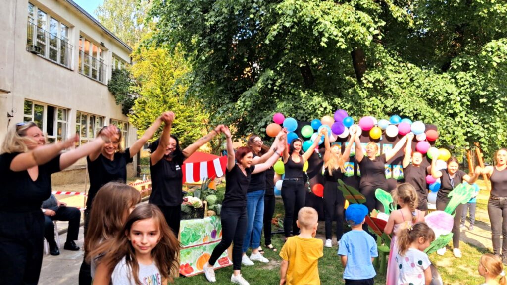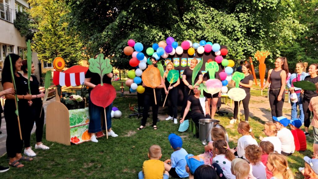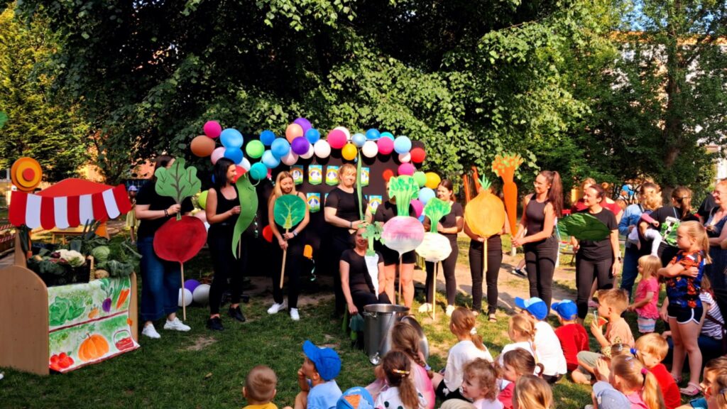 O5. czerwca odbył się w naszym przedszkolu doroczny piknik rodzinny. W tym roku okazją do wspólnego świętowania był Dzień Dziecka. Zabawa rozpoczęła się od krótkiej inscenizacji wystawionej przez radę pedagogiczną do wiersza J. Brzechwy pt. „Na straganie”. Po tym krótkim wstępie rozpoczęła się zabawa. W tym roku pragnęłyśmy zachęcić dzieci do jedzenia warzyw i owoców. Dzięki zaangażowaniu rodziców udało się stworzyć fantastyczne stoiska ze smacznymi przekąskami dla najmłodszych. Każda grupa miała przydzielone warzywo lub owoc, z którego rodzice wraz z dziećmi przygotowywali potrawy.