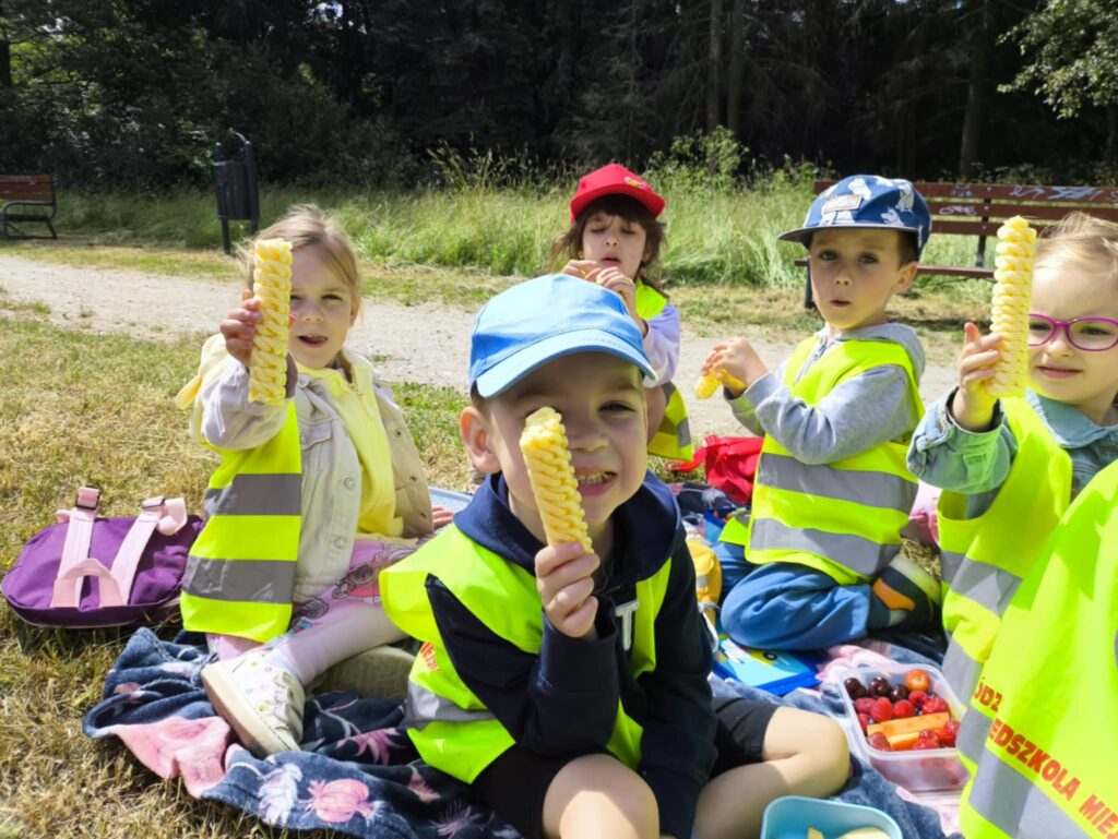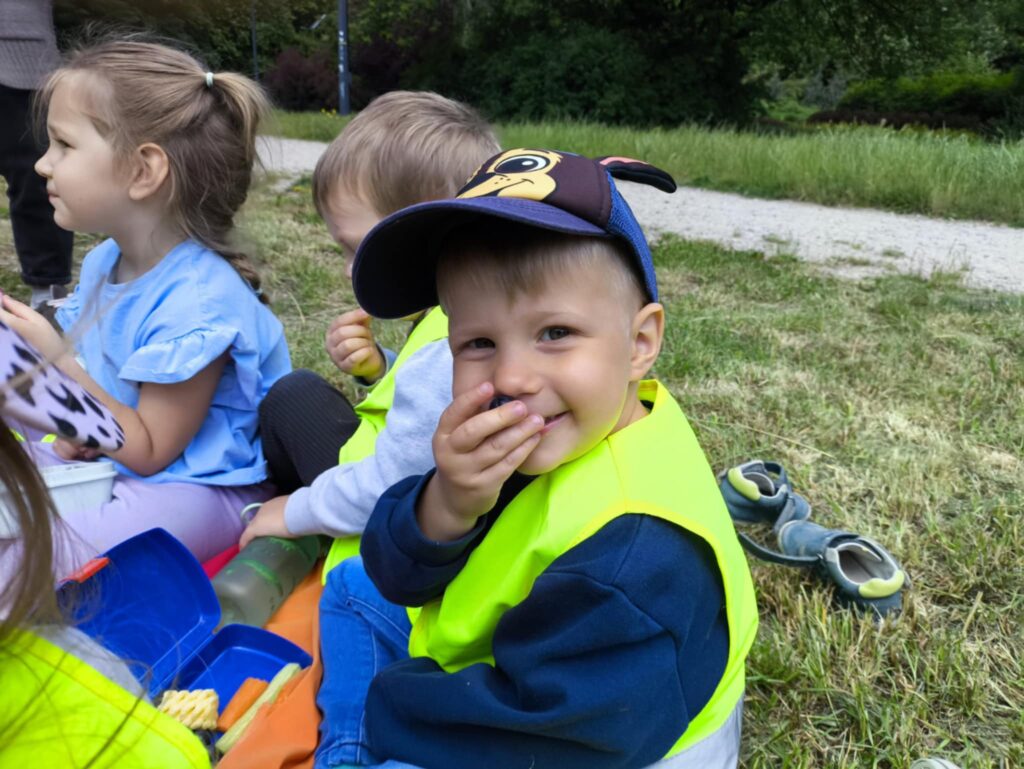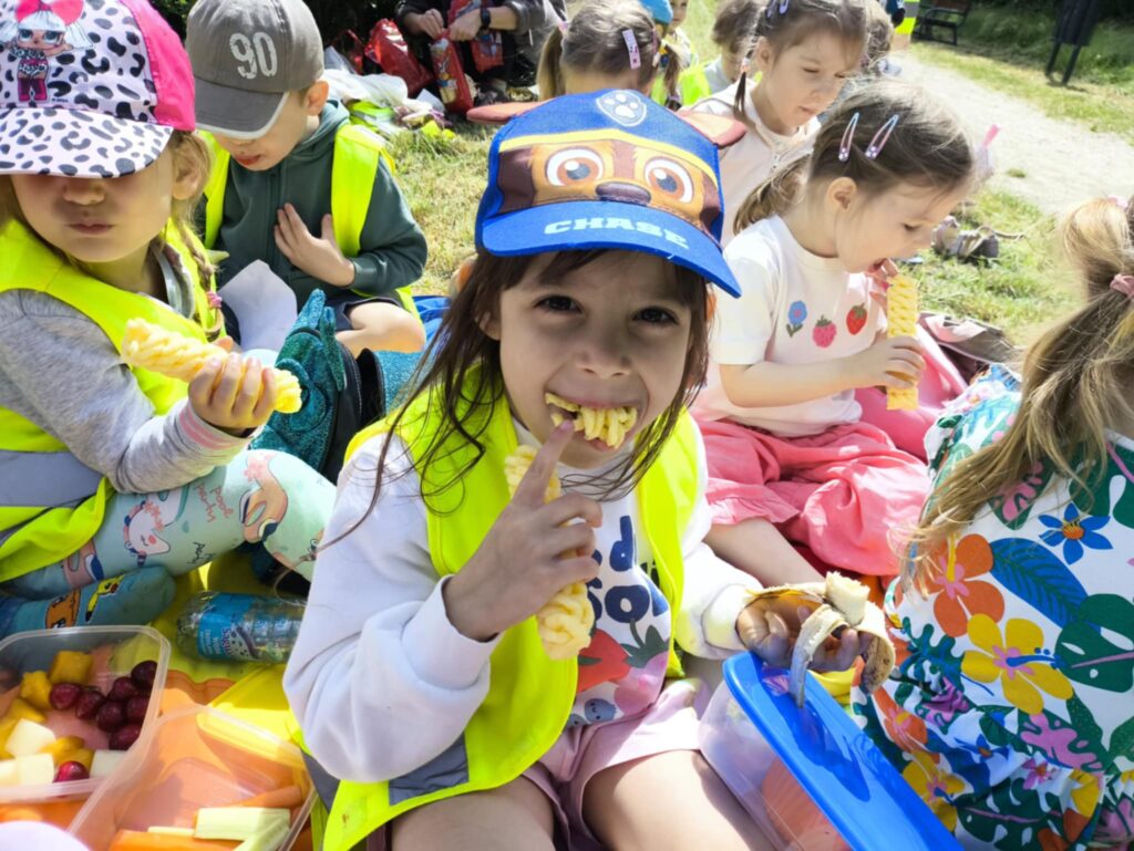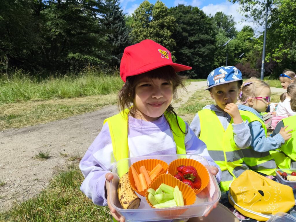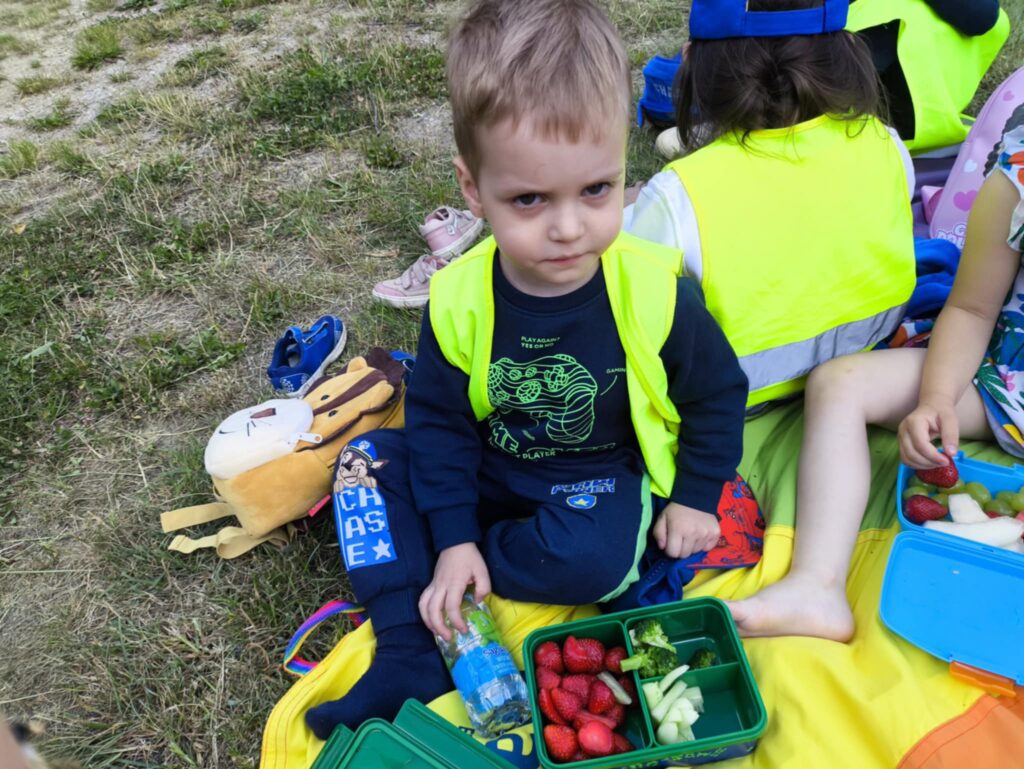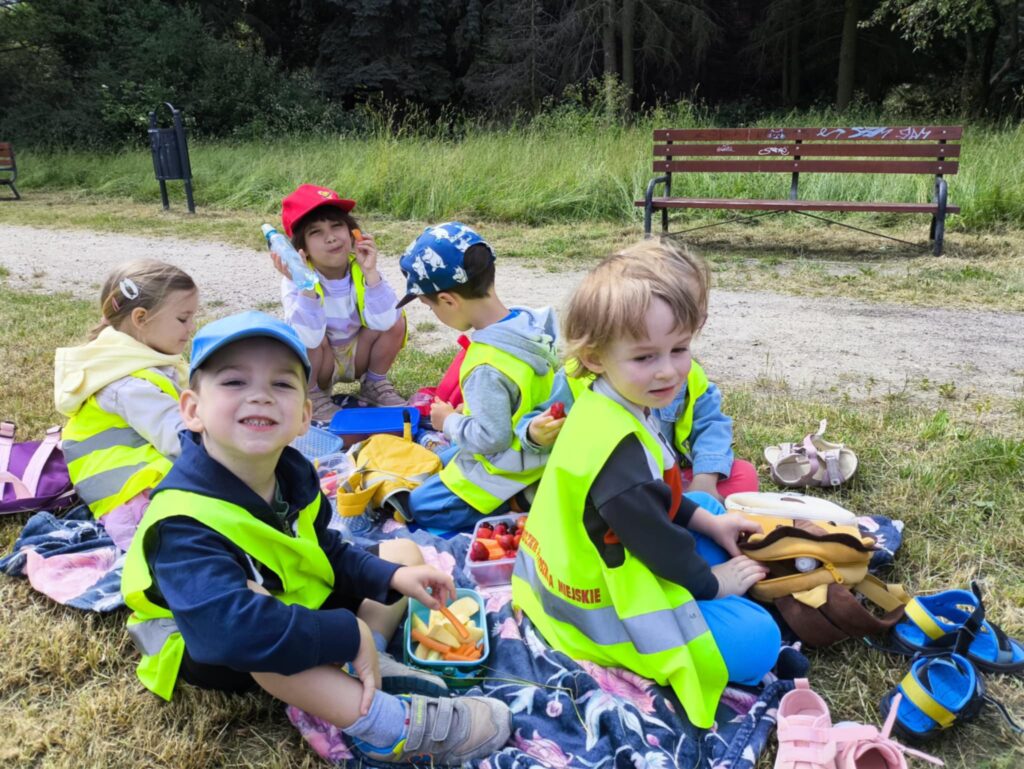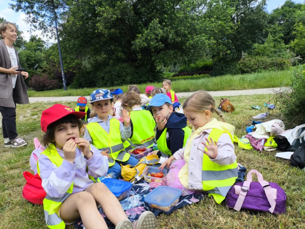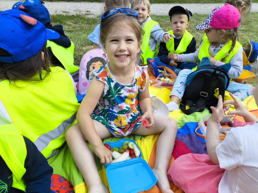 Pod koniec czerwca, aby miło spędzić wspólny czas tuż przed wakacjami, dzieci z grupy Żabek wybrały się do pobliskiego parku na piknik. Każda Żabka przygotowany miała swój prowiant – ulubione warzywa i owoce, a także wodę. Dzielnie z plecakiem na plecach ruszyliśmy przed siebie. Piknik rozpoczęliśmy od wspólnych zabaw z chustą animacyjną. Następnie zasiedliśmy wygodnie i przy wesołej muzyce spożywaliśmy przygotowane jedzenie. Ten dzień uważamy za bardzo udany, a czerwcowy piknik stanie się naszą grupową tradycją <3