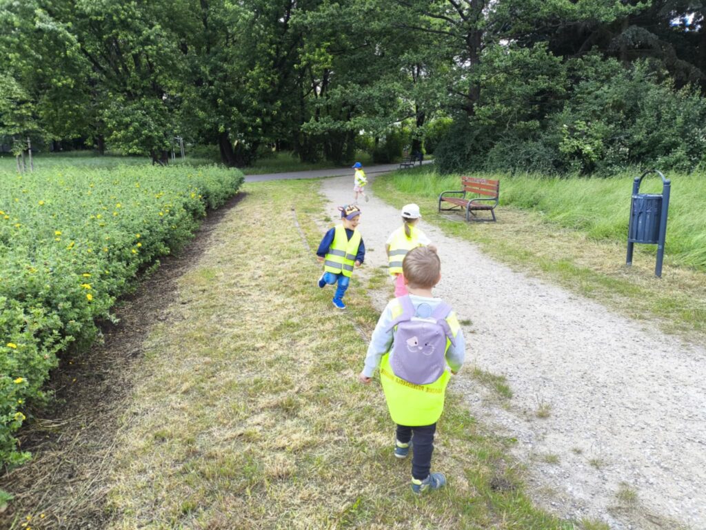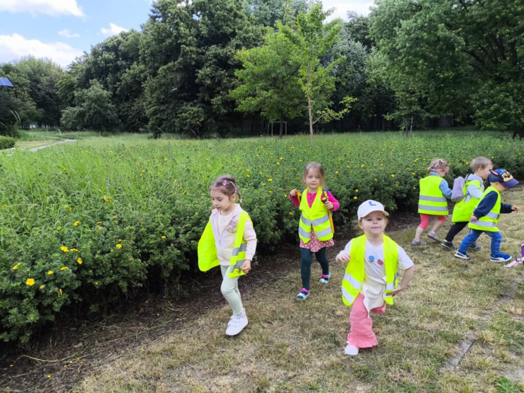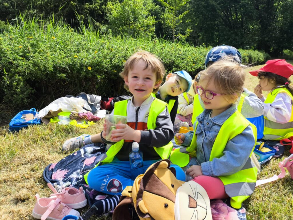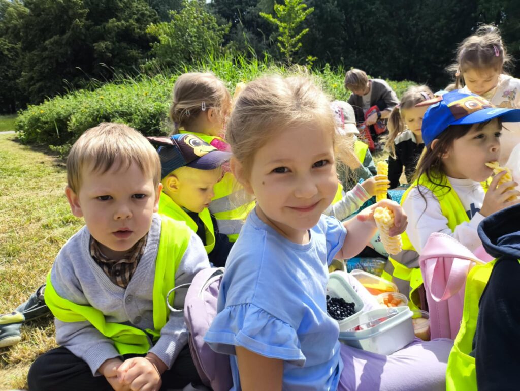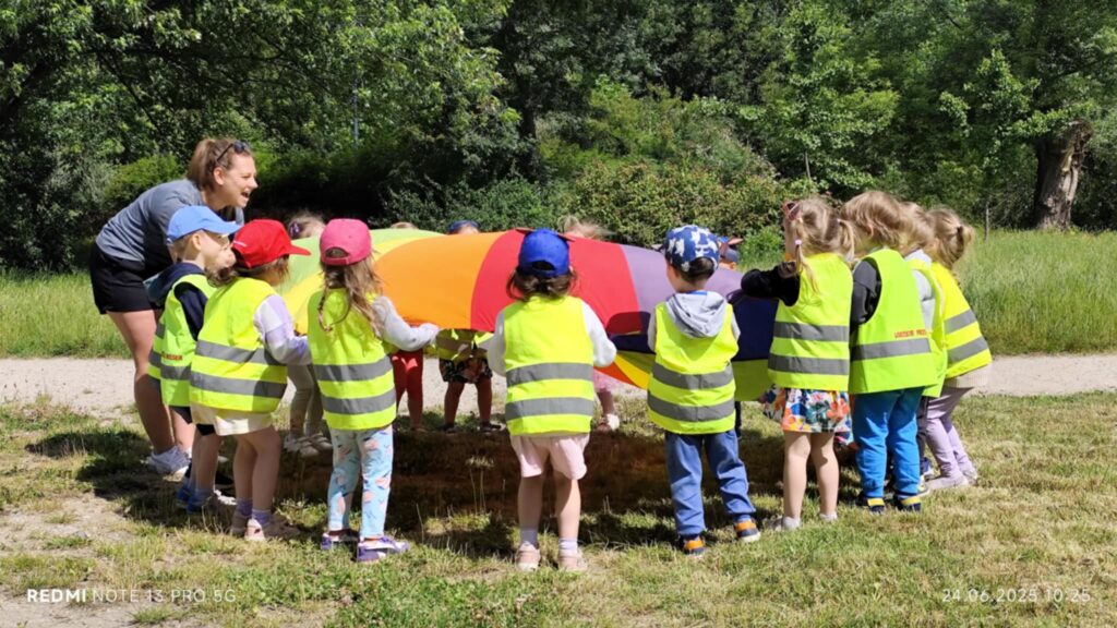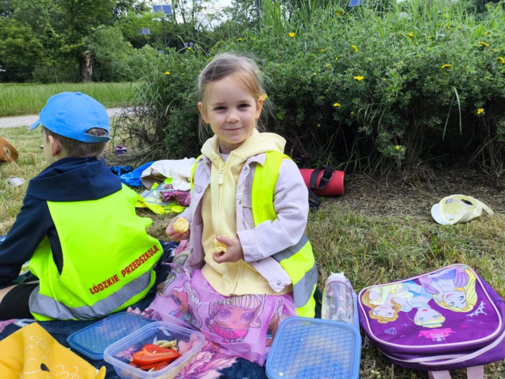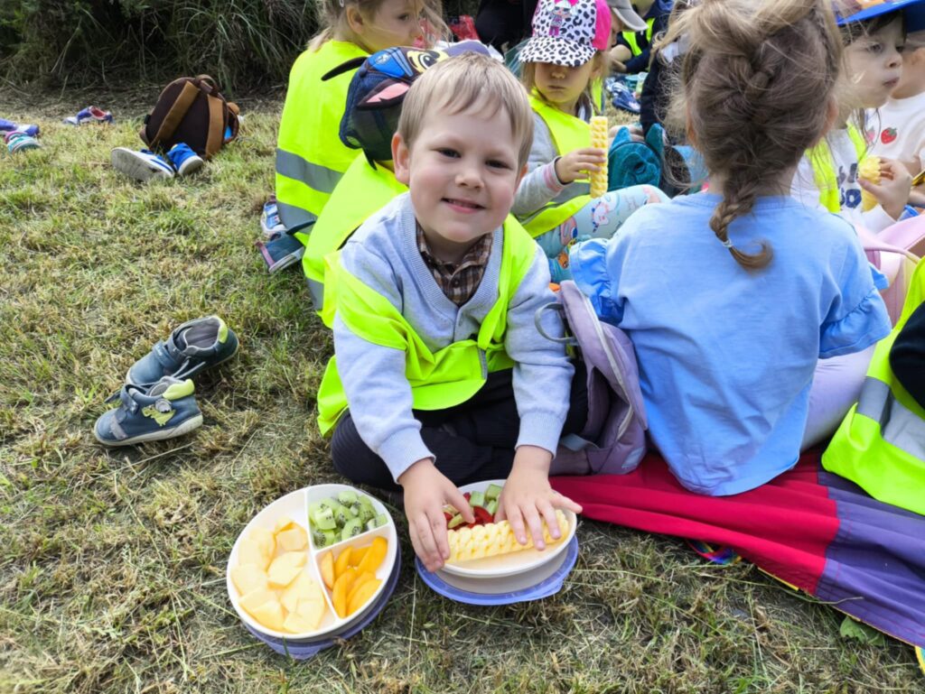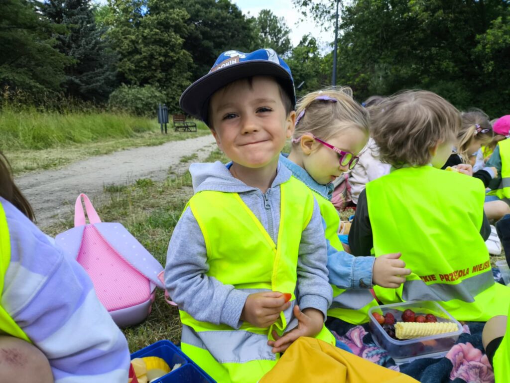 Pod koniec czerwca, aby miło spędzić wspólny czas tuż przed wakacjami, dzieci z grupy Żabek wybrały się do pobliskiego parku na piknik. Każda Żabka przygotowany miała swój prowiant – ulubione warzywa i owoce, a także wodę. Dzielnie z plecakiem na plecach ruszyliśmy przed siebie. Piknik rozpoczęliśmy od wspólnych zabaw z chustą animacyjną. Następnie zasiedliśmy wygodnie i przy wesołej muzyce spożywaliśmy przygotowane jedzenie. Ten dzień uważamy za bardzo udany, a czerwcowy piknik stanie się naszą grupową tradycją <3