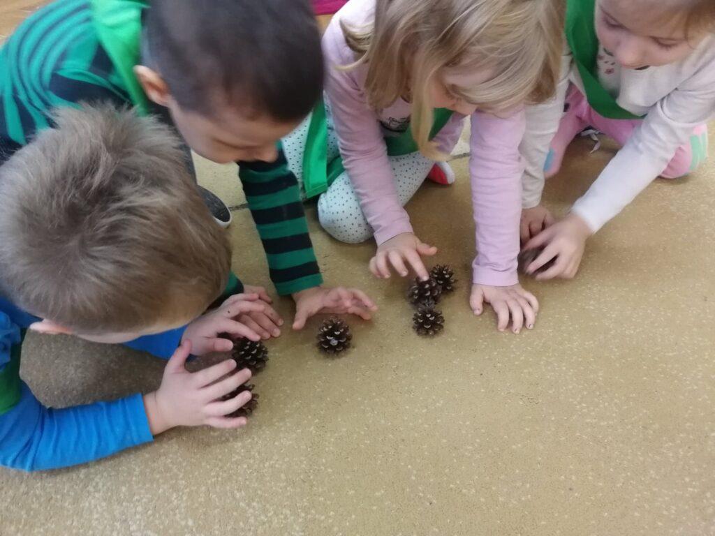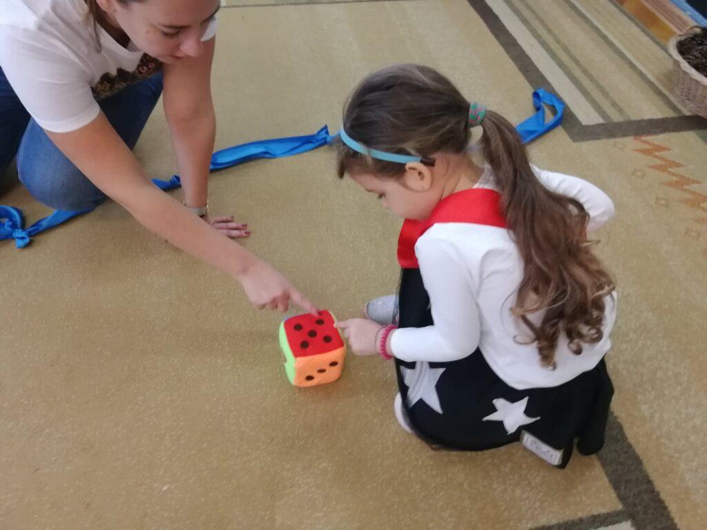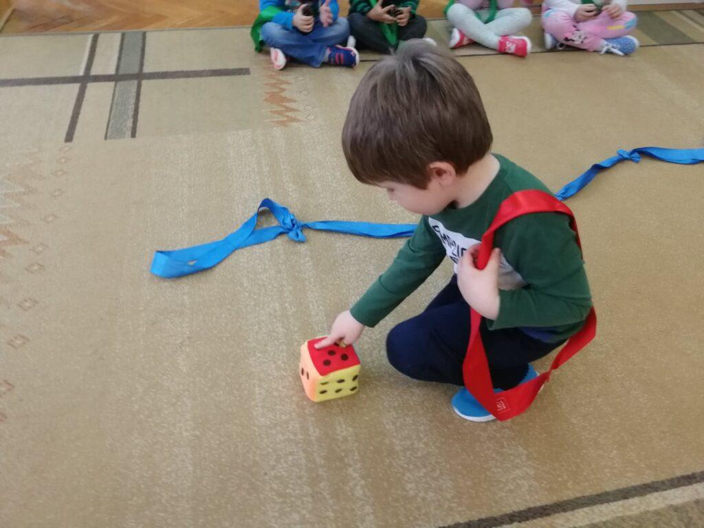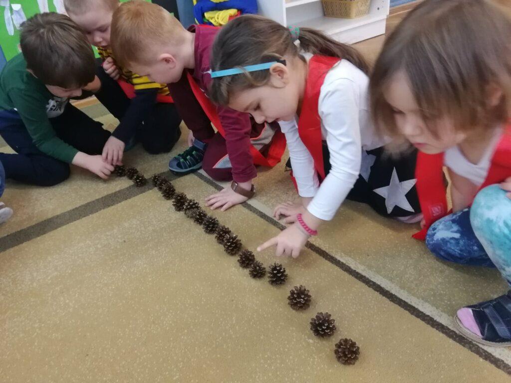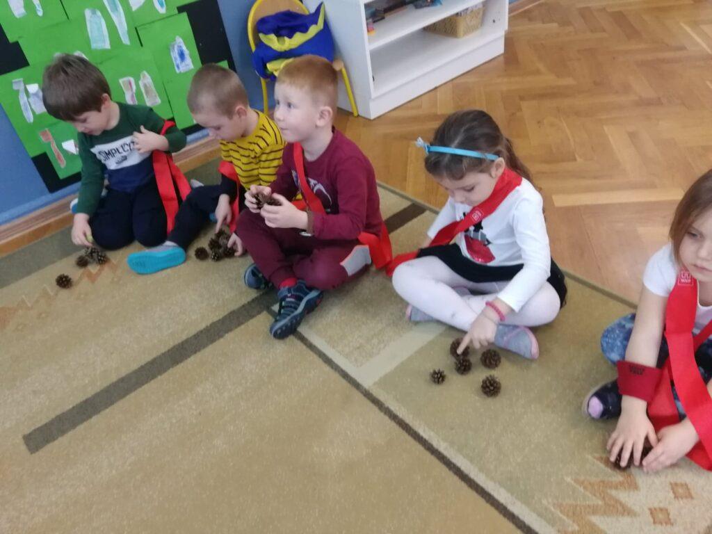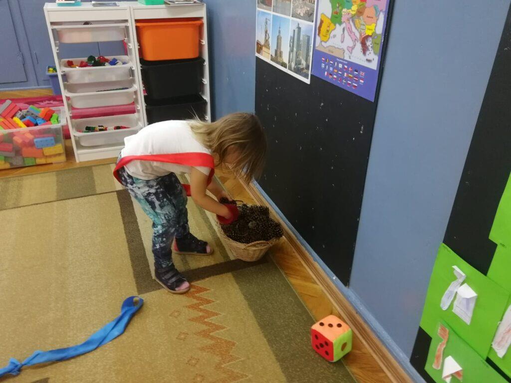 Biedronki dowiedziały się, że najdłuższą rzeką w Polsce jest Wisła. Wybraliśmy się więc na spacer wiślanym szlakiem. Gdy dzieci dotarły na sam koniec rzeki, rzucały kostką i zbierały tyle kasztanów ile wypadło oczek na kostce. Przedszkolaki doskonale wiedzą, że polskie symbole to: biało czerwona flaga, biały orzeł na czerwony tle, czyli godło, oraz hymn Polski.