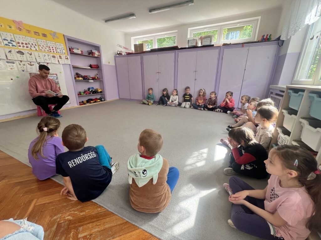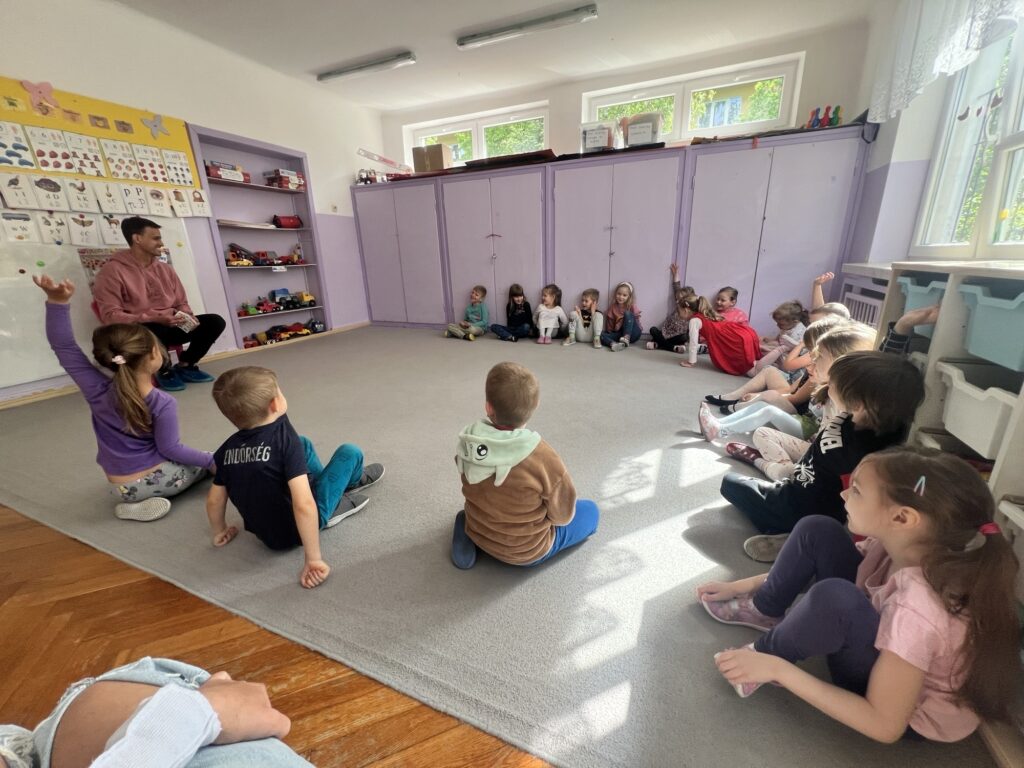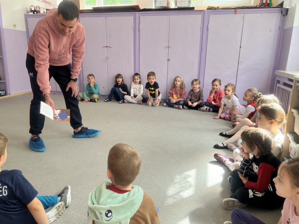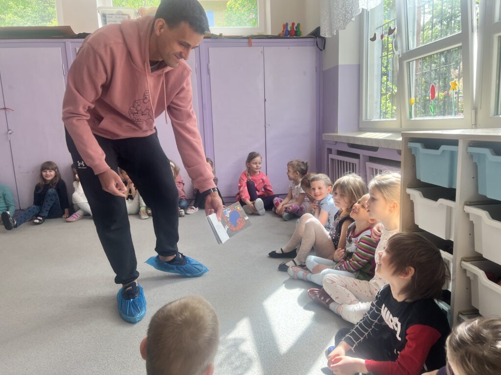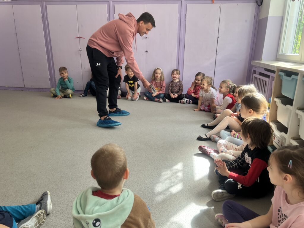 Kolejnym gościem, który odwiedził naszą grupę był tata Franka. Przeczytał nam książkę pt.”Pan Zapominalski” autorstwa Rogera Hargreavesa. Dzieciom bardzo spodobała się ta bajka, przyniosła nam wiele śmiechu.