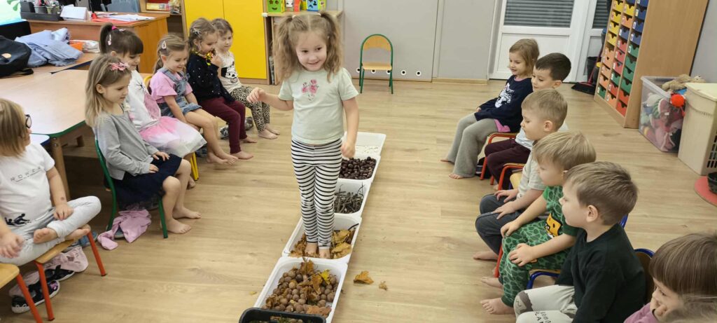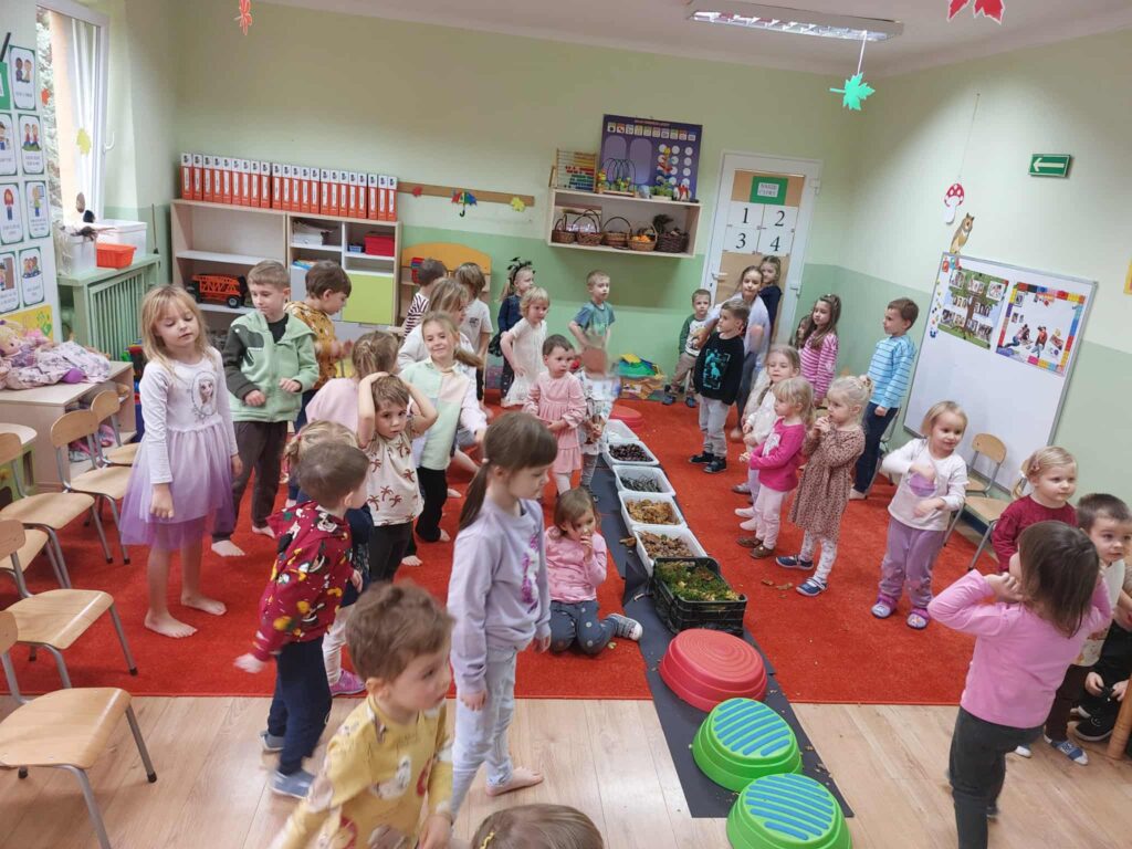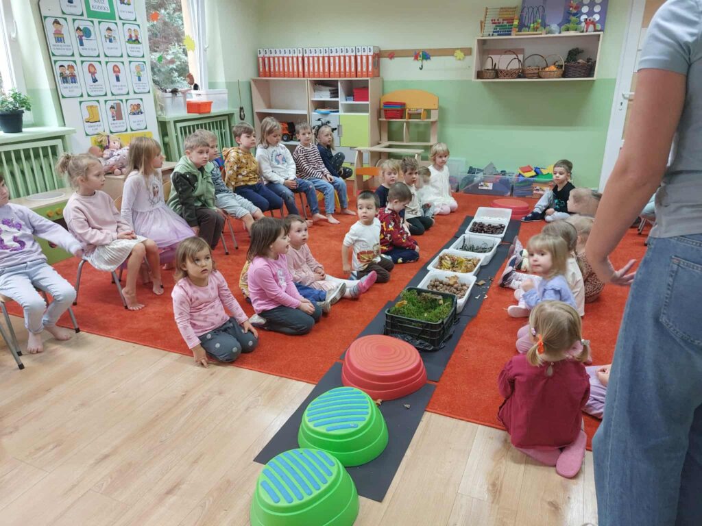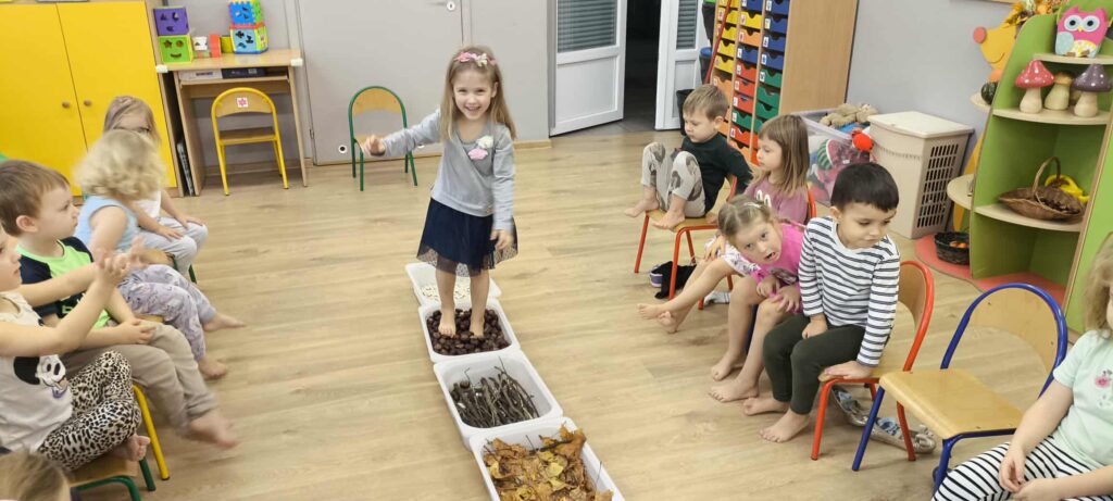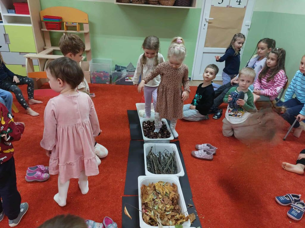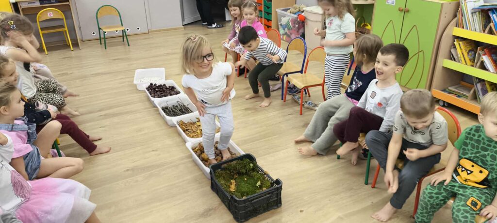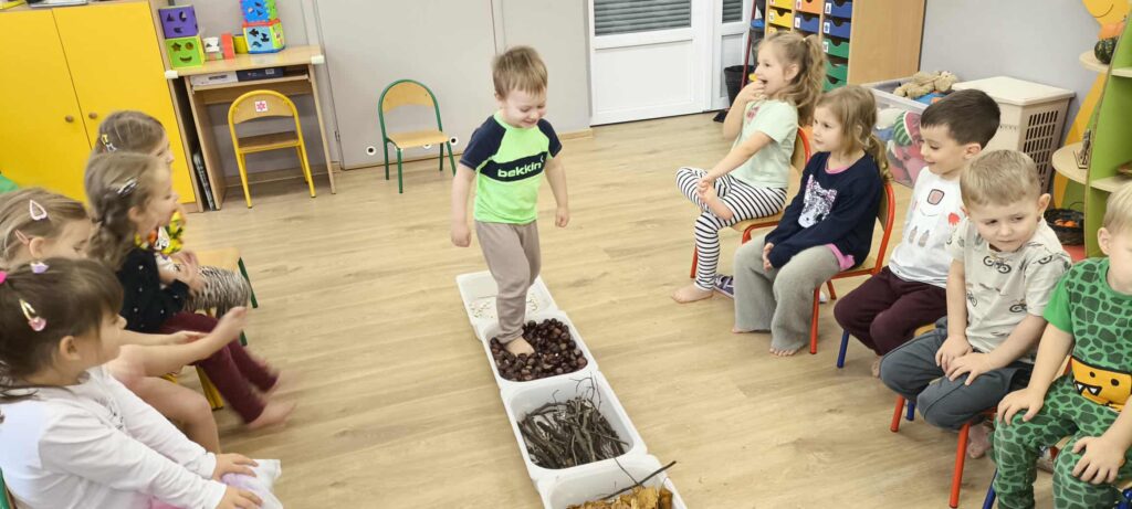 Tegoroczna jesienna pogoda jest bardzo kapryśna i nie zawsze zachęca do spacerów po parku i lesie. My postanowiłyśmy przynieść trochę lasu i parku do naszego przedszkola, aby stworzyć jesienny, sensoryczny tor przeszkód. Zbudowałyśmy ścieżkę z zebranego materiału przyrodniczego o rożnej fakturze i miękkości. Dzieci pokonywały tor doświadczając swoimi stopami. Wykorzystałyśmy kasztany, patyki, liście, mech, szyszki, orzechy. Na końcu toru każdy musiał przejść przez tajemniczą gawrę niedźwiedzia.