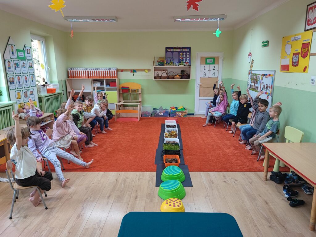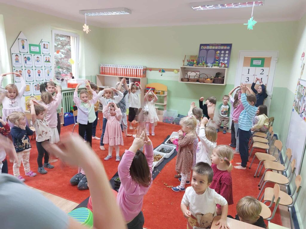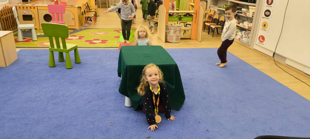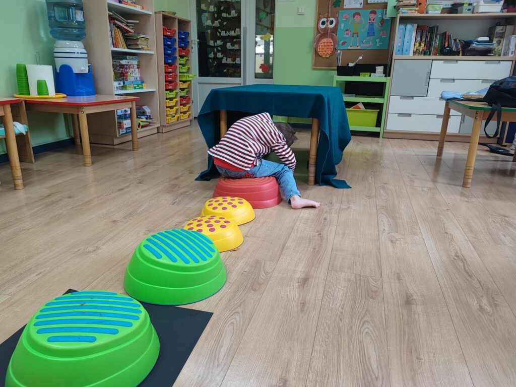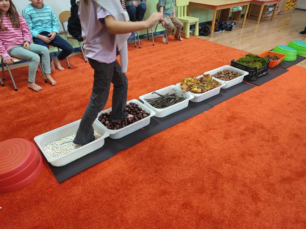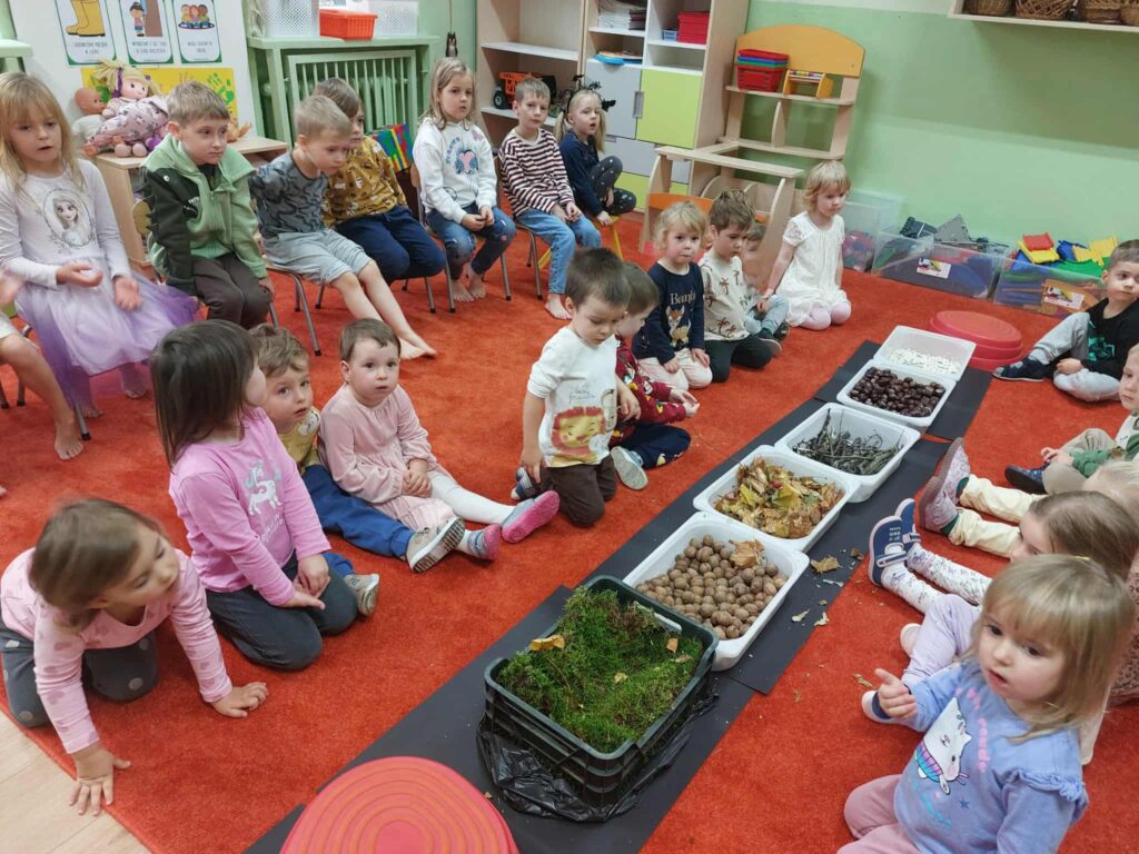 Tegoroczna jesienna pogoda jest bardzo kapryśna i nie zawsze zachęca do spacerów po parku i lesie. My postanowiłyśmy przynieść trochę lasu i parku do naszego przedszkola, aby stworzyć jesienny, sensoryczny tor przeszkód. Zbudowałyśmy ścieżkę z zebranego materiału przyrodniczego o rożnej fakturze i miękkości. Dzieci pokonywały tor doświadczając swoimi stopami. Wykorzystałyśmy kasztany, patyki, liście, mech, szyszki, orzechy. Na końcu toru każdy musiał przejść przez tajemniczą gawrę niedźwiedzia.