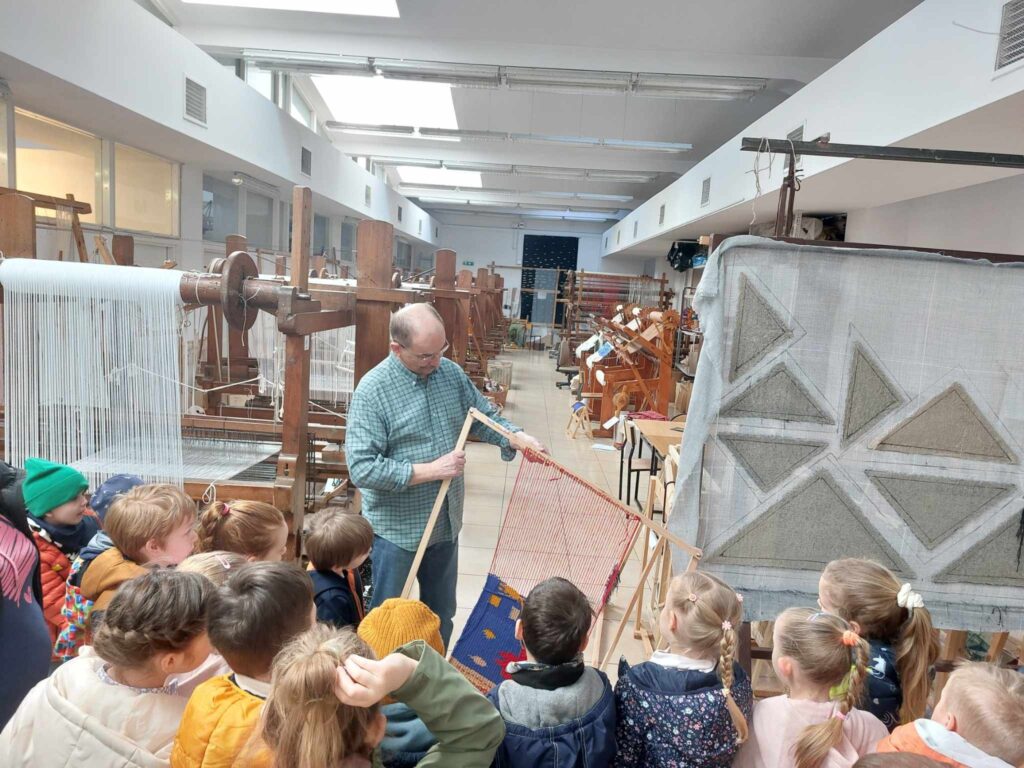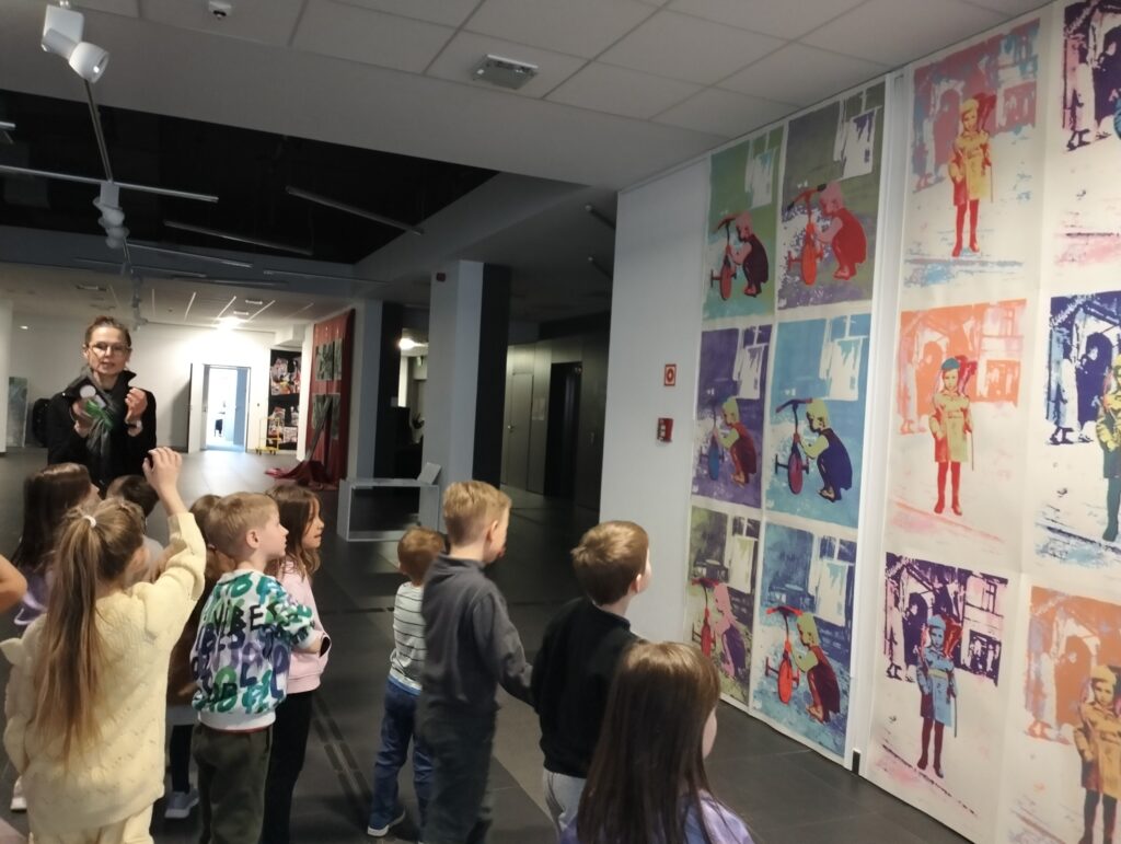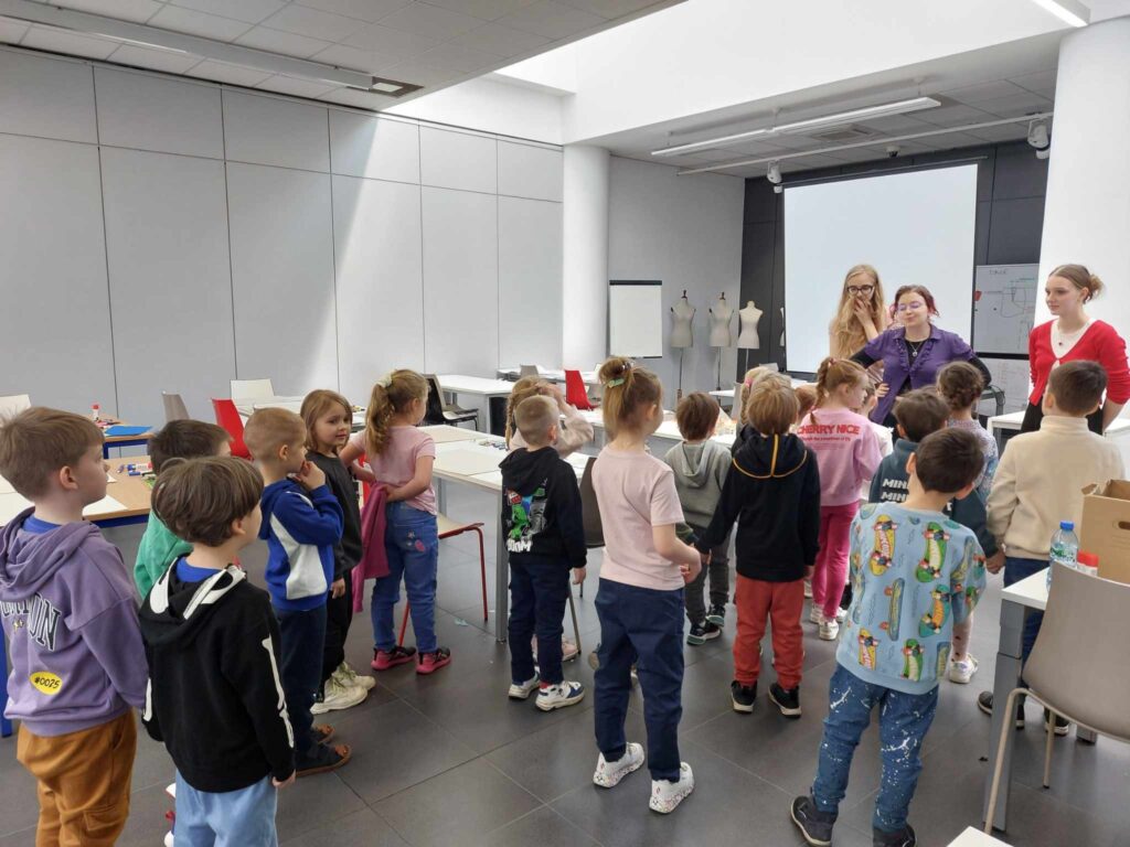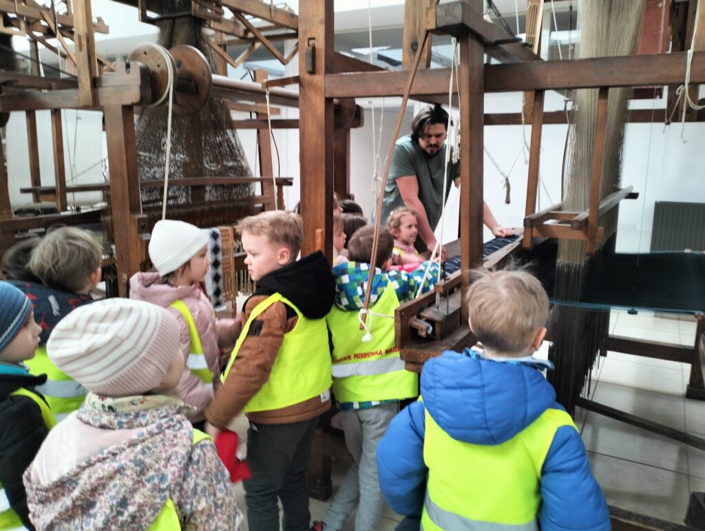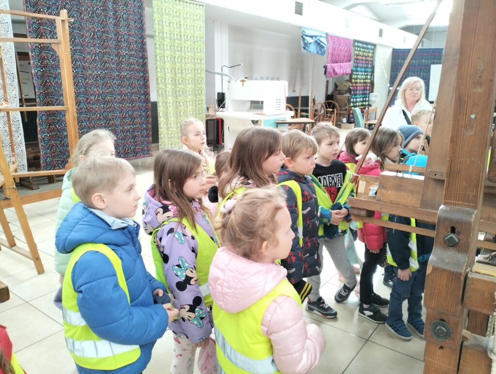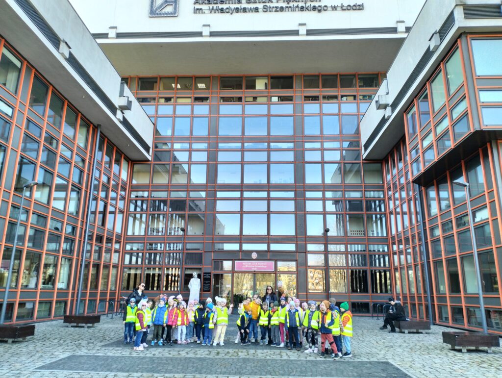 W piątek 28 marca dzieci z grupy Wiewiórek i Sów wybrały się na wycieczkę do Akademii Sztuk Pięknych. Podczas zwiedzania uczelni dzieci miały okazję zobaczyć jak powstają nici oraz tkaniny. W tym celu odwiedziły tkalnię żakardową, gdzie znajdowały się krosna żakardowe, na których studenci samodzielnie wykonują tkaniny. Przedszkolaki zwiedziły czytelnię oraz aulę, na której organizowane są pokazy mody. Miały okazję zobaczyć wystawę gier planszowych, zaprojektowanych przez studentów Akademii. Na zakończenie uczestniczyły w warsztatach plastycznych, podczas których ozdabiały płatki,które następnie wykorzystały tworząc pękny, wiosenny kwiat. Wizyta w Akademii Sztuk Pięknych bardzo się wszystkim podobała.