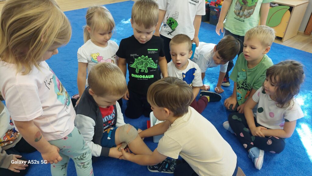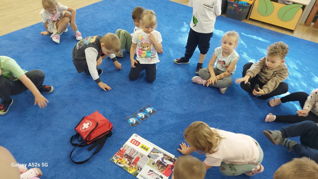 Z okazji Światowego Dnia Pierwszej Pomocy w atmosferze zabawy i bezpieczeństwa zdobywaliśmy bardzo ważne umiejętności, które kształtowały postawę troski o zdrowie i życie innych ludzi. Podczas zajęć utrwalaliśmy numery alarmowe, jak prawidłowo wezwać pomoc, jak zachować spokój i jakie informacje należy podać dyspozytorowi wzywając pomoc. Zajęciom towarzyszyły zabawy tematyczne, ruchowe i piosenki utrwalające zdobytą wiedzę.