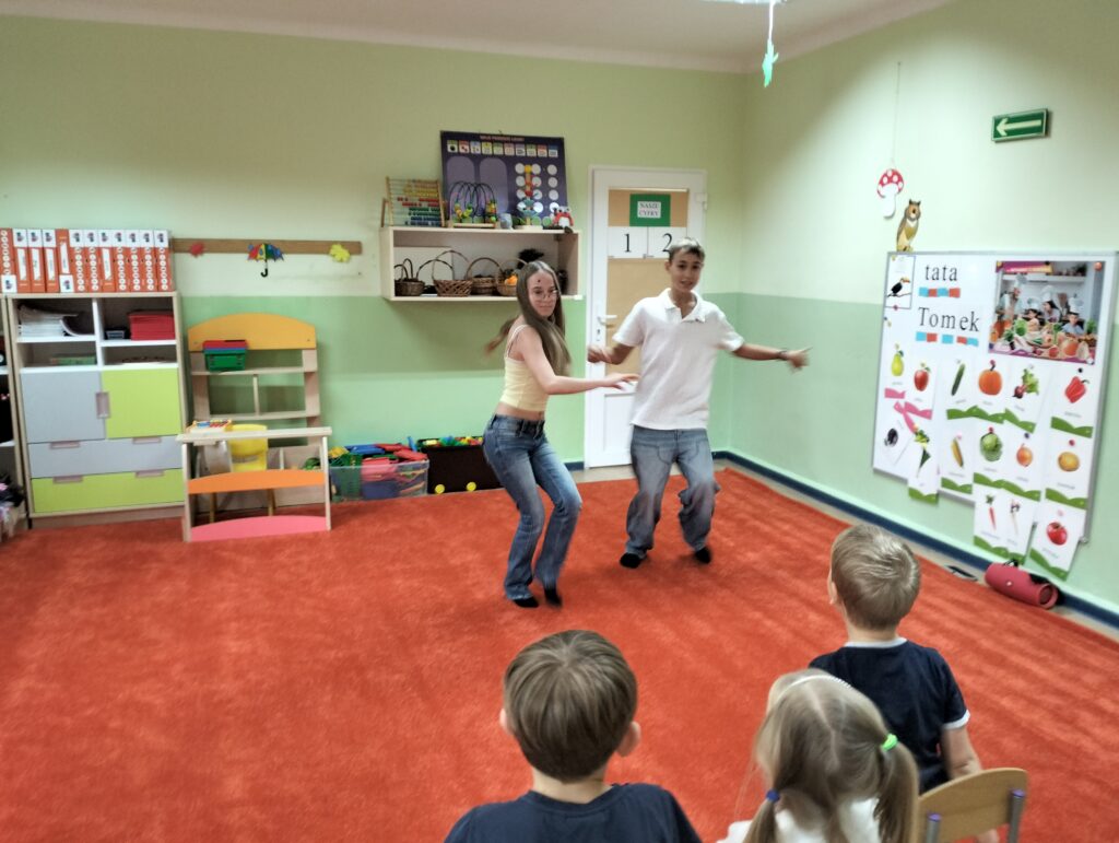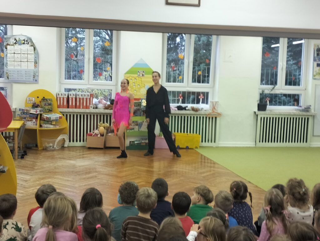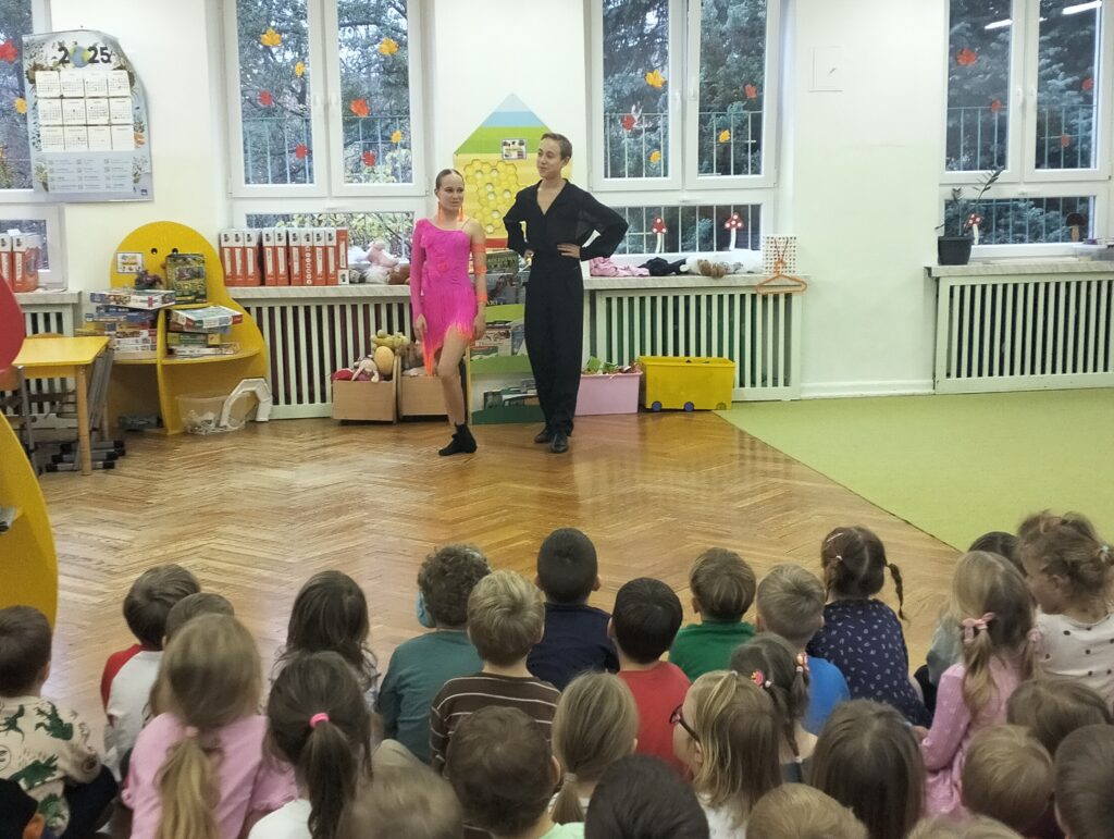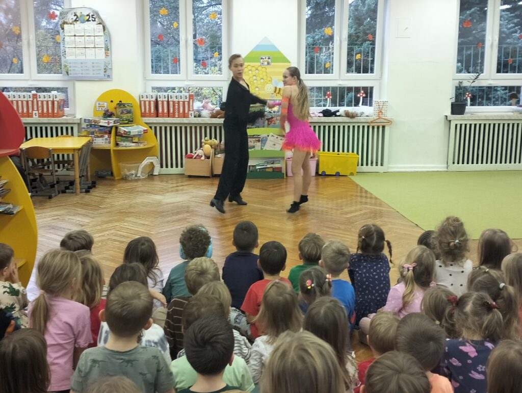 Od początku października naszą grupę w każdy poniedziałek odwiedzają uczniowie Szkoły Podstawowej Nr 120. Ola, Igor i Natasza są absolwentami naszego przedszkola. Nasze spotkania polegają na nauce tańca i wspólnych zabawach muzyczno-ruchowych. Sowy podczas spotkań uczą się podstawowych kroków tańców turniejowych. Ostatnio mieliśmy nawet okazję obejrzeć występ Igora i Nataszy, który spotkał się z wielkim entuzjazmem ze strony naszych przedszkolaków. Już nie możemy doczekać się następnego poniedziałku i odwiedzin naszych Gości.
