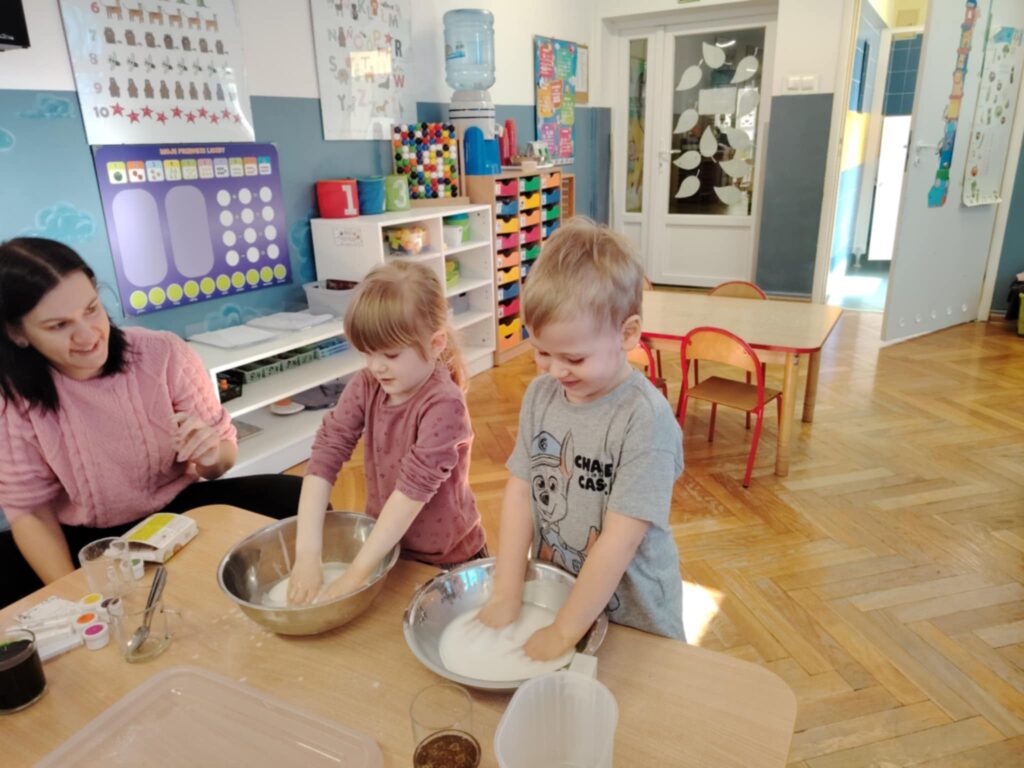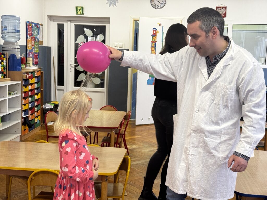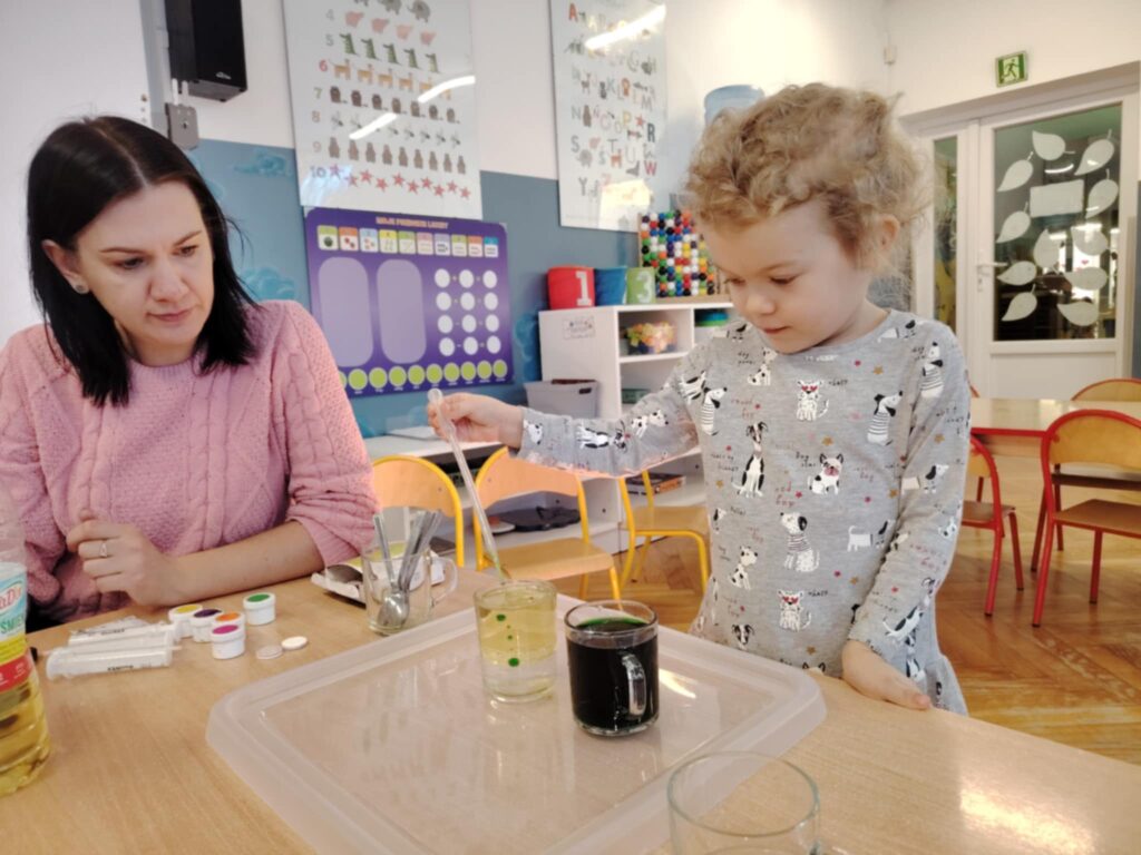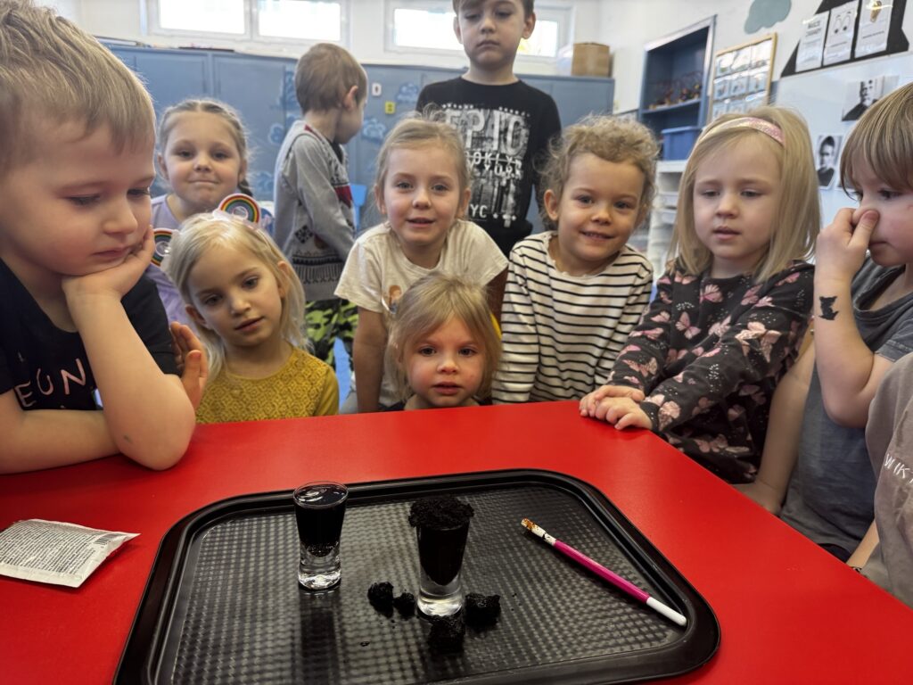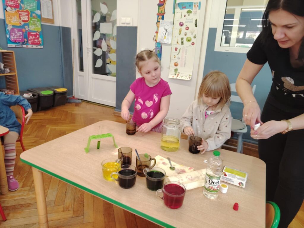 Zrobiliśmy kolorowe kwiaty, gorącą ławę z mleka, tęczę i sprężyste jajo. Eksperymentowaliśmy też z kolorami i cieczą nieniutonowską. Poznaliśmy naukowców takich jak Maria Skłodowska-Curie czy Albert Einstein.