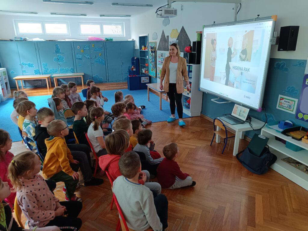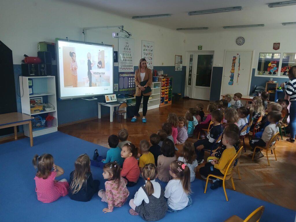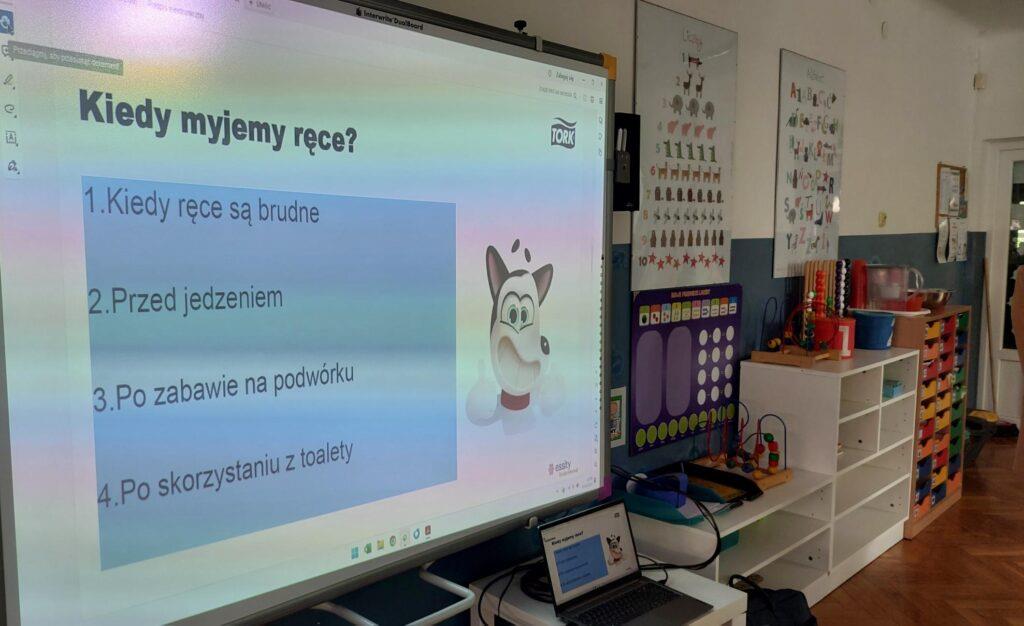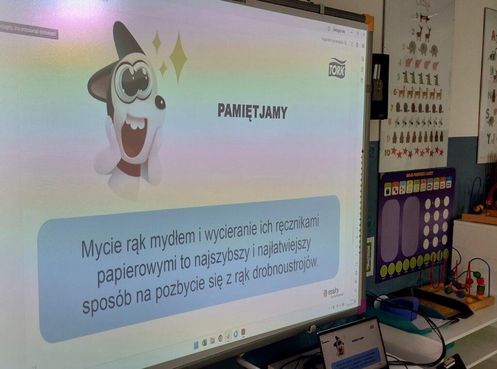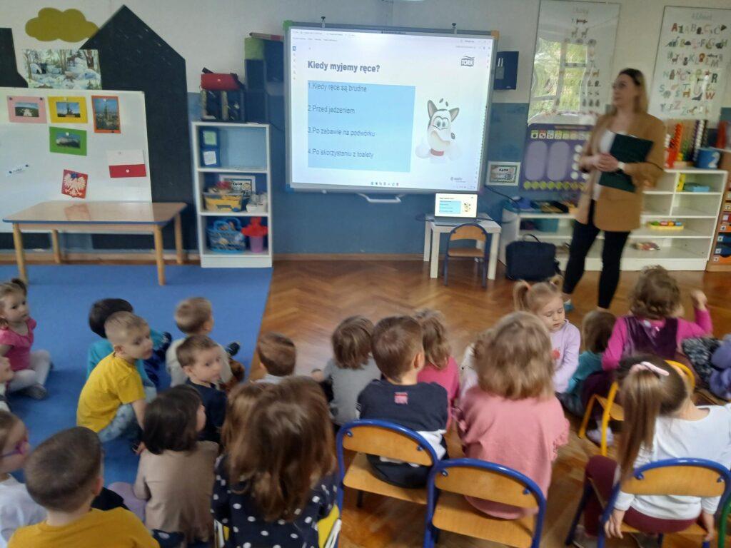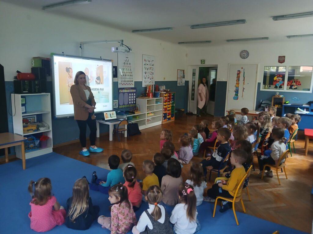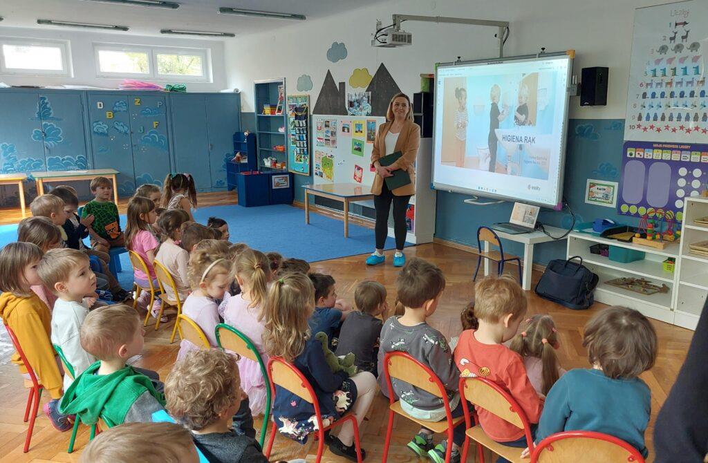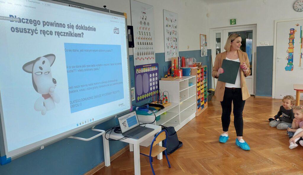 W kwietniu nasze przedszkole odwiedziła Pani Hania z firmy TORK. Przeprowadziła spotkanie z naszymi przedszkolakami by wspólnie utrwalić wiadomości dotyczące higieny rąk. Pani Hania zapoznała dzieci z „pieskiem Ciapkiem” bohaterem prezentacji multimedialnej „Higiena rąk”, który pomagał prowadzącej pokazywać dzieciom: jaki sposób powitania jest najbardziej higieniczny, by uniknąć rozprzestrzenia się bakterii i wirusów. W ramach spotkania był również instruktaż mycia rąk zgodnie z wytycznymi organizacji zdrowia. Dzieci oglądały również wyniki przeprowadzonych doświadczeń dotyczących namnażania się bakterii chorobotwórczych oraz wspólnie z Panią Hania i „Ciapkiem” wyciągały wnioski. Dzieci chętnie odpowiadały na różne pytania z zasad higieny i zdrowego trybu życia. Pani prowadząca była pod dużym wrażeniem wiedzy i zaangażowania naszych przedszkolaków, które wykazały się ogromną wiedzą z zakresu higieny rąk. Na zakończenie spotkania przedszkolaki otrzymały dyplomy „Mistrz Higieny Rąk”. Dziękujemy za miłe spotkanie ?.
