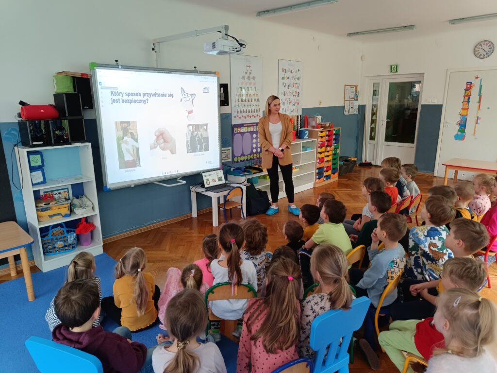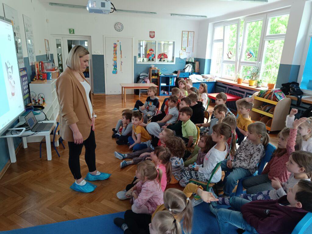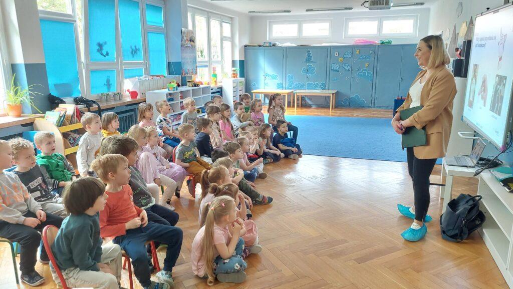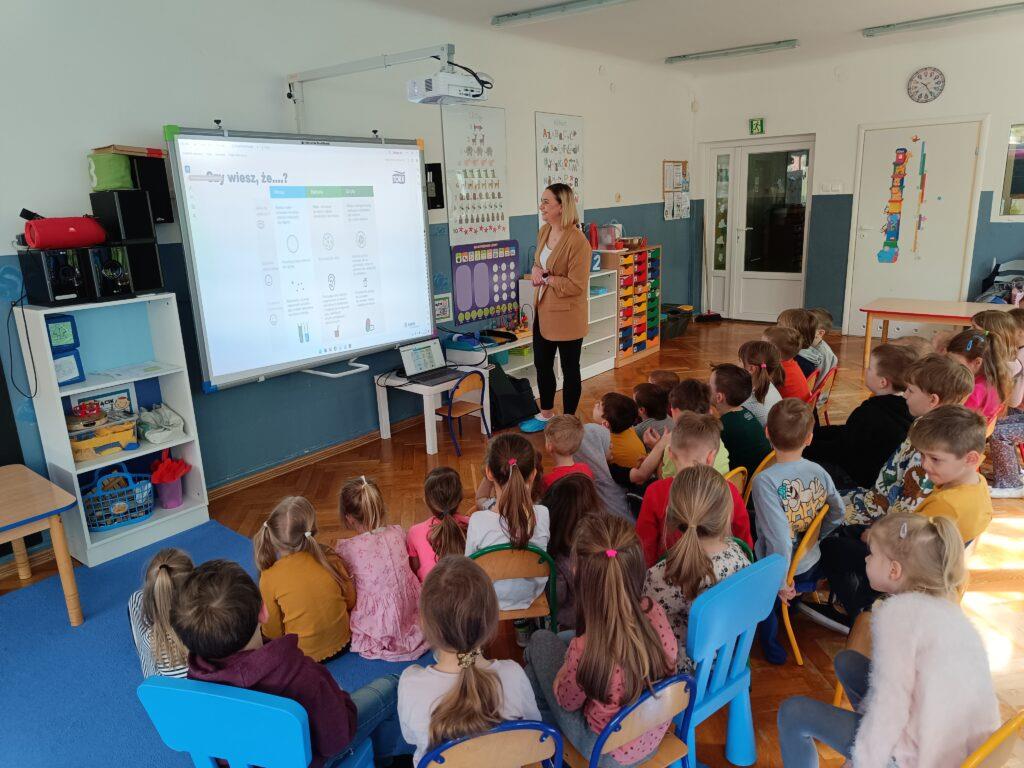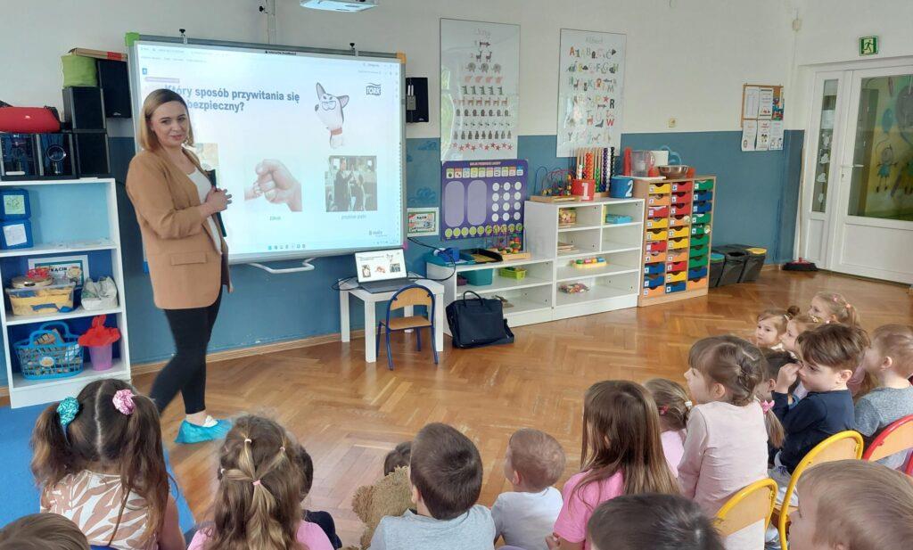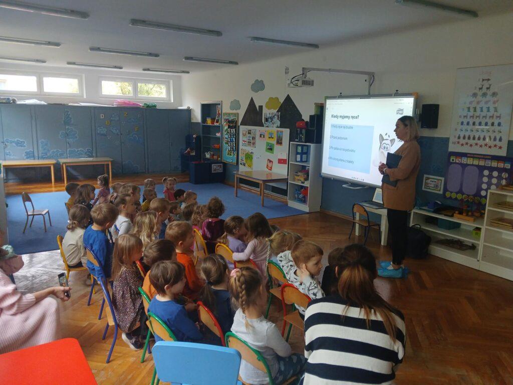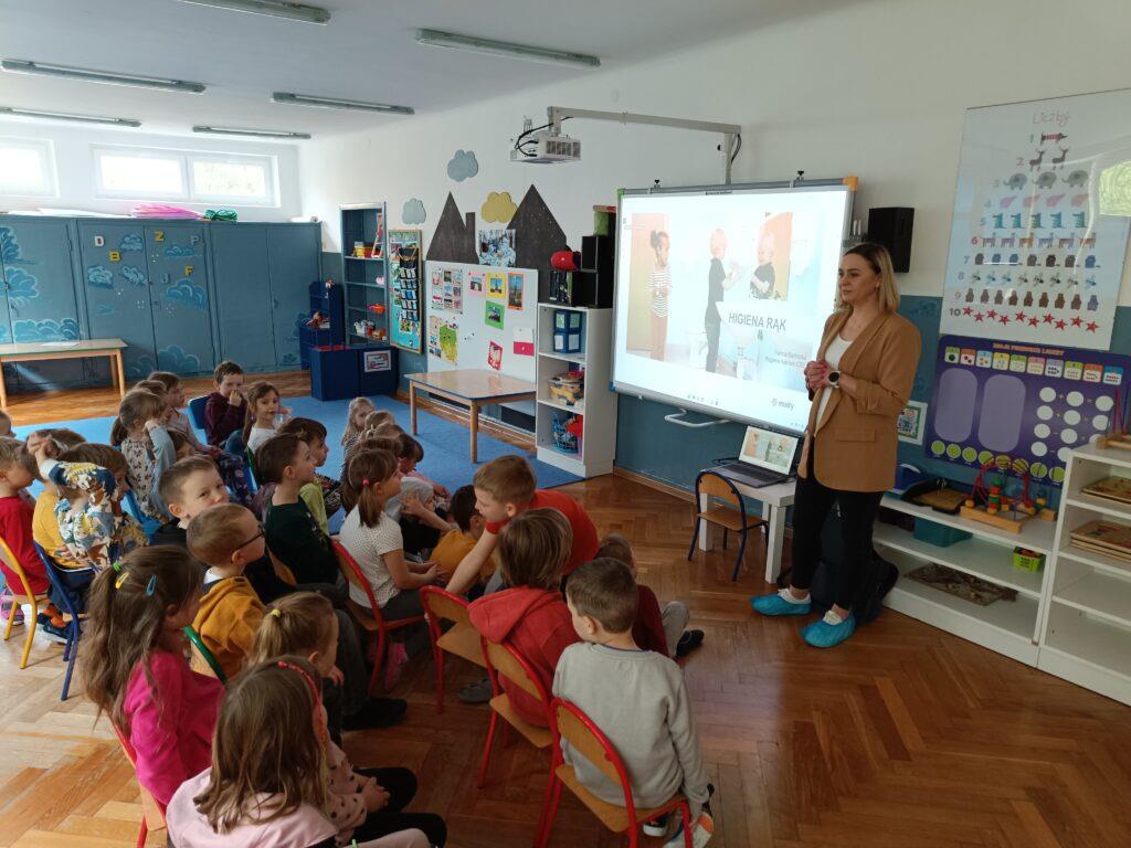 W kwietniu nasze przedszkole odwiedziła Pani Hania z firmy TORK. Przeprowadziła spotkanie z naszymi przedszkolakami by wspólnie utrwalić wiadomości dotyczące higieny rąk. Pani Hania zapoznała dzieci z „pieskiem Ciapkiem” bohaterem prezentacji multimedialnej „Higiena rąk”, który pomagał prowadzącej pokazywać dzieciom: jaki sposób powitania jest najbardziej higieniczny, by uniknąć rozprzestrzenia się bakterii i wirusów. W ramach spotkania był również instruktaż mycia rąk zgodnie z wytycznymi organizacji zdrowia. Dzieci oglądały również wyniki przeprowadzonych doświadczeń dotyczących namnażania się bakterii chorobotwórczych oraz wspólnie z Panią Hania i „Ciapkiem” wyciągały wnioski. Dzieci chętnie odpowiadały na różne pytania z zasad higieny i zdrowego trybu życia. Pani prowadząca była pod dużym wrażeniem wiedzy i zaangażowania naszych przedszkolaków, które wykazały się ogromną wiedzą z zakresu higieny rąk. Na zakończenie spotkania przedszkolaki otrzymały dyplomy „Mistrz Higieny Rąk”. Dziękujemy za miłe spotkanie ?.