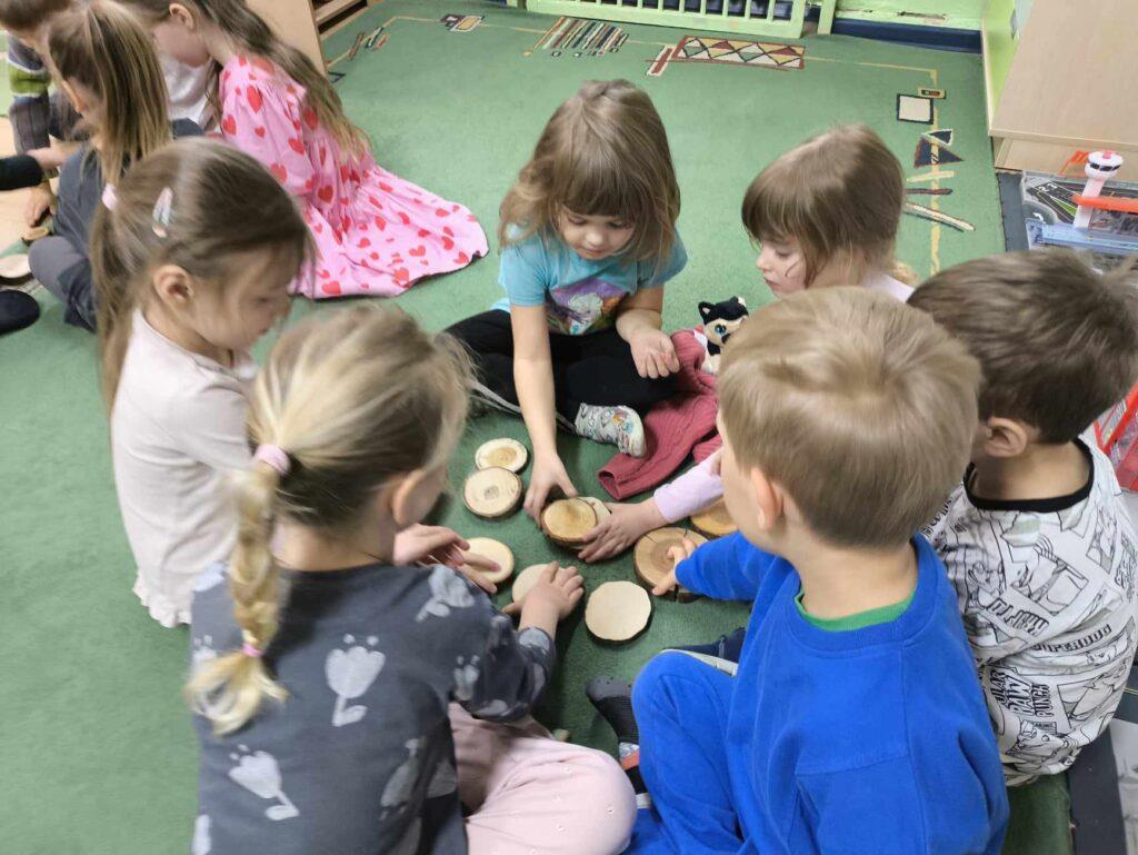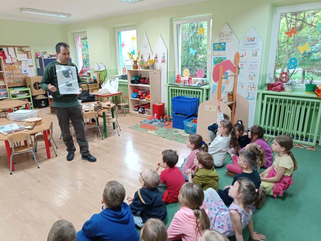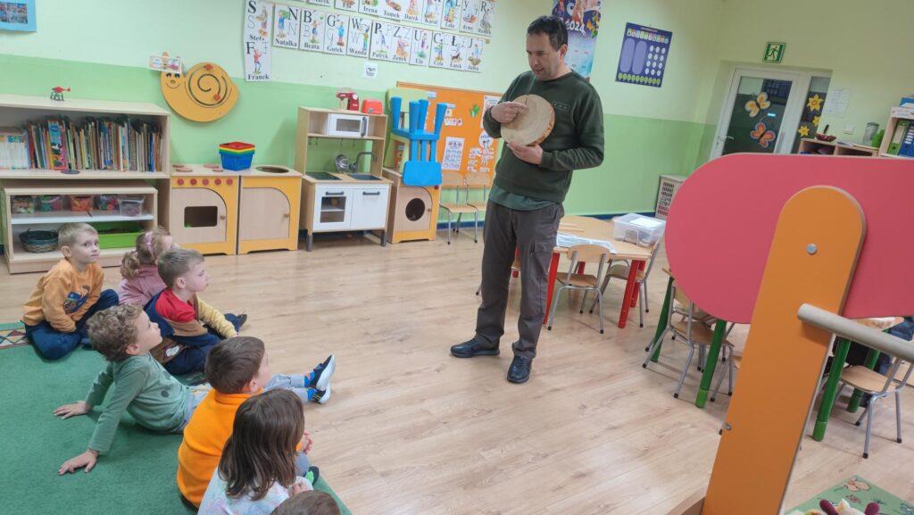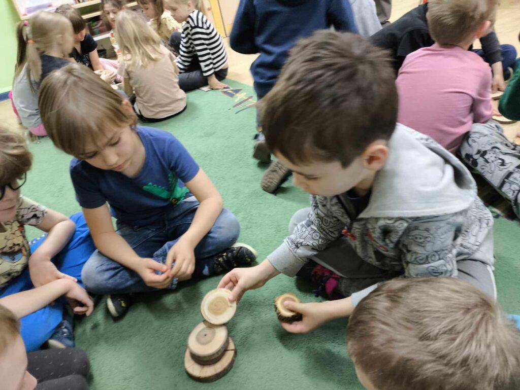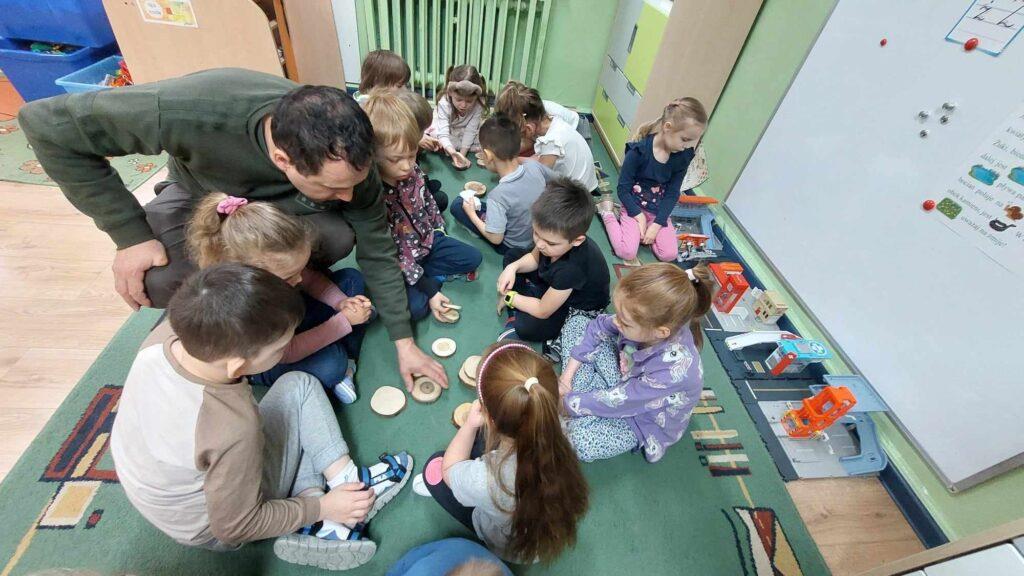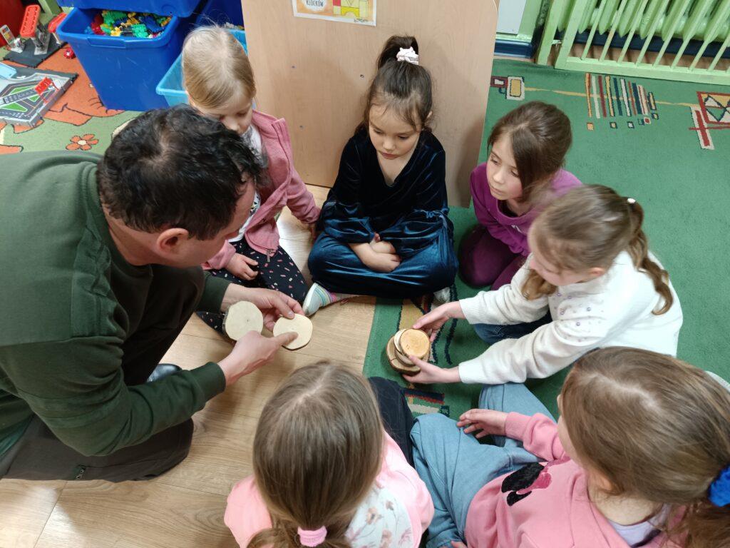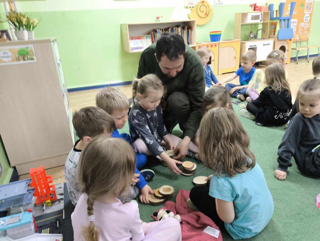 W kwietni gościliśmy u nas w przedszkolu znawcę drzew. Pan, który nas odwiedził opowiedział nam o tym jak drzewa się rozsiewają, jak są zbudowane. Mogliśmy przyjrzeć się przekrojowi pnia oraz nauczyliśmy się jak policzyć wiek drzewa. Mogliśmy porównać wagę drzewa zwykłego oraz drzewa bambusowego. Listewka z drzewa bambusowego była wyjątkowo leciutka. Przedszkolaki na koniec rozwiązywały zadania, które Pan dla nich przygotował – układały plastry drzew od najmłodszego do najstarszego oraz dzieliły krążki drzewa na owocowe i zwykłe. W prezencie dzieci dostały kawałek plastru drewna w postaci magnesu. To były bardzo ciekawe zajęcia!
