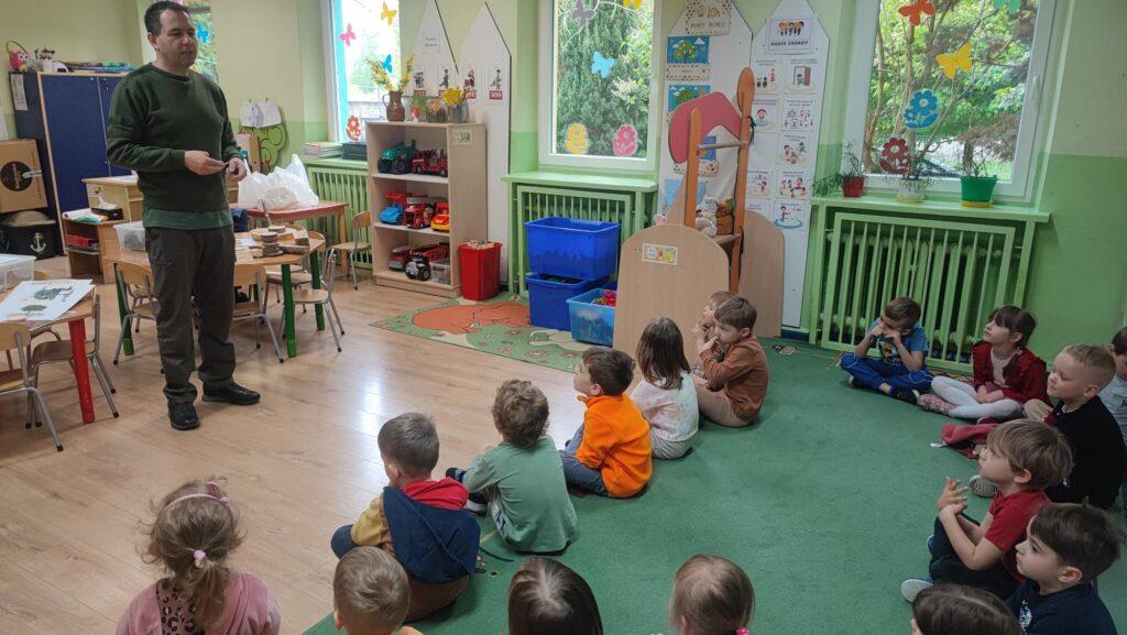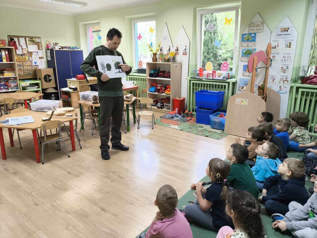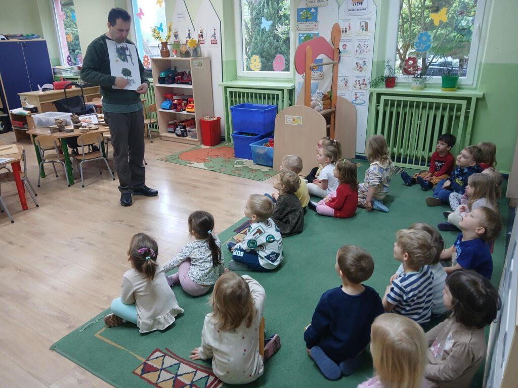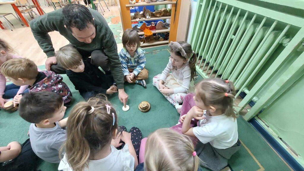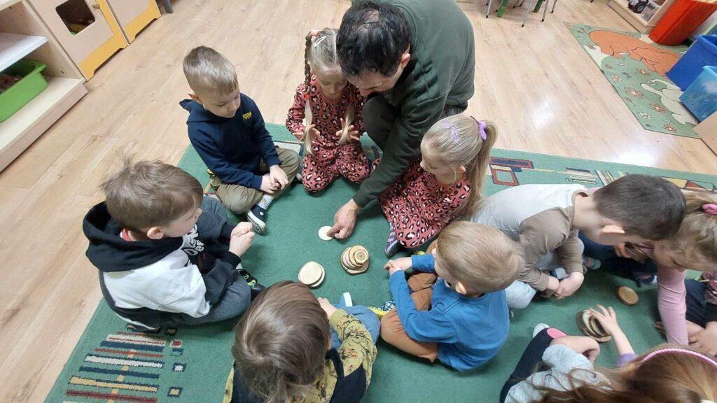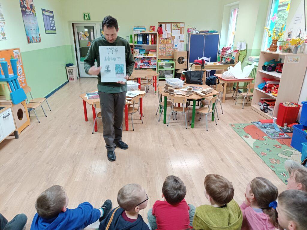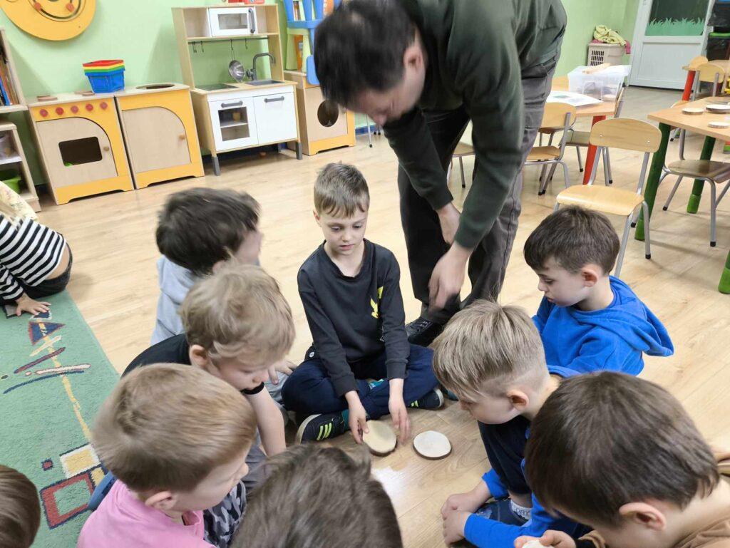 W kwietni gościliśmy u nas w przedszkolu znawcę drzew. Pan, który nas odwiedził opowiedział nam o tym jak drzewa się rozsiewają, jak są zbudowane. Mogliśmy przyjrzeć się przekrojowi pnia oraz nauczyliśmy się jak policzyć wiek drzewa. Mogliśmy porównać wagę drzewa zwykłego oraz drzewa bambusowego. Listewka z drzewa bambusowego była wyjątkowo leciutka. Przedszkolaki na koniec rozwiązywały zadania, które Pan dla nich przygotował – układały plastry drzew od najmłodszego do najstarszego oraz dzieliły krążki drzewa na owocowe i zwykłe. W prezencie dzieci dostały kawałek plastru drewna w postaci magnesu. To były bardzo ciekawe zajęcia!