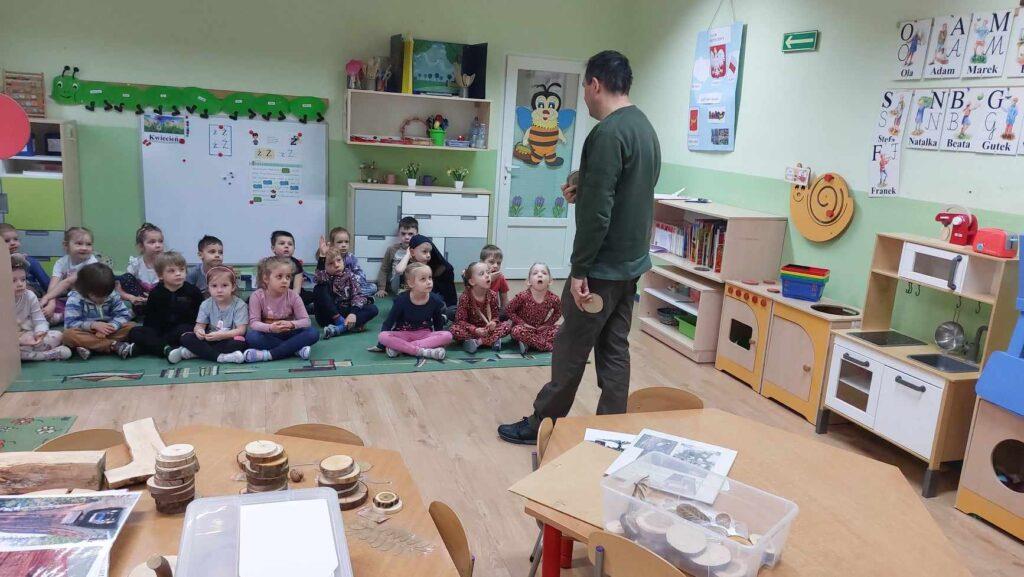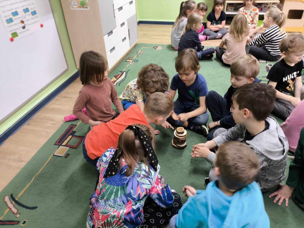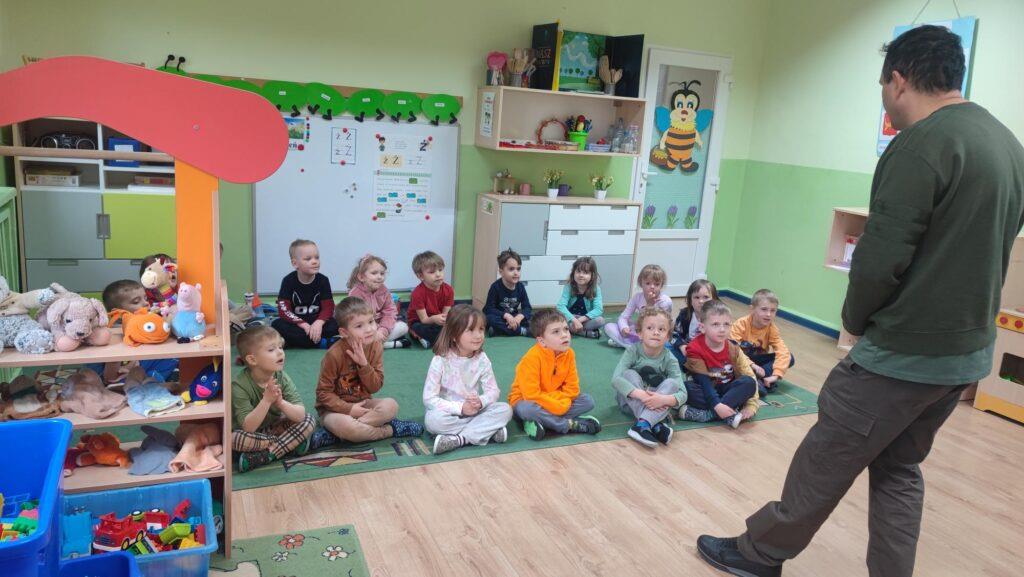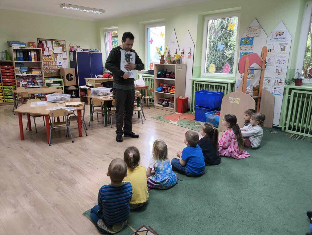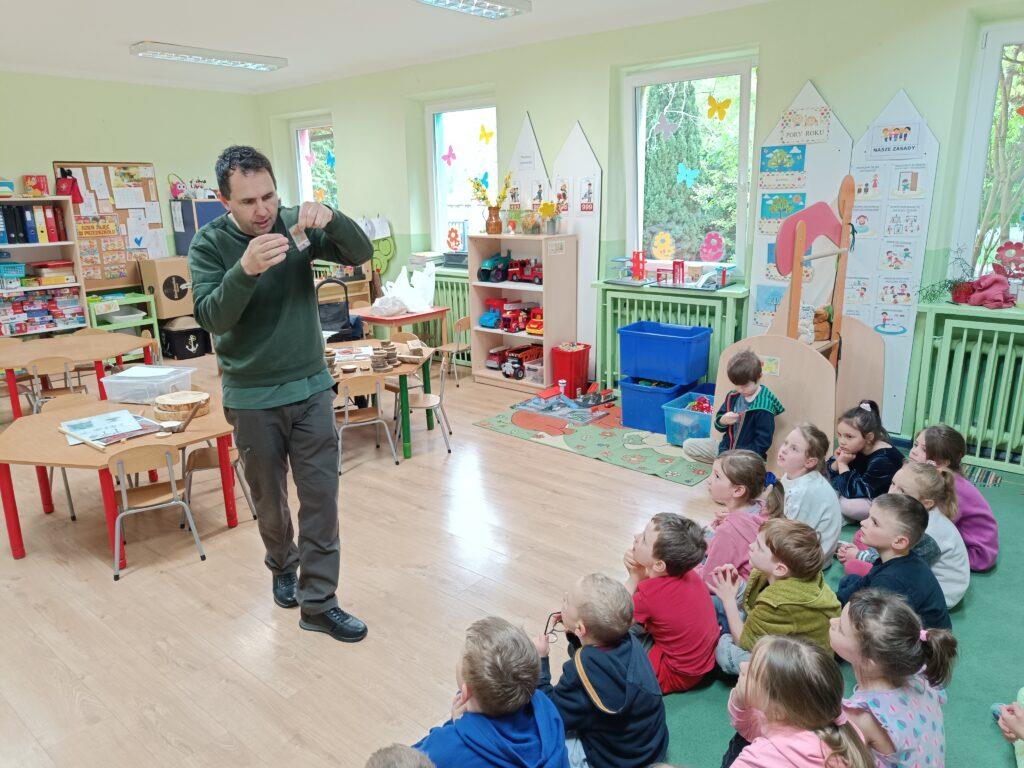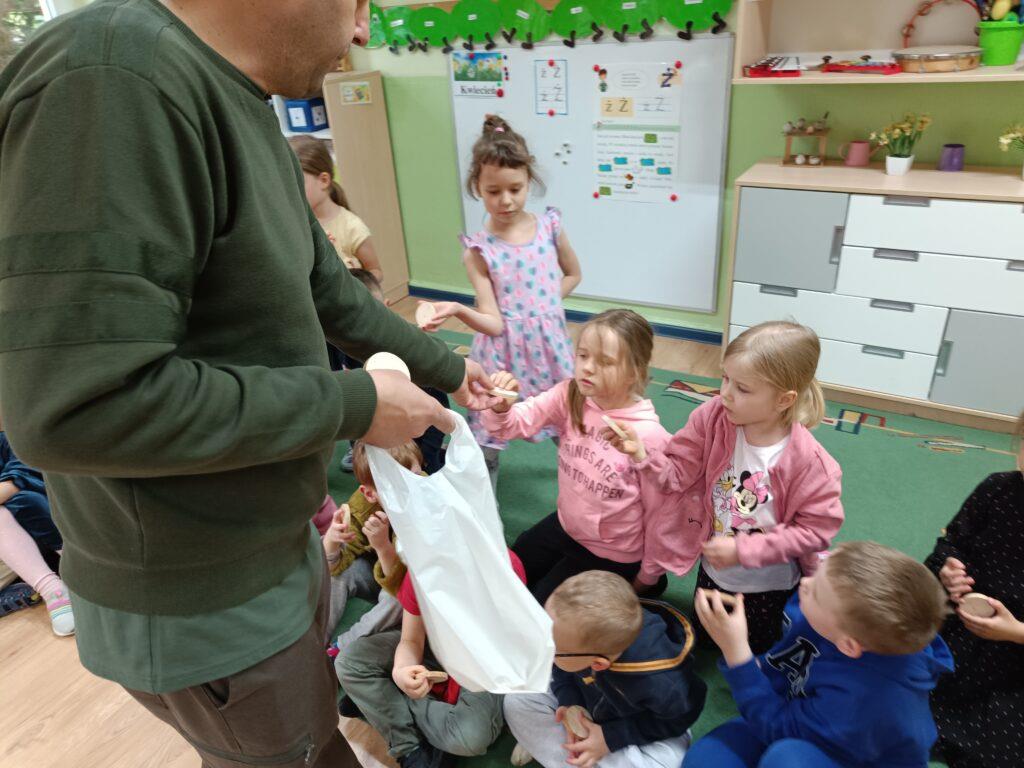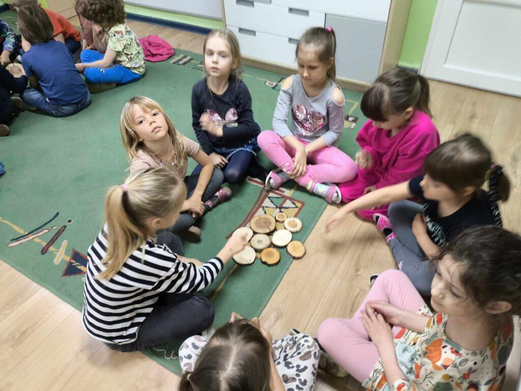 W kwietni gościliśmy u nas w przedszkolu znawcę drzew. Pan, który nas odwiedził opowiedział nam o tym jak drzewa się rozsiewają, jak są zbudowane. Mogliśmy przyjrzeć się przekrojowi pnia oraz nauczyliśmy się jak policzyć wiek drzewa. Mogliśmy porównać wagę drzewa zwykłego oraz drzewa bambusowego. Listewka z drzewa bambusowego była wyjątkowo leciutka. Przedszkolaki na koniec rozwiązywały zadania, które Pan dla nich przygotował – układały plastry drzew od najmłodszego do najstarszego oraz dzieliły krążki drzewa na owocowe i zwykłe. W prezencie dzieci dostały kawałek plastru drewna w postaci magnesu. To były bardzo ciekawe zajęcia!