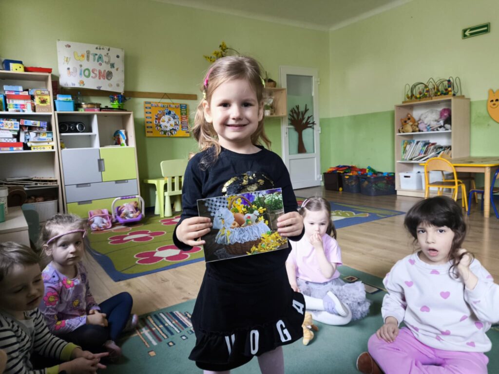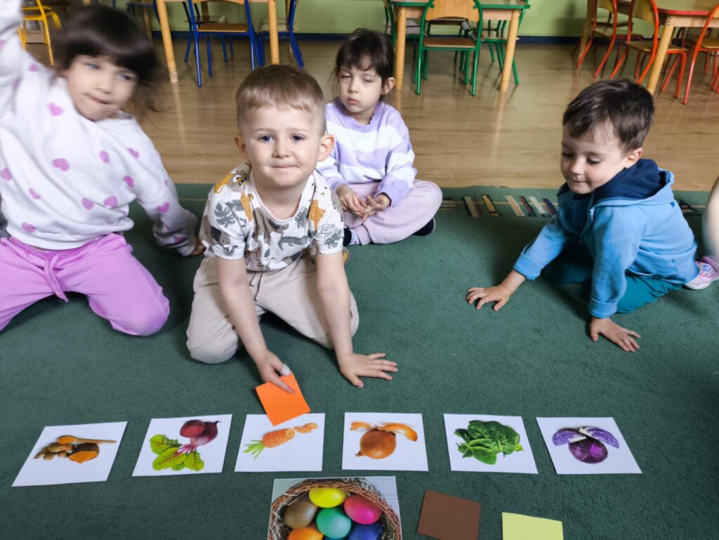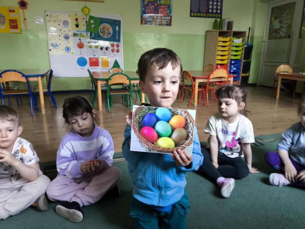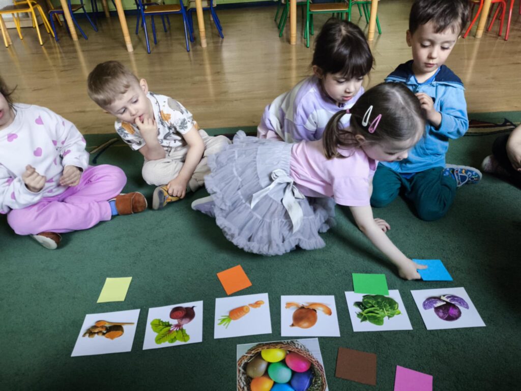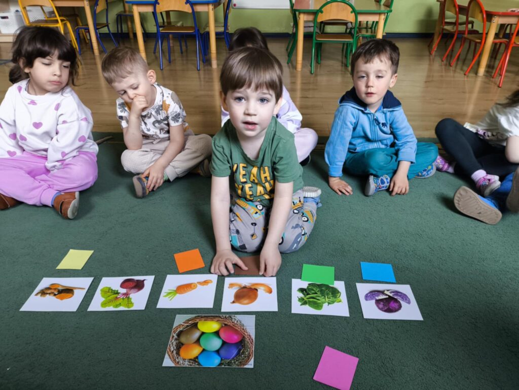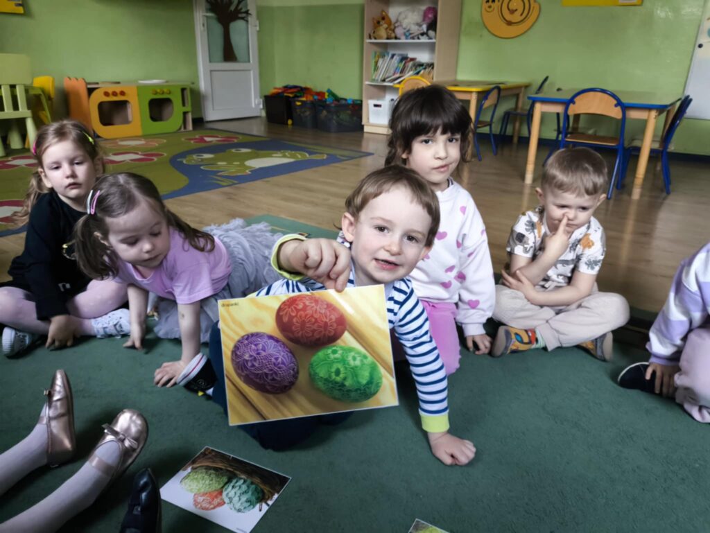 Przed świętami wielkanocnymi rozmawialiśmy o tradycjach związane z tym świętem. Dowiedzieliśmy się, że pisanki mają dużo różnych nazw np. kraszanki, wyklejanki, oklejanki. Przyjrzeliśmy się także w jaki sposób można zabarwić naturalnie jajka. Dzieci podczas przygotowywania swojego koszyczka wielkanocnego, wykonały w domu eksperyment barwienia jajek cebulą, kurkumą