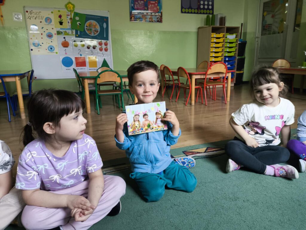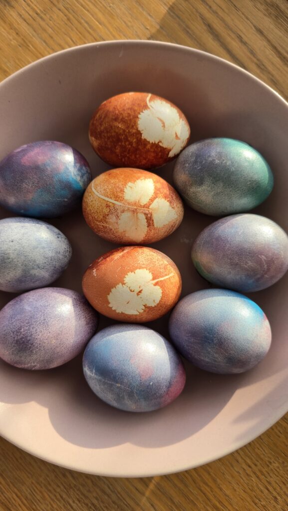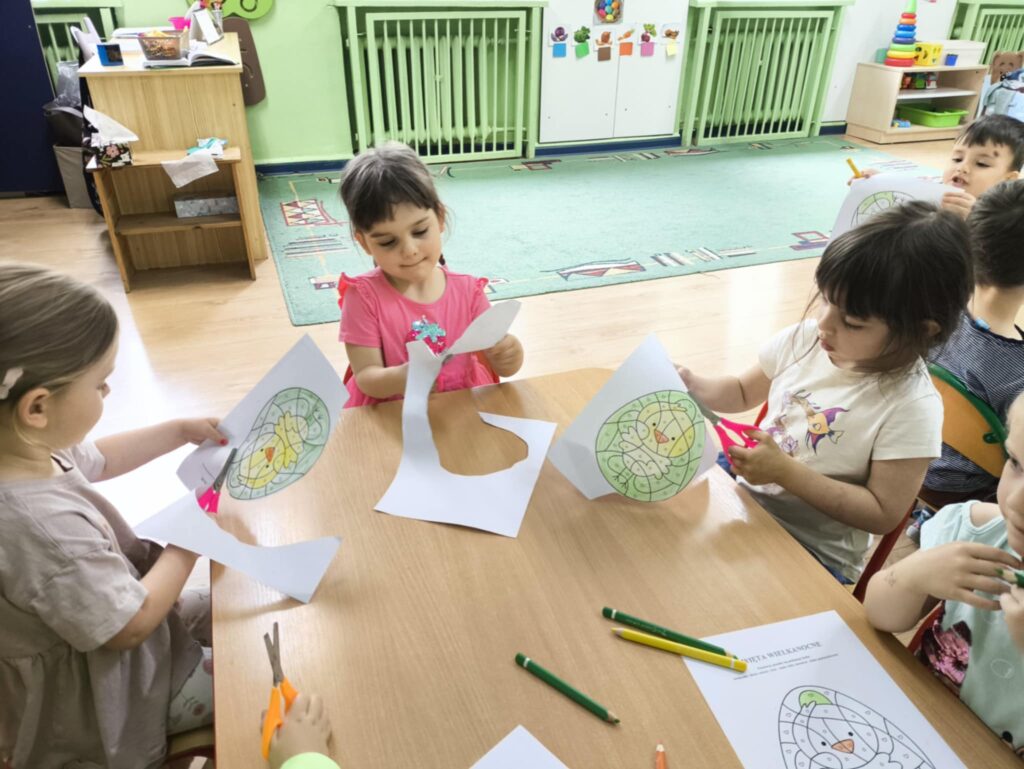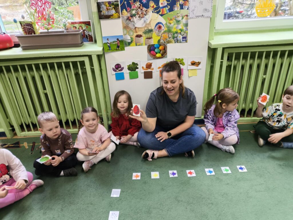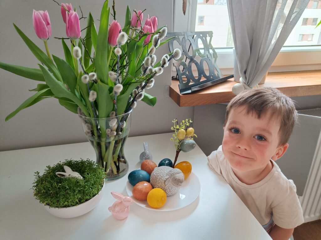 Przed świętami wielkanocnymi rozmawialiśmy o tradycjach związane z tym świętem. Dowiedzieliśmy się, że pisanki mają dużo różnych nazw np. kraszanki, wyklejanki, oklejanki. Przyjrzeliśmy się także w jaki sposób można zabarwić naturalnie jajka. Dzieci podczas przygotowywania swojego koszyczka wielkanocnego, wykonały w domu eksperyment barwienia jajek cebulą, kurkumą