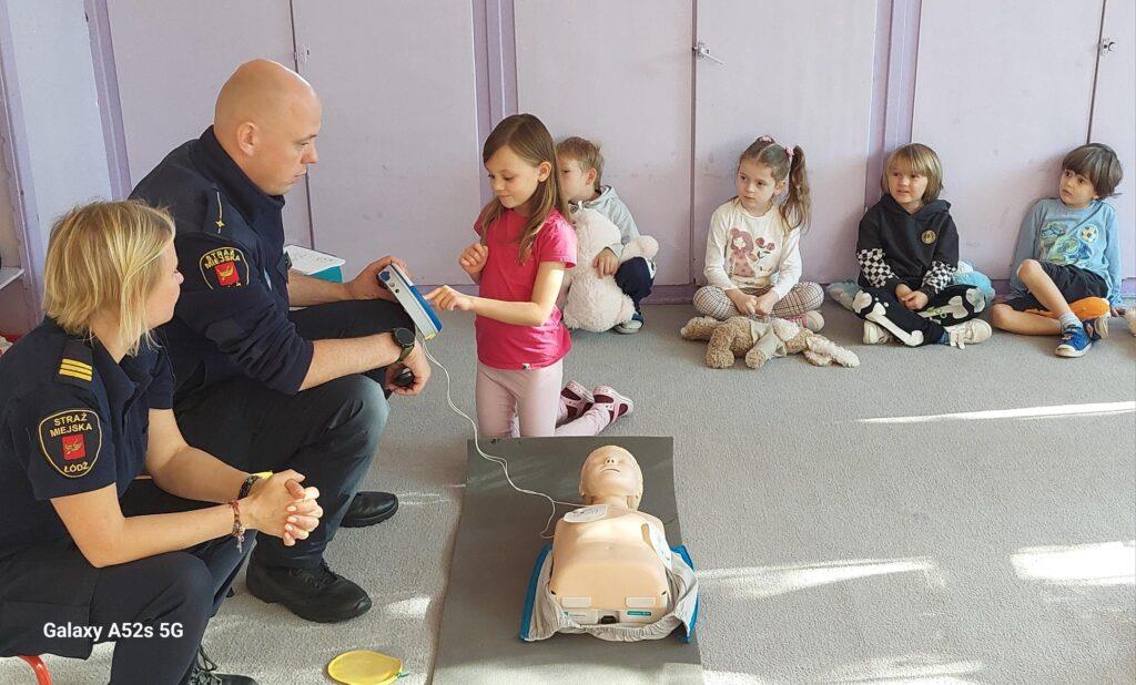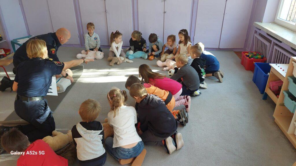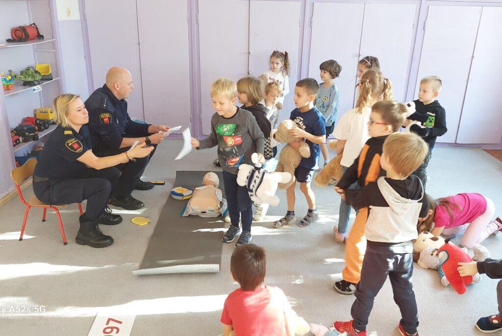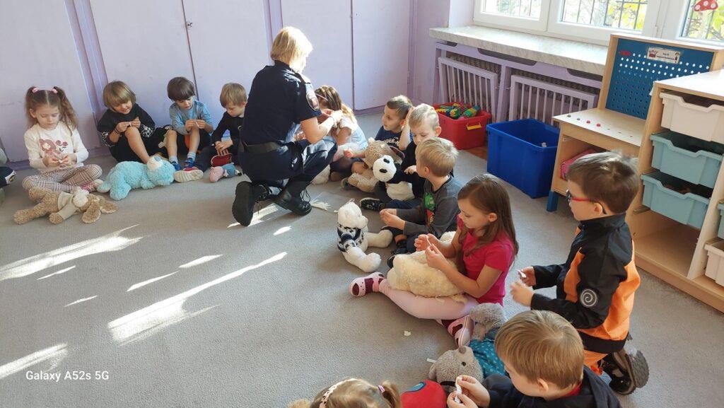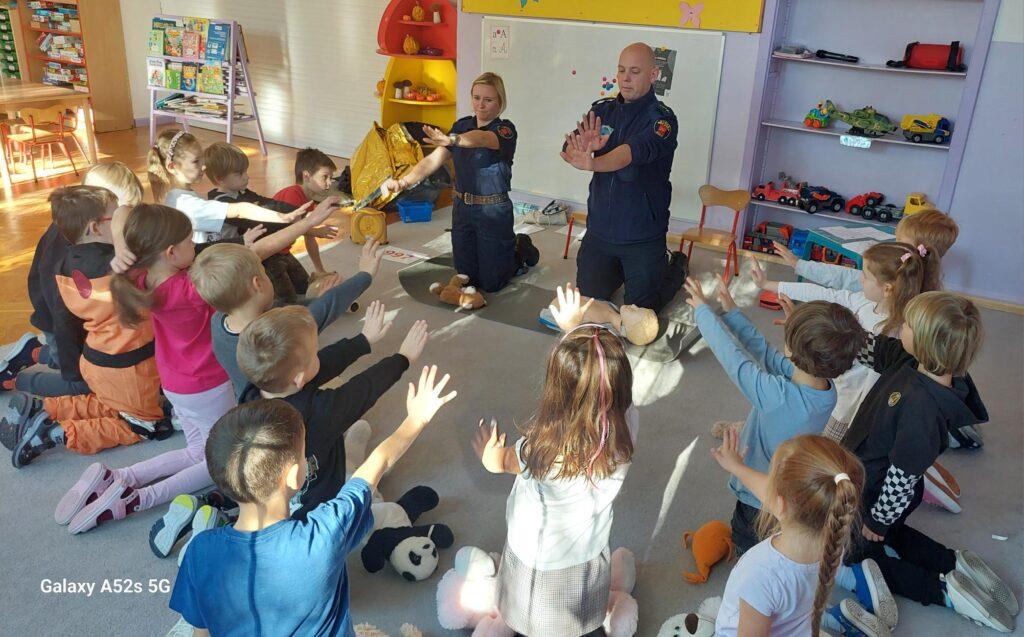 25 października to był dzień pełen wrażeń. Wszystkie Przedszkolaki w tym dniu uczestniczyły w warsztatach edukacyjnych „Wiem, potrafię, działam – AED” prowadzonych przez Funkcjonariuszy Straży Miejskiej. Na warsztatach dzieci utrwaliły numery alarmowe oraz sposób wzywania służb ratunkowych. Poznały także numer do Straży Miejskiej oraz pewną ciekawostkę z nim związaną. Przyniesionym w tym dniu misiom udzielały pierwszej pomocy oraz uczyły się zasad wykonywania resuscytacji krążeniowo-oddechowej. Najstarsza grupa zapoznała się również z występowaniem, zastosowaniem, obsługą i działaniem „AED”. Na zakończenie warsztatów dzieci otrzymały tematyczne kolorowanki. Przedszkolaki nie zapomniały o podziękowaniach i wykonały dla Funkcjonariuszy laurkę i książeczkę pamiątkową. Dziękujemy za ogrom praktycznej wiedzy i owocnie spędzony czas?.