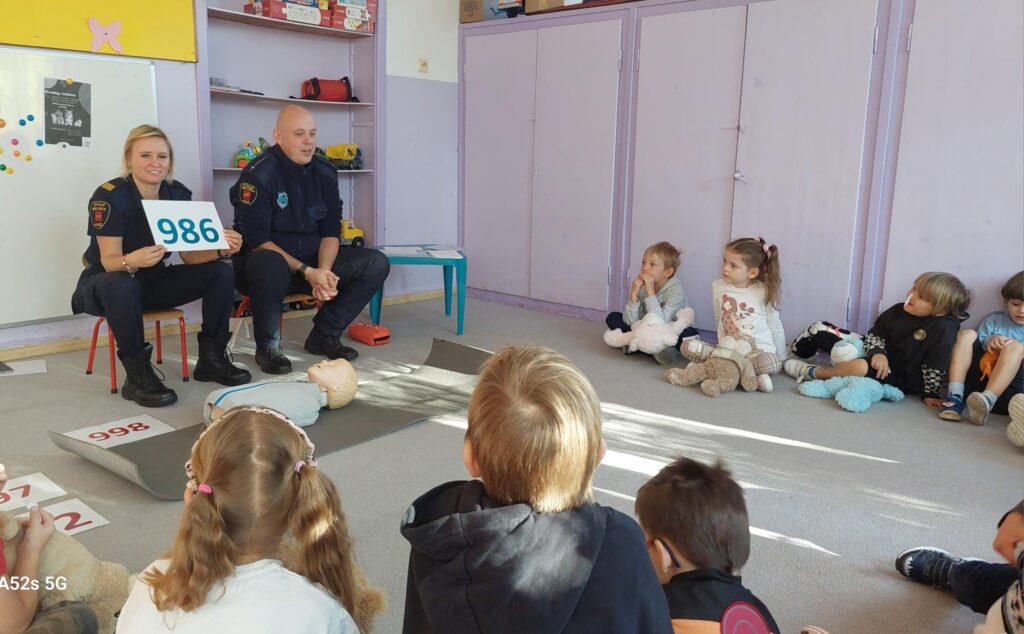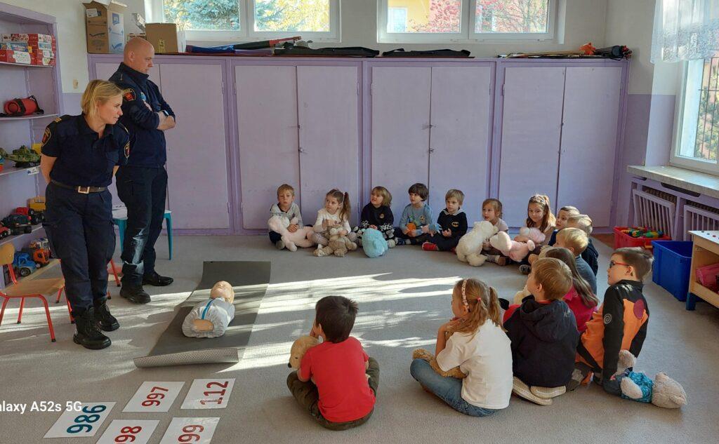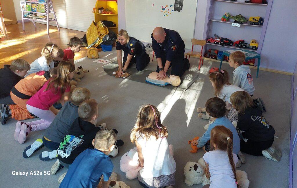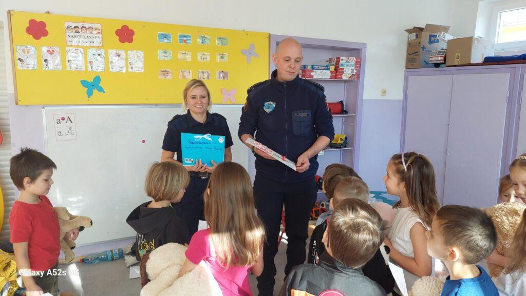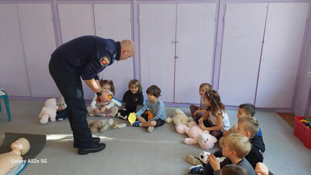 25 października to był dzień pełen wrażeń. Wszystkie Przedszkolaki w tym dniu uczestniczyły w warsztatach edukacyjnych „Wiem, potrafię, działam – AED” prowadzonych przez Funkcjonariuszy Straży Miejskiej. Na warsztatach dzieci utrwaliły numery alarmowe oraz sposób wzywania służb ratunkowych. Poznały także numer do Straży Miejskiej oraz pewną ciekawostkę z nim związaną. Przyniesionym w tym dniu misiom udzielały pierwszej pomocy oraz uczyły się zasad wykonywania resuscytacji krążeniowo-oddechowej. Najstarsza grupa zapoznała się również z występowaniem, zastosowaniem, obsługą i działaniem „AED”. Na zakończenie warsztatów dzieci otrzymały tematyczne kolorowanki. Przedszkolaki nie zapomniały o podziękowaniach i wykonały dla Funkcjonariuszy laurkę i książeczkę pamiątkową. Dziękujemy za ogrom praktycznej wiedzy i owocnie spędzony czas?.