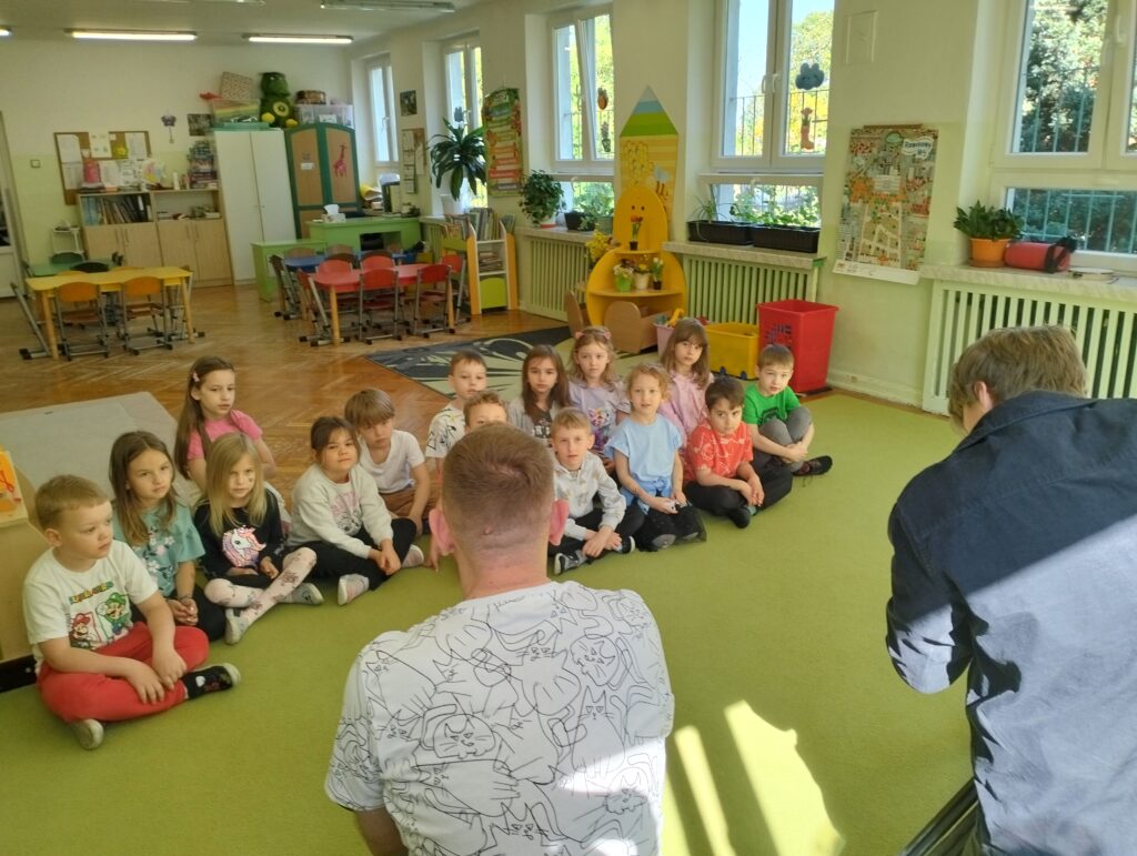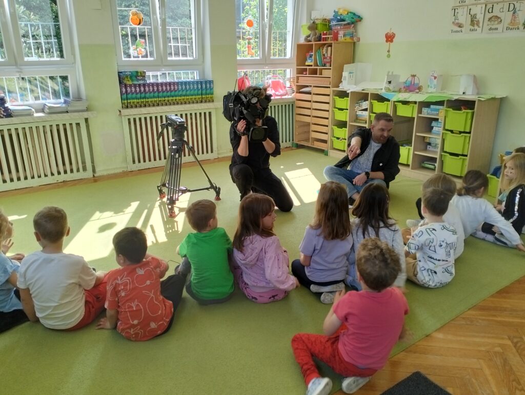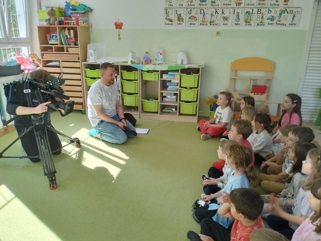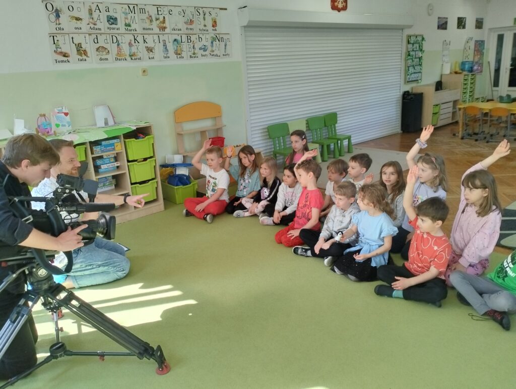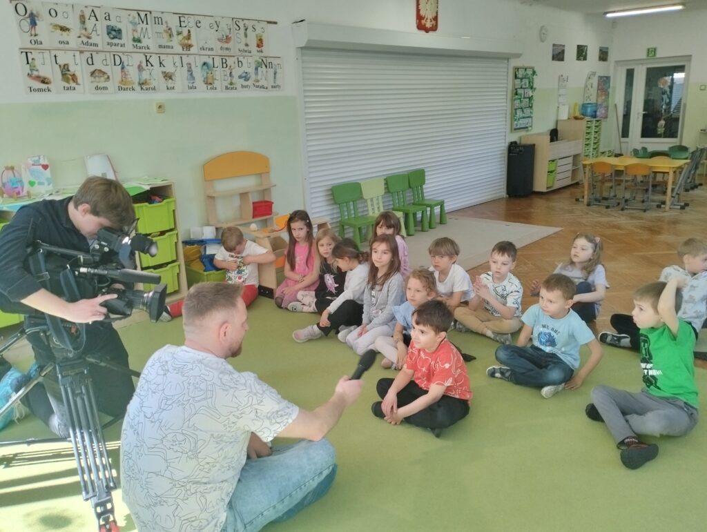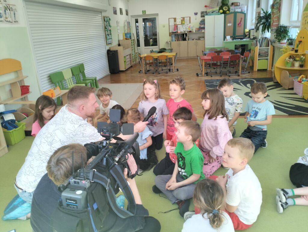 W środę 21 maja dzieci z grupy Wiewiórek odwiedzili autorzy nowego programu telewizyjnego ,,Zapraszamy do nas” emitowanego w stacji TVP3. Pan Michał zadawał dzieciom pytania dotyczące zwierząt. Z początku przedszkolaki onieśmielał widok kamery, ale dość szybko przyzwyczaiły się do nowej sytuacji i chętnie odpowiadały na zadawane im pytania. Naszym Gościom tak spodobały się wypowiedzi dzieci, że obiecali nam kolejne nagrania.