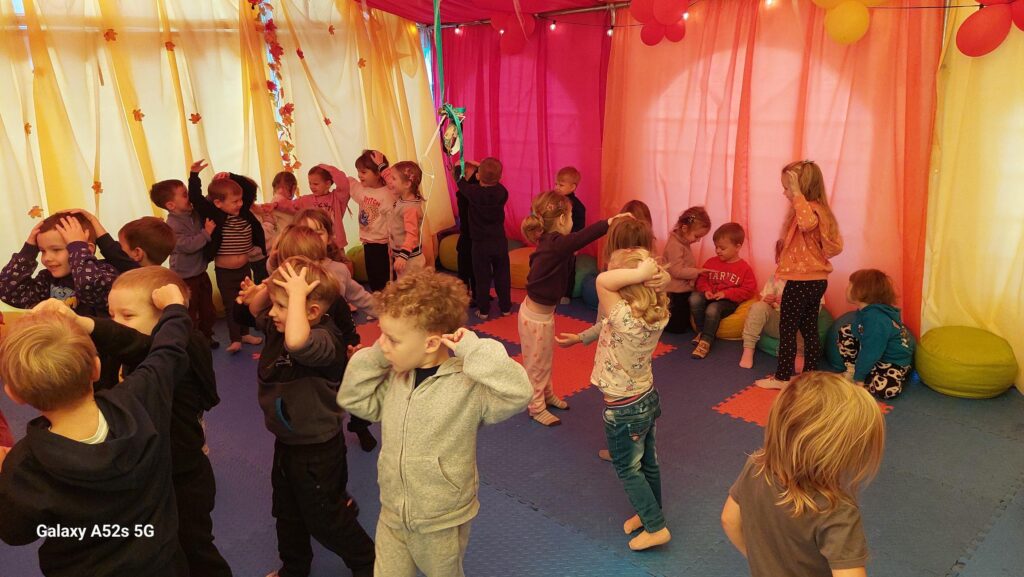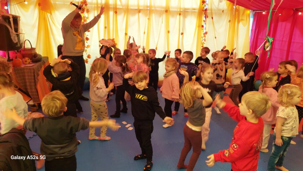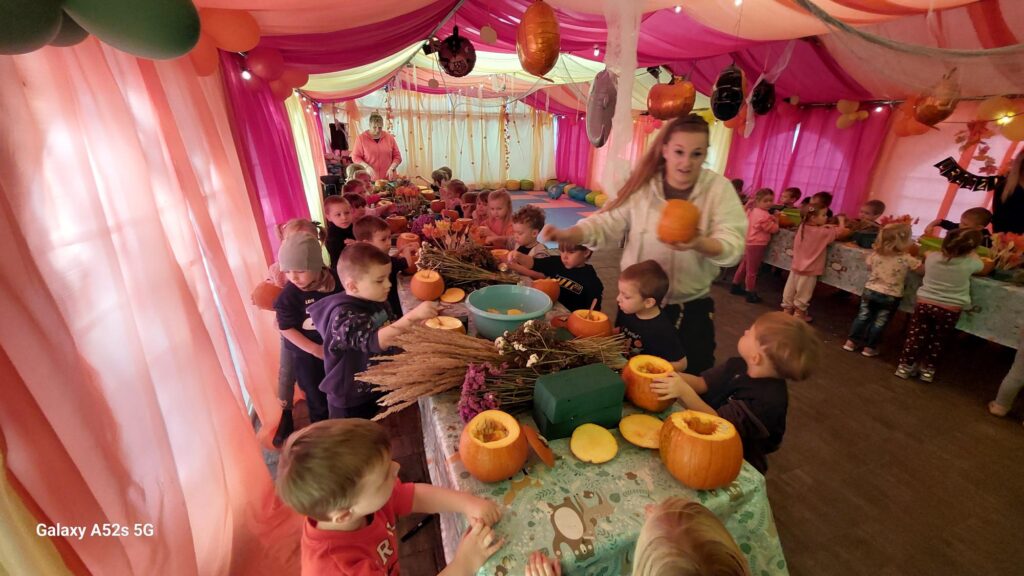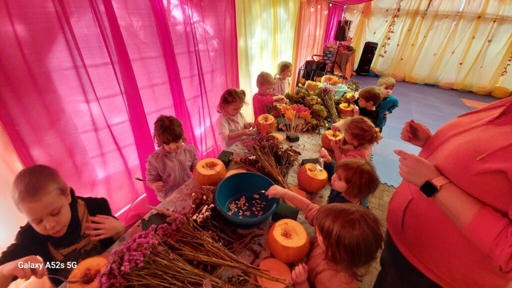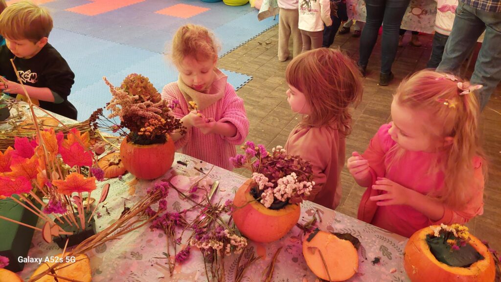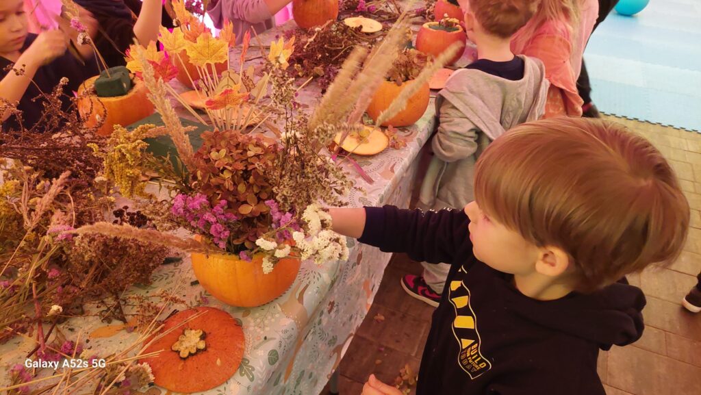 Na jesienne, kreatywne warsztaty z dynią dzieci z grup: Żabki i Biedronki wybrały się na wycieczkę do „Leśnej Zagrody Gadów” w Rosanowie. Po przyjeździe czekała na nas „Pani Jesień”, która przywitała nas tematycznymi zabawami. Były jesienne zagadki, tańce i konkurencie. Po wspólnych zabawach przystąpiliśmy do działań z dynią. Czekało na nas drążenie dyni, a następnie tworzenie własnych kompozycji z suszonych kwiatów. Bawiliśmy się wspaniale tworząc bukiety dla naszych najbliższych.