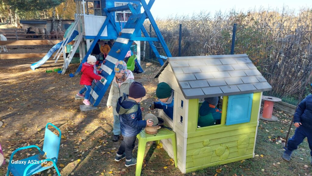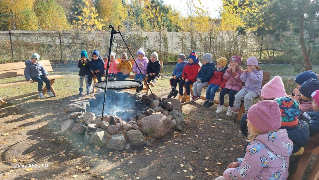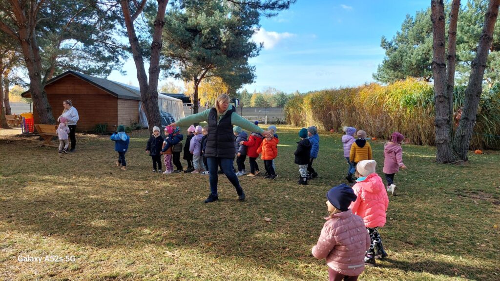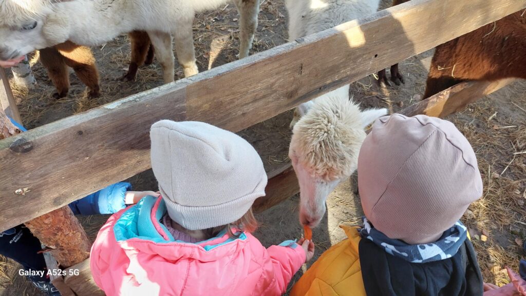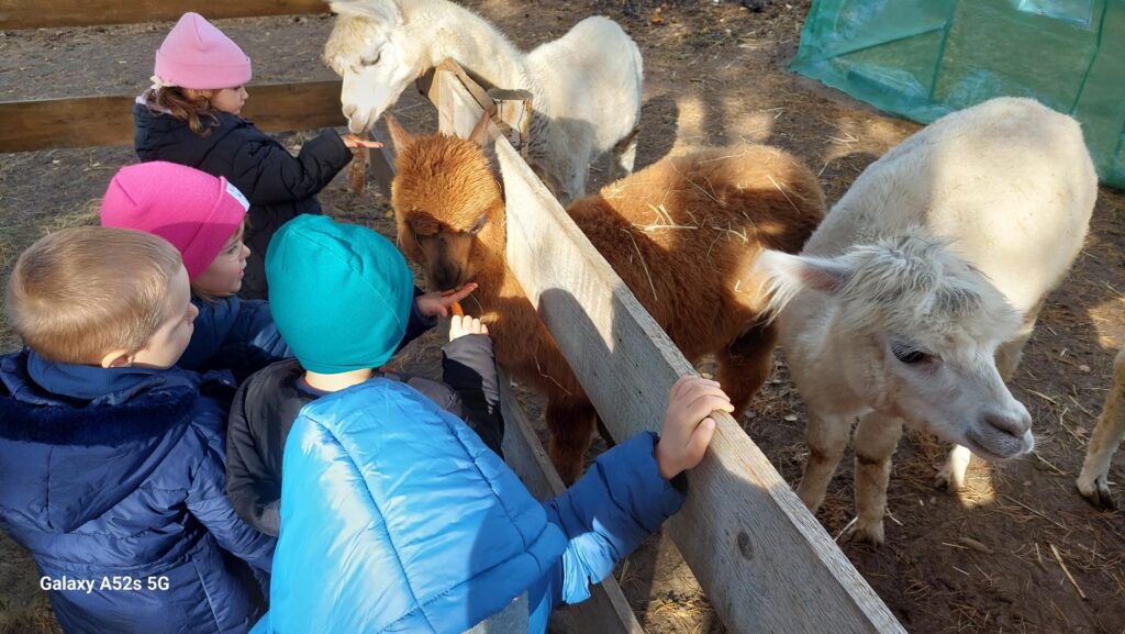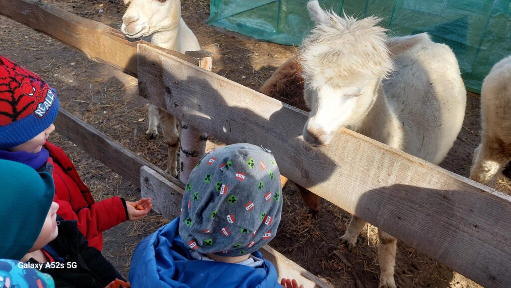 Po kreatywnej pracy, posililiśmy się śniadankiem i udaliśmy się do zagrody z alpakami i zabaw w plenerze. Karmiliśmy je marchewką mogąc poobserwować je z bliska. Na zakończenie czekało na nas ognisko, gdzie mogliśmy odpocząć i degustować smakołyki z ogniska. Czas spędzony w „Leśnej Zagrodzie” obfitował w radość, śmiech i twórczą zabawę. Był to dzień pełen pozytywnych emocji, współpracy i jesiennej atmosfery.