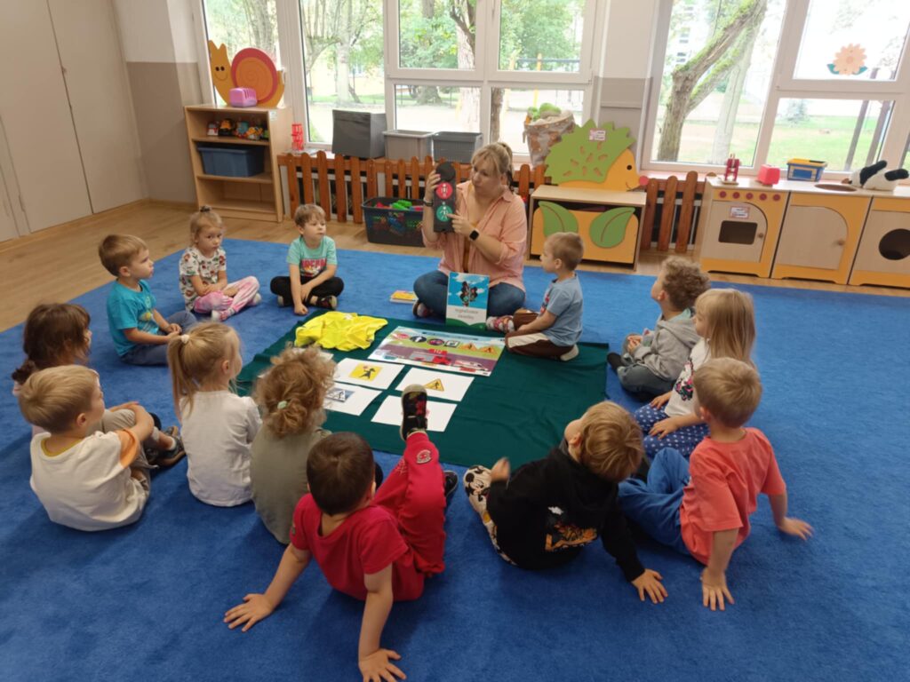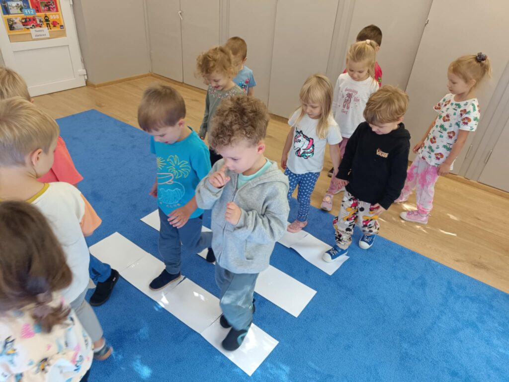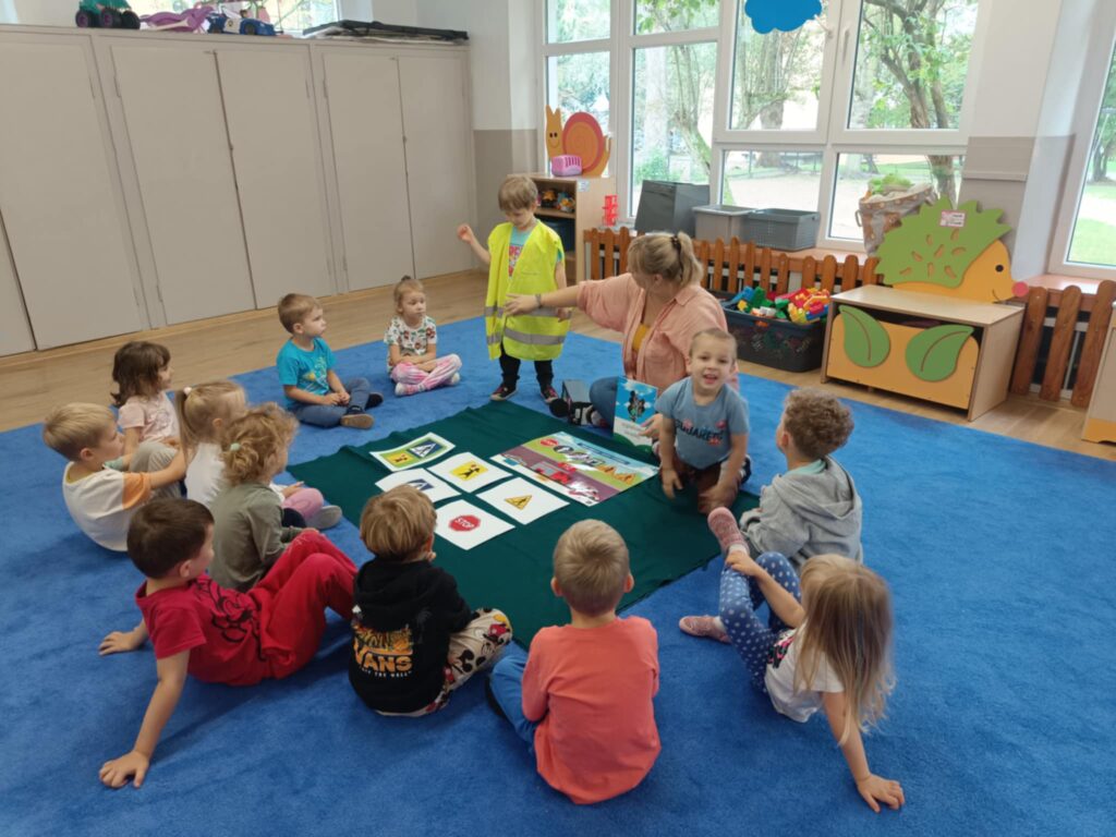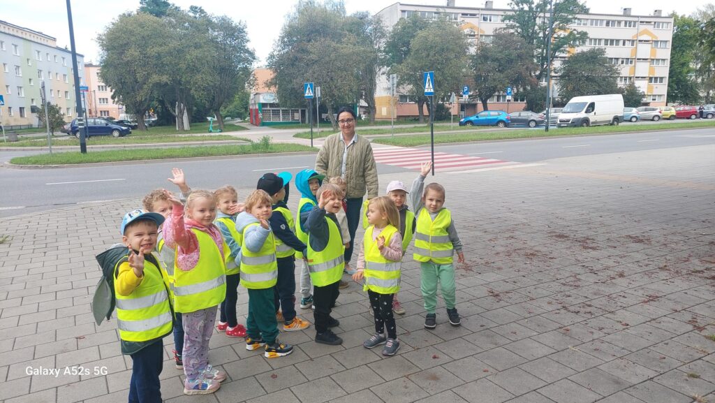 W ramach zajęć dotyczących kodeksu przedszkolaka i bezpieczeństwa utrwalaliśmy zasady zgodnego i odpowiedzialnego funkcjonowania w grupie oraz zdobywaliśmy podstawowe umiejętności potrzebne do ostrożnego uczestniczenia w ruchu drogowym. W celu wykorzystania zdobytej wiedzy z zakresu bezpieczeństwa w ruchu drogowym wybraliśmy się na pobliskie skrzyżowanie, aby w praktyczny sposób przećwiczyć przechodzenie przez jezdnię oraz właściwe zachowanie na chodniku w czasie spaceru.