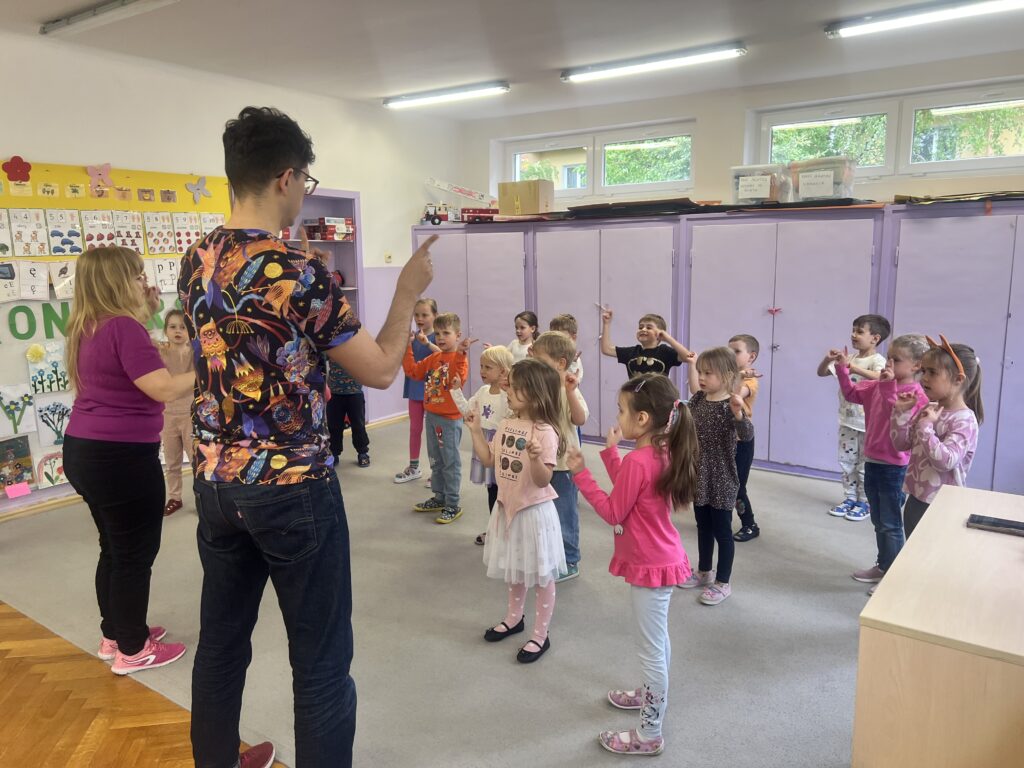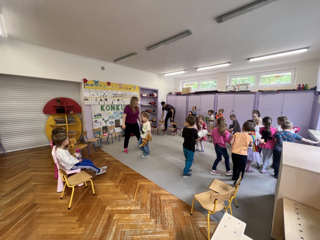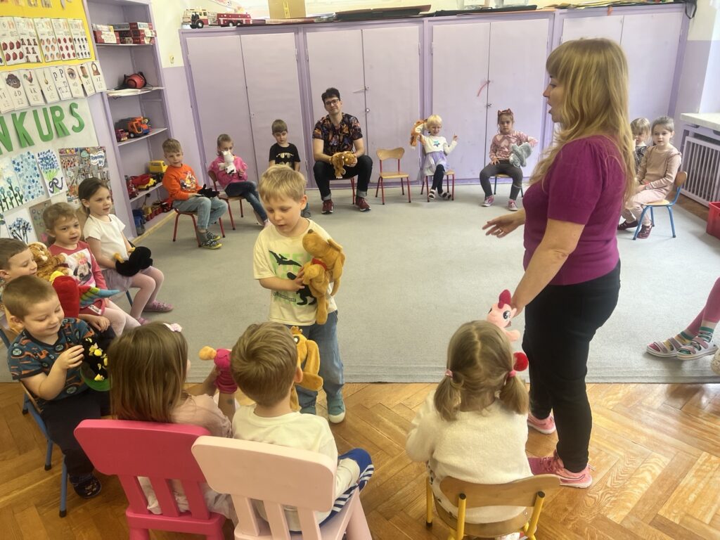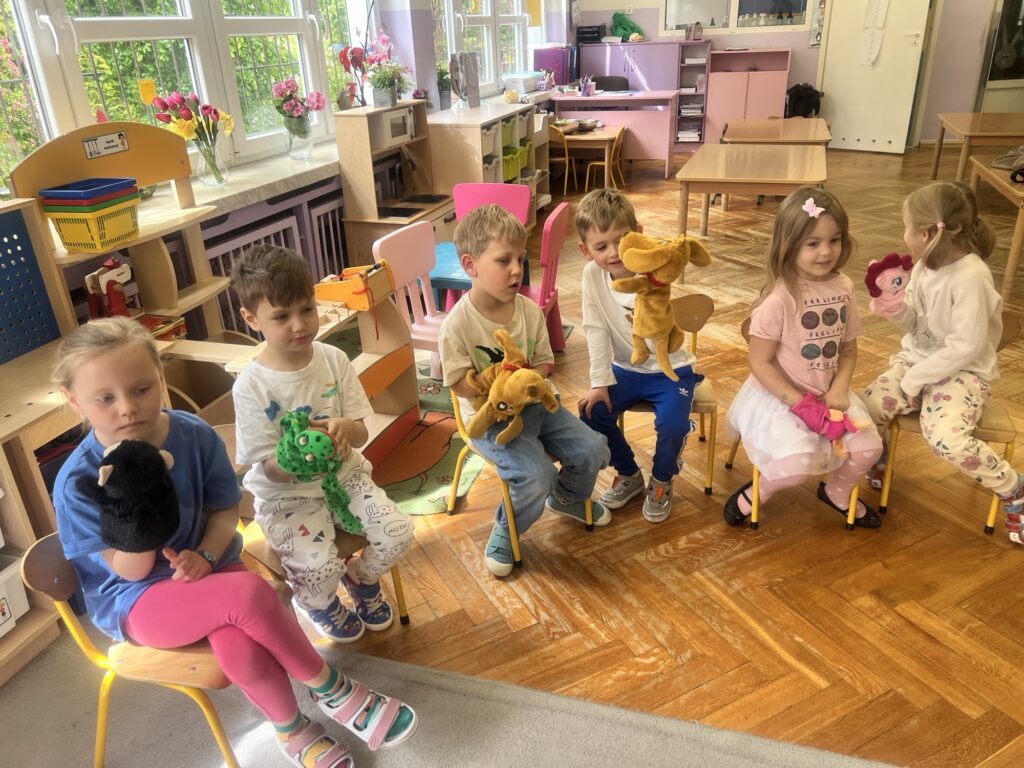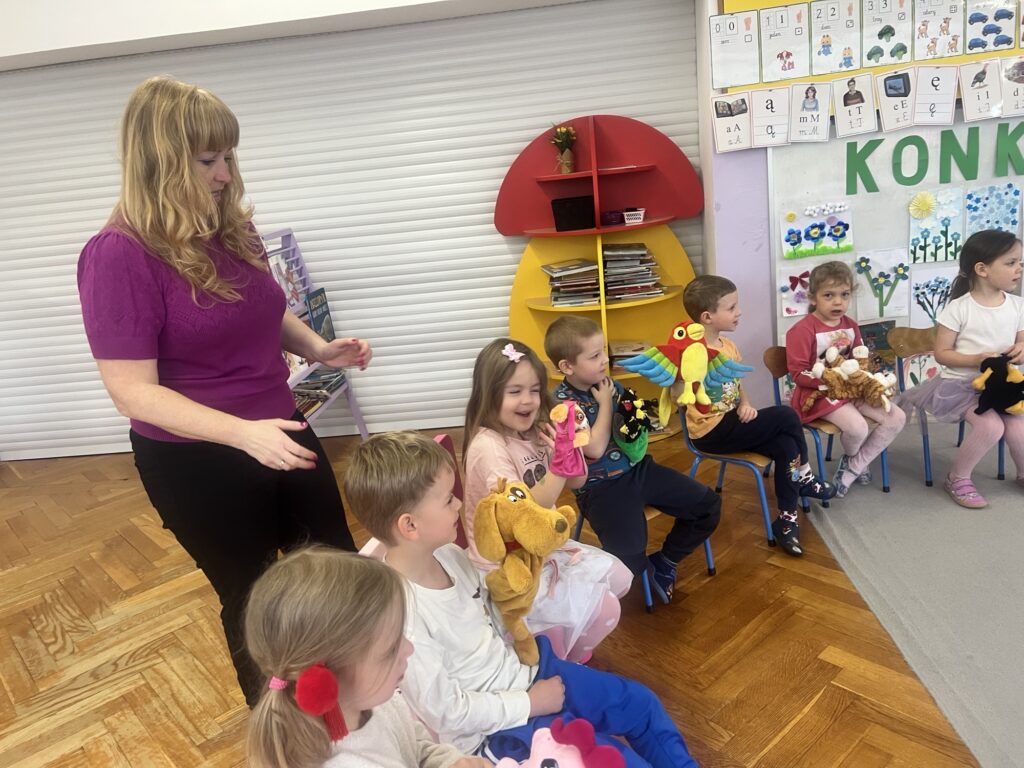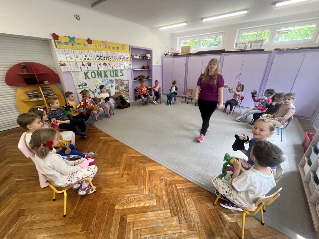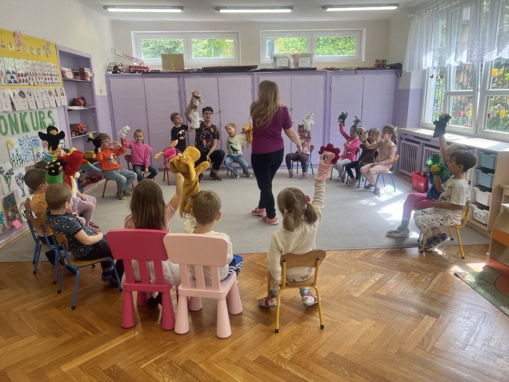 Do grupy Zajączków przyjechali goście, dzięki którym wzięliśmy udział w warsztatach teatralnych. Każde dziecko miało okazję wcielić się w jakąś rolę poprzez pacynki. Wspólnie odegraliśmy przedstawienie pt. „Zepsuty zegar”.